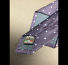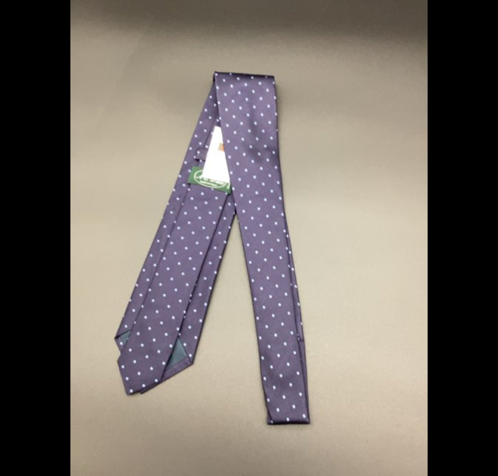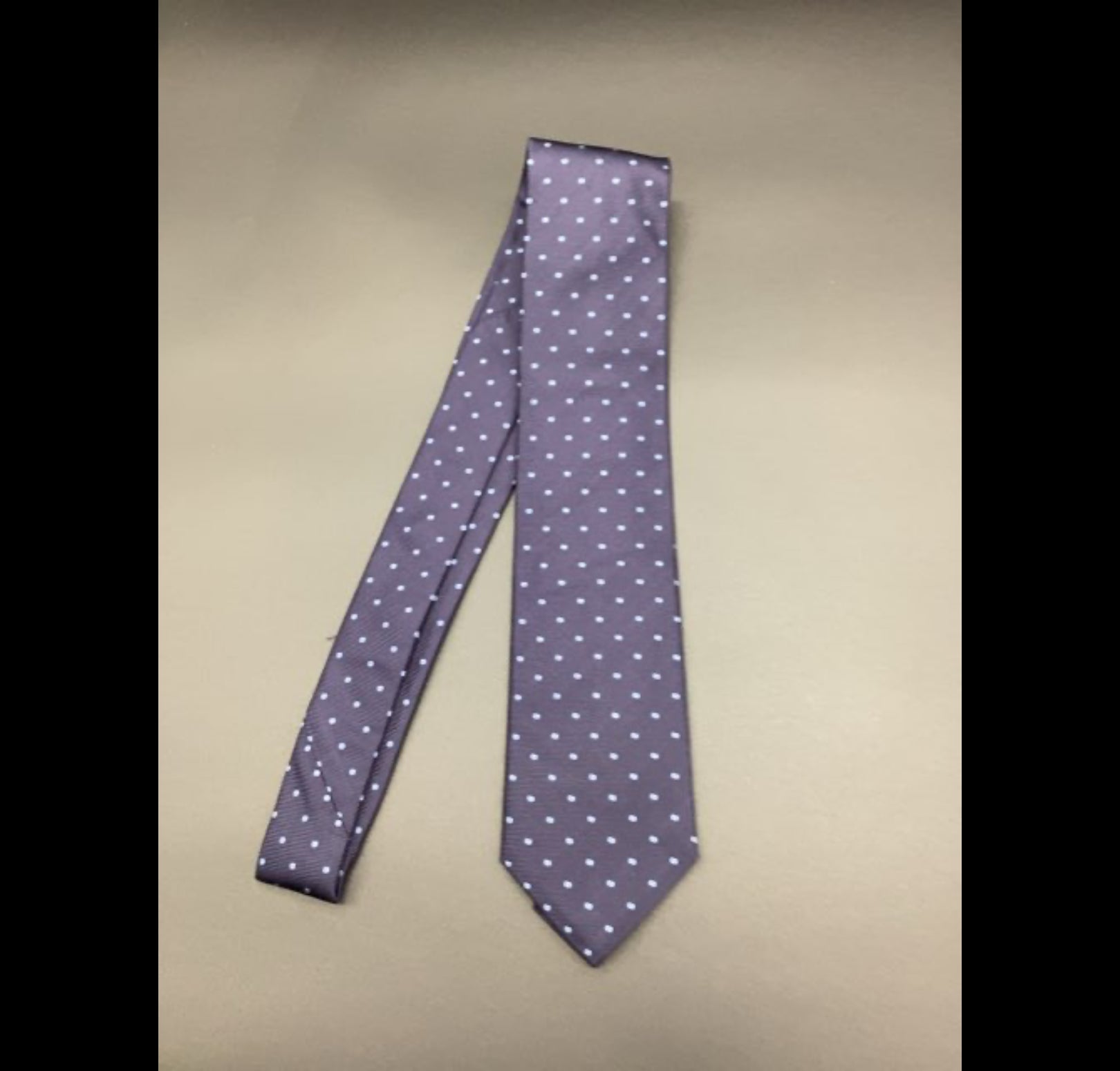 H342 Slipsen er lavet af glat stof med en lilla mørkeblå og lyseblå prikker.100% silke