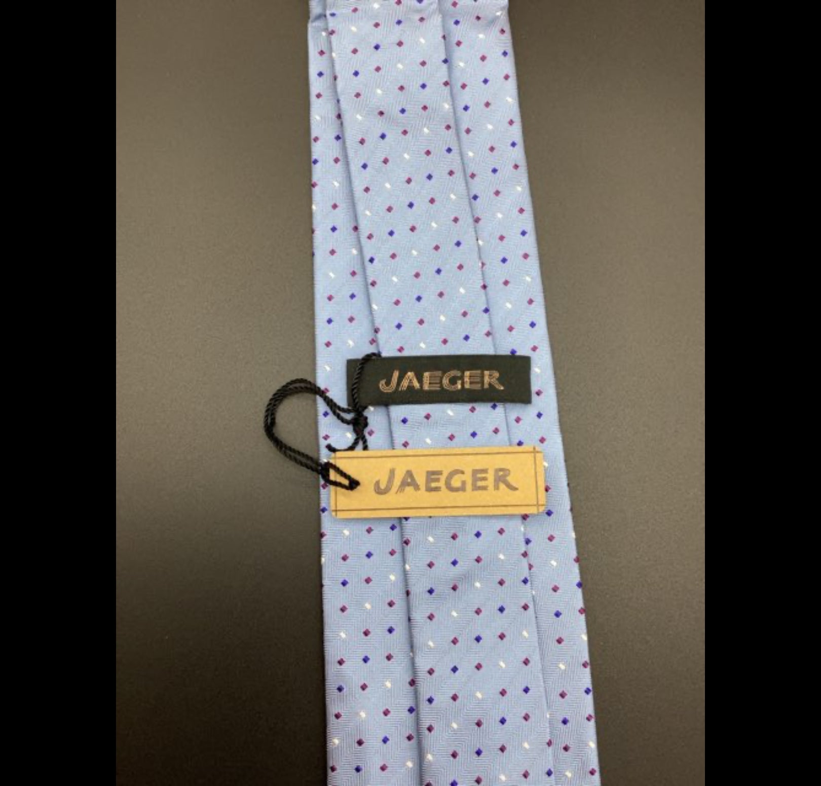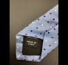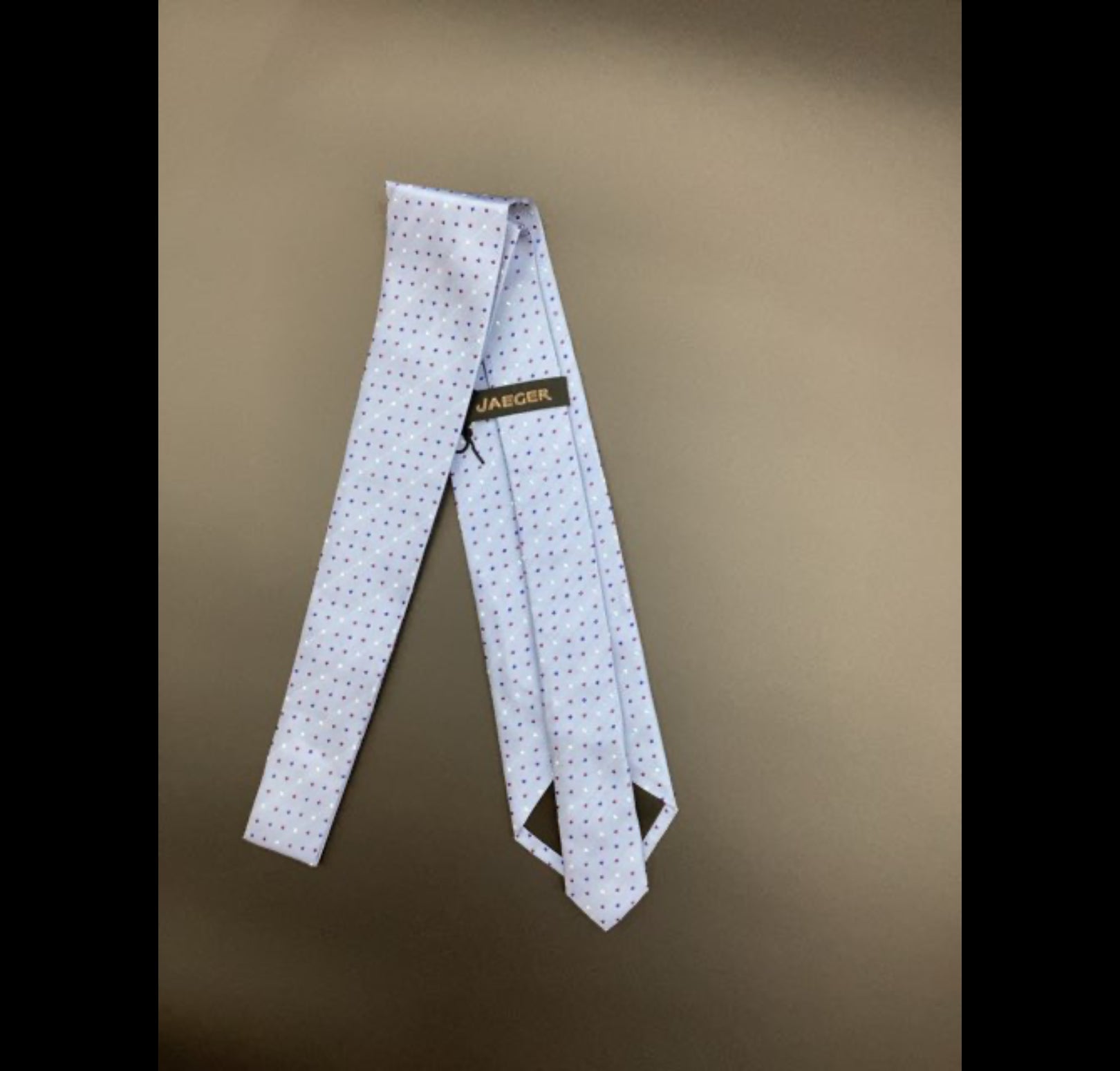 H348 Slipsen er lyseblå med små røde, hvide og blå prikker. Den er lavet af 100% silke.