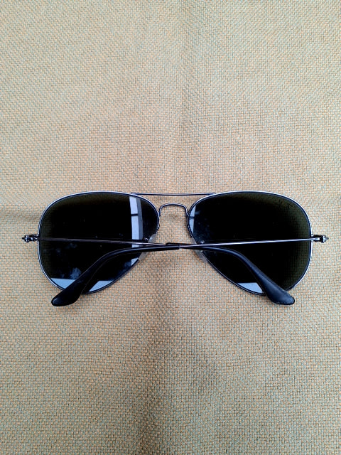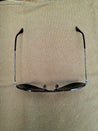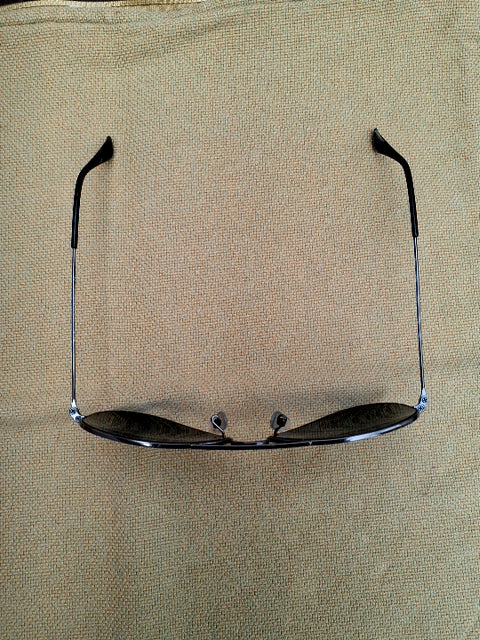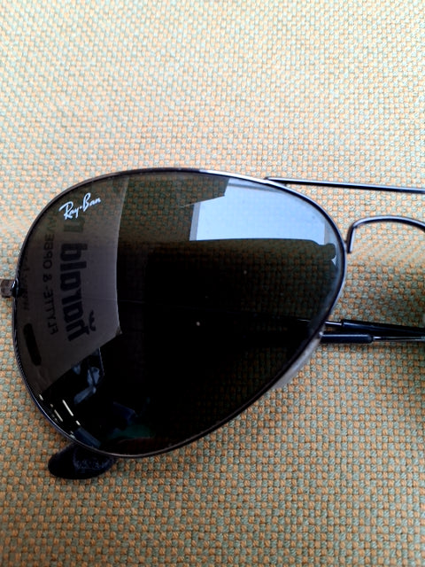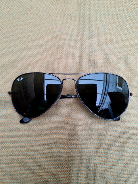 De ikoniske Ray-Ban solbriller er 14 cm brede. De har et lille nøk på det ene glas, men er ellers velholdte.
