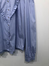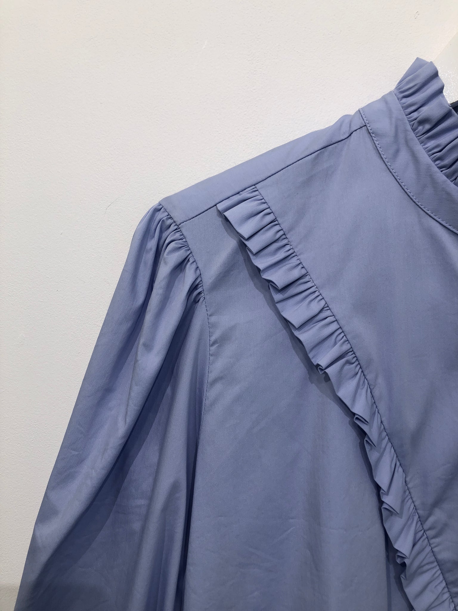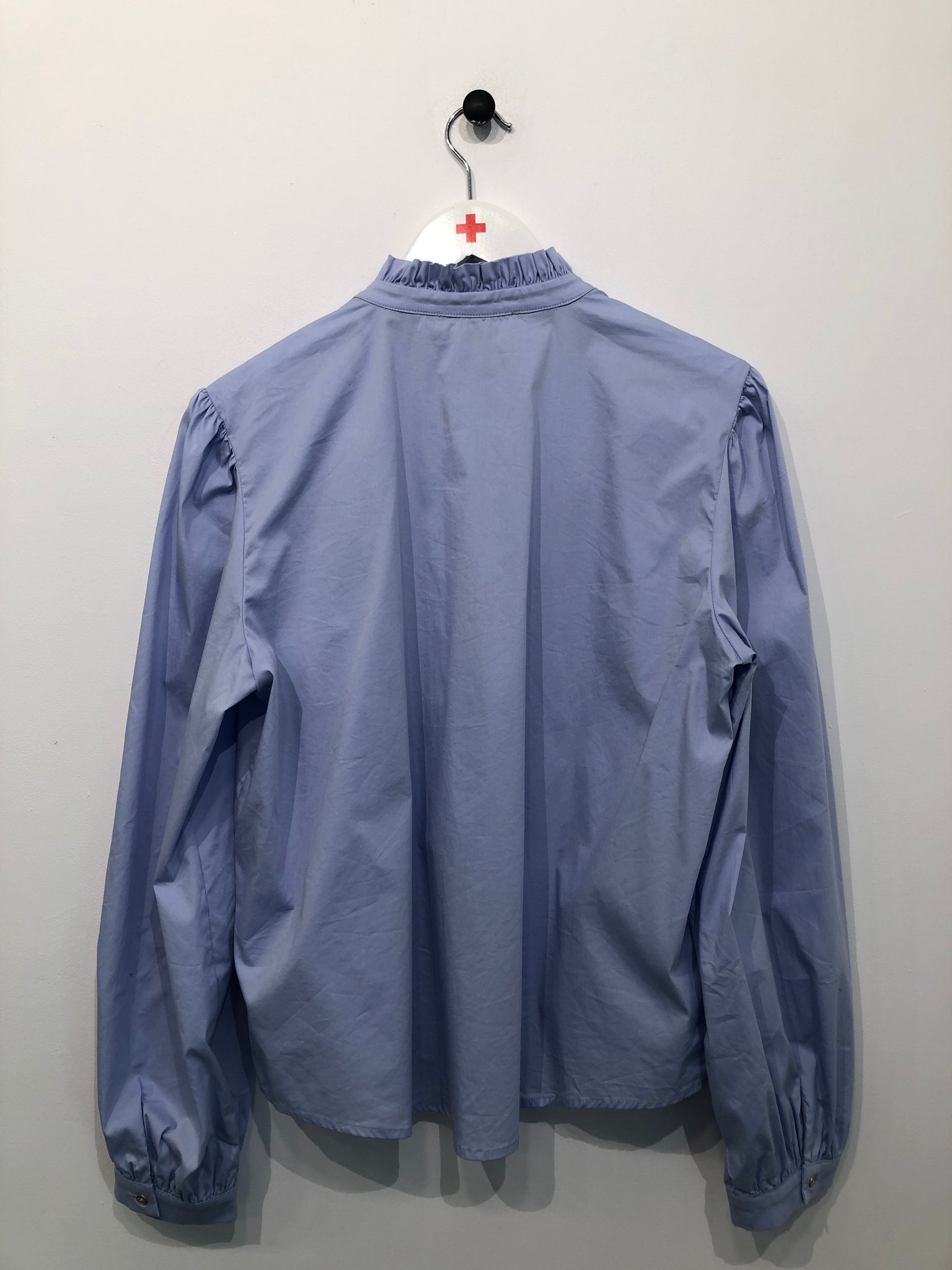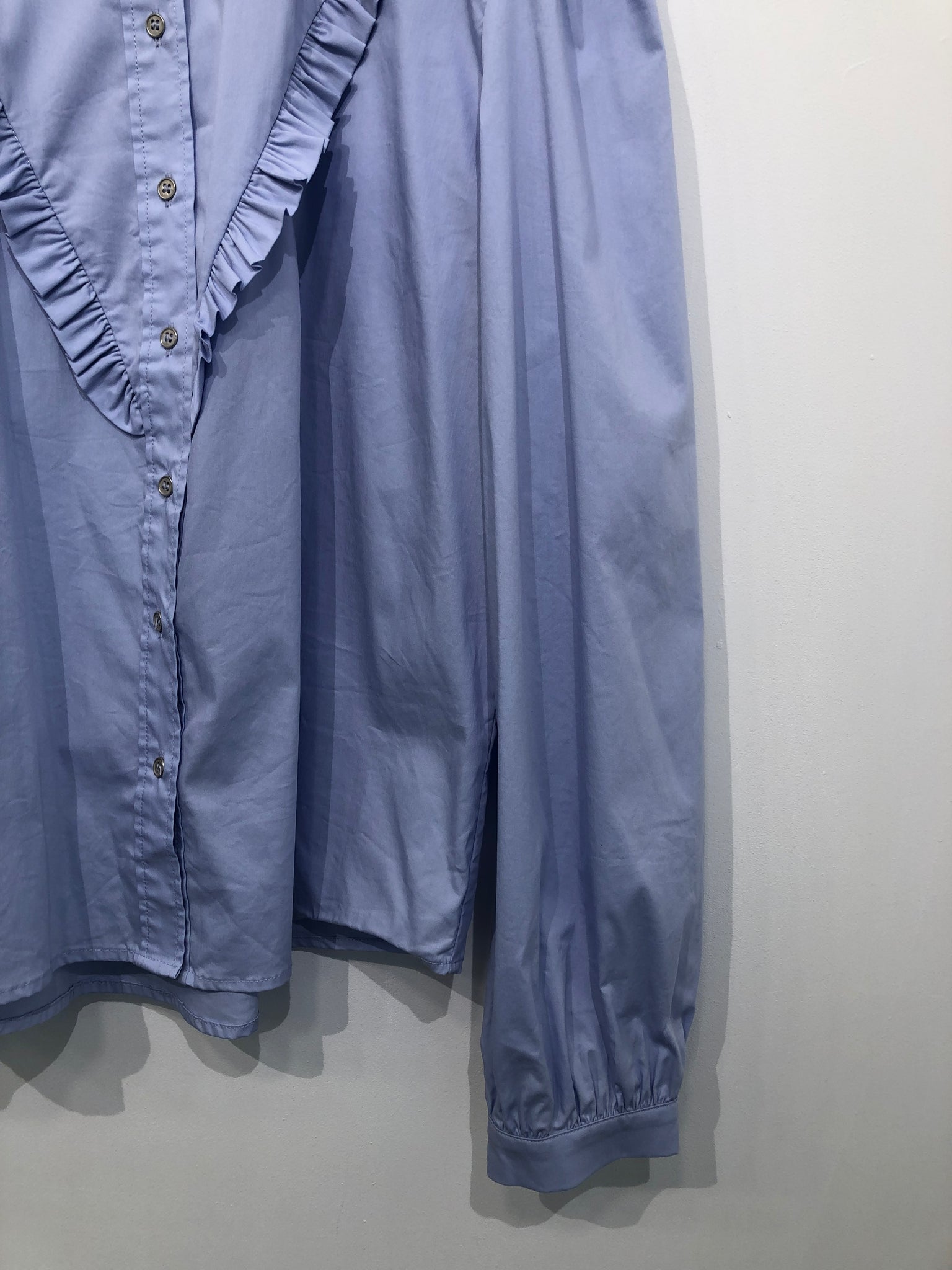 Feminin skjorte med flæser på front og krave. Små læg ved skuldre og ærmekanter. Skjorten har knaplukning hele vejen ned og er med lange ærmer.