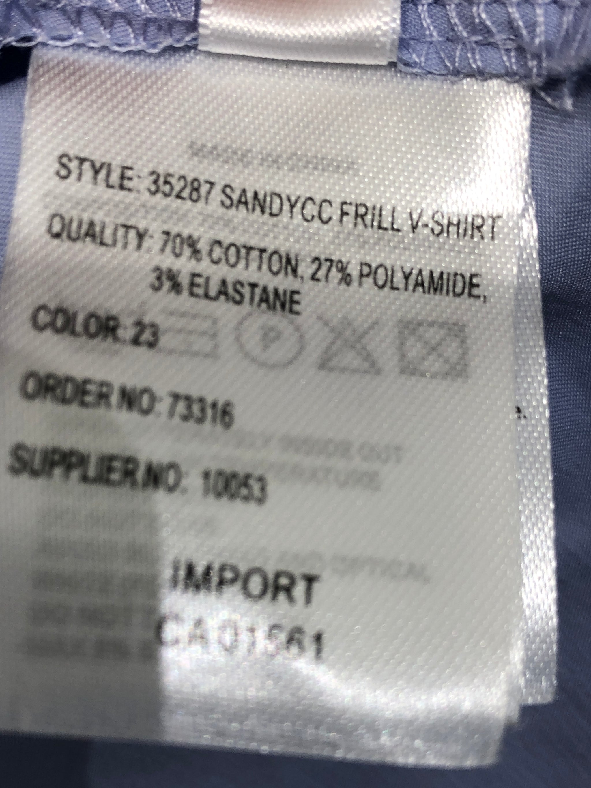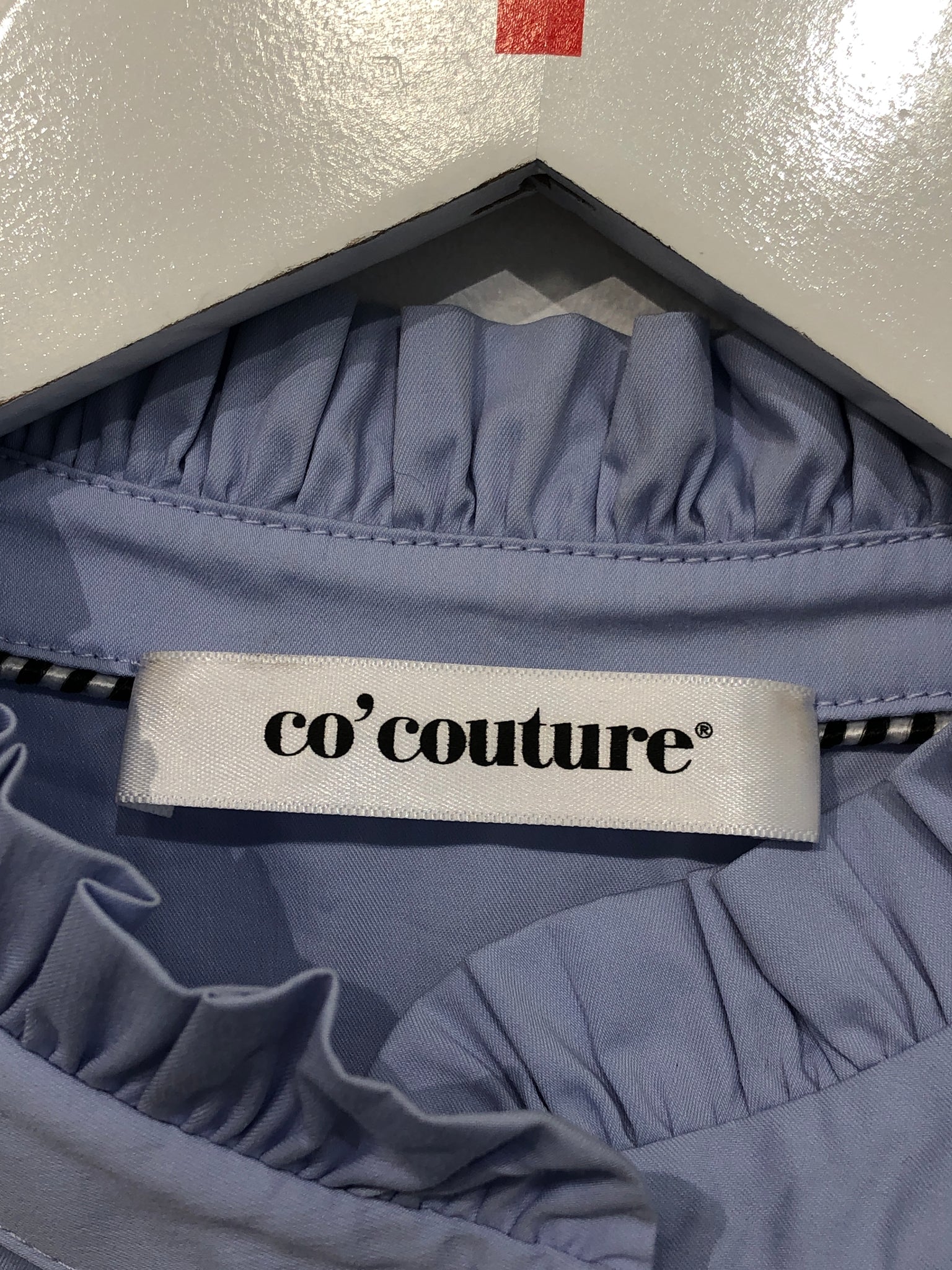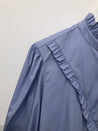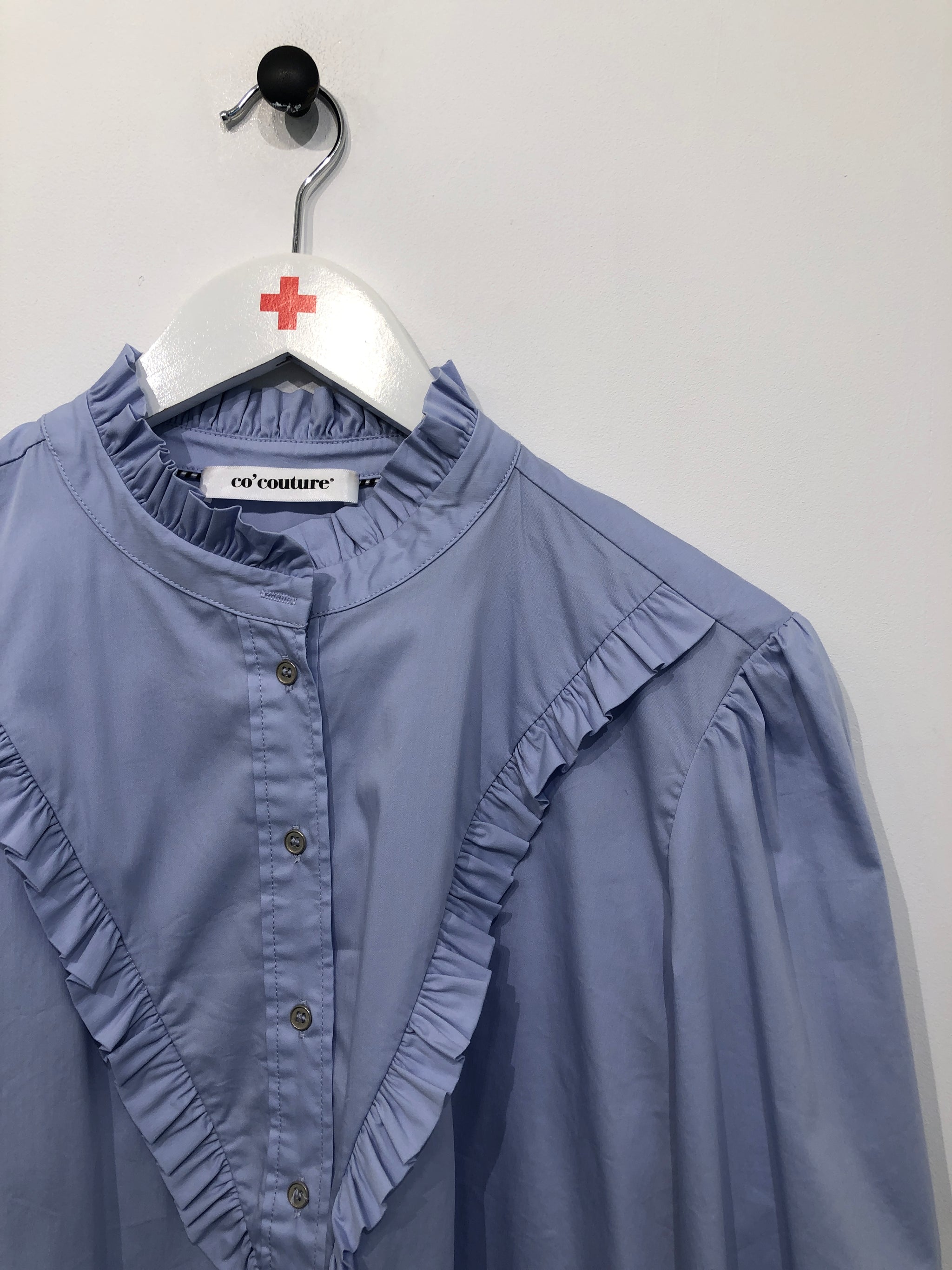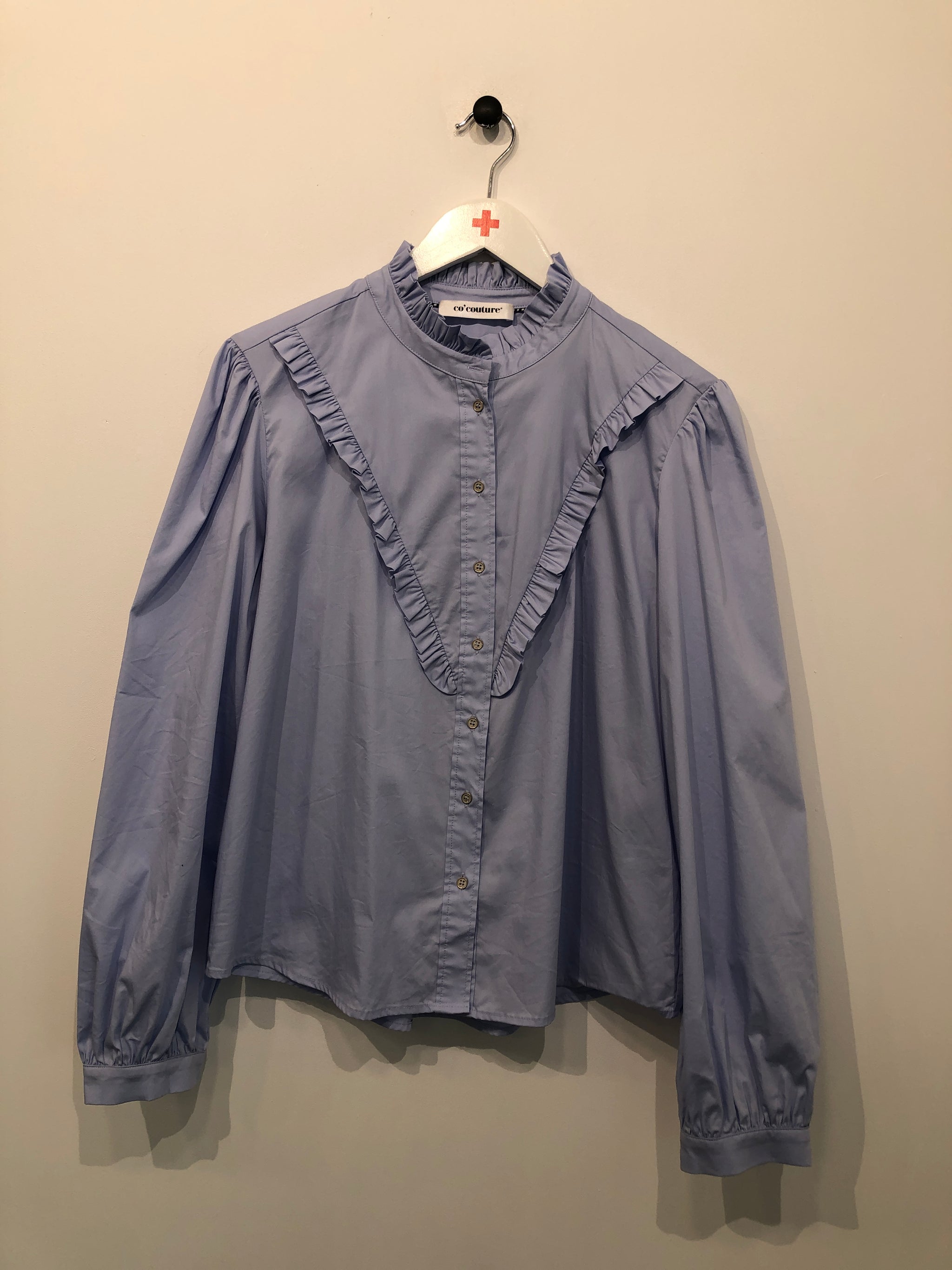 Feminin skjorte med flæser på front og krave. Små læg ved skuldre og ærmekanter. Skjorten har knaplukning hele vejen ned og er med lange ærmer.