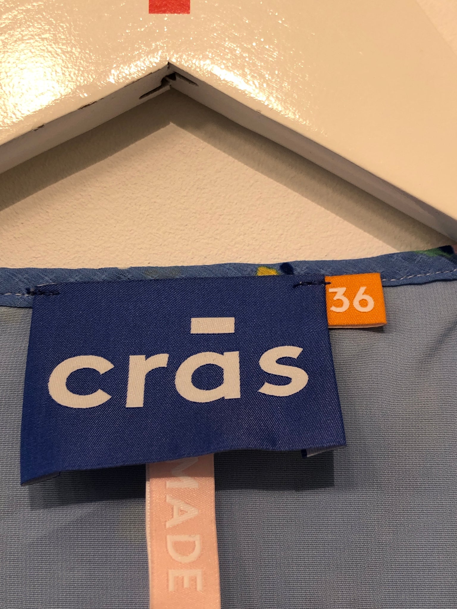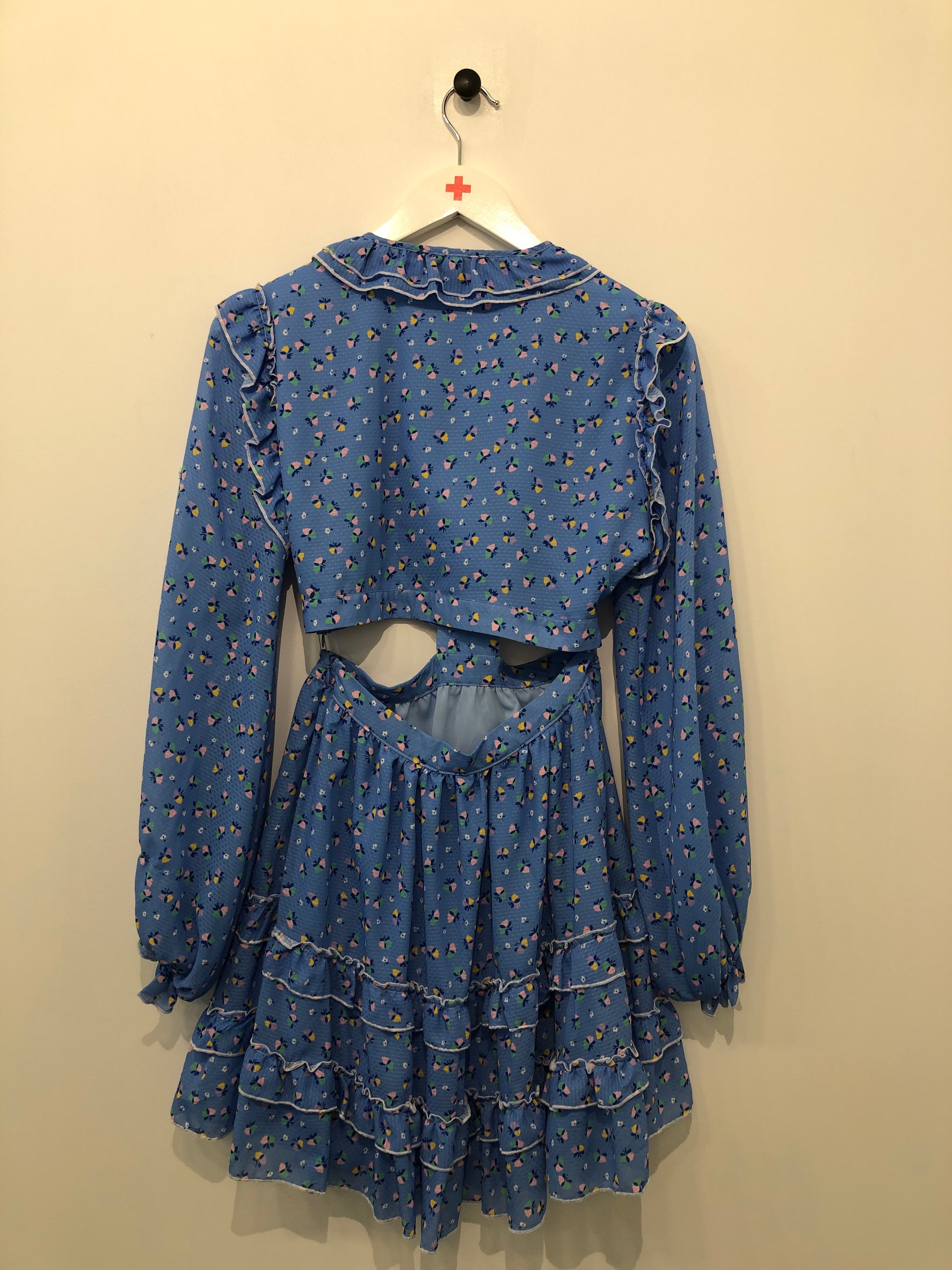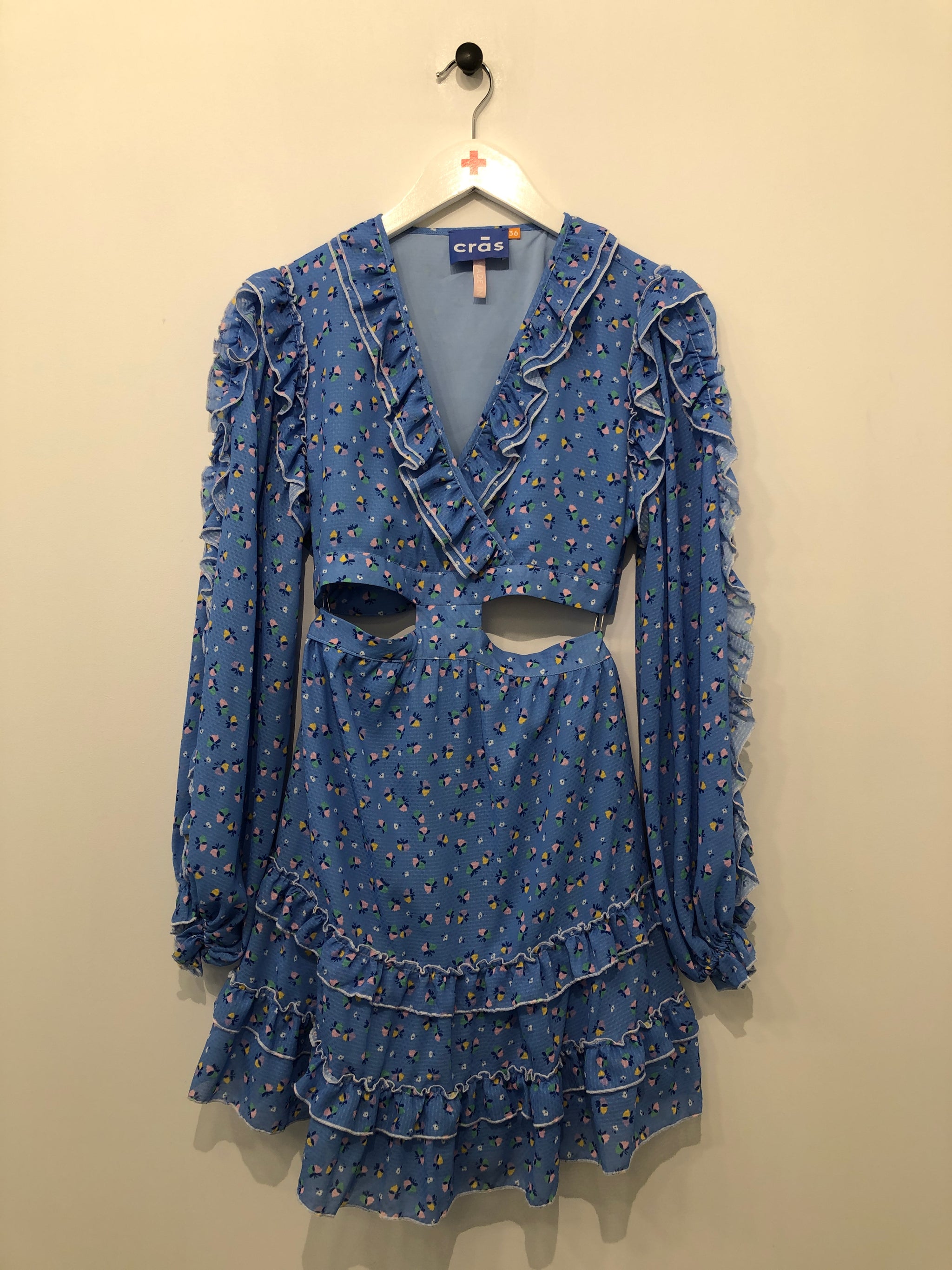 Finurlig kjole af mærket Cras med åbninger ved taljen og lænden, og ruflede kanter ved brystet og ned ad ærmerne.