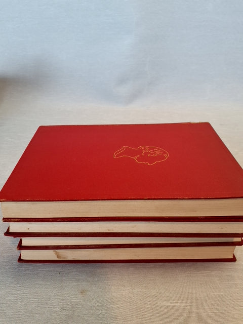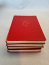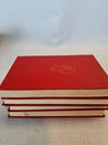 Bogen har en rød, læderindbundet omslag med guldpræget tekst og dekorationer.