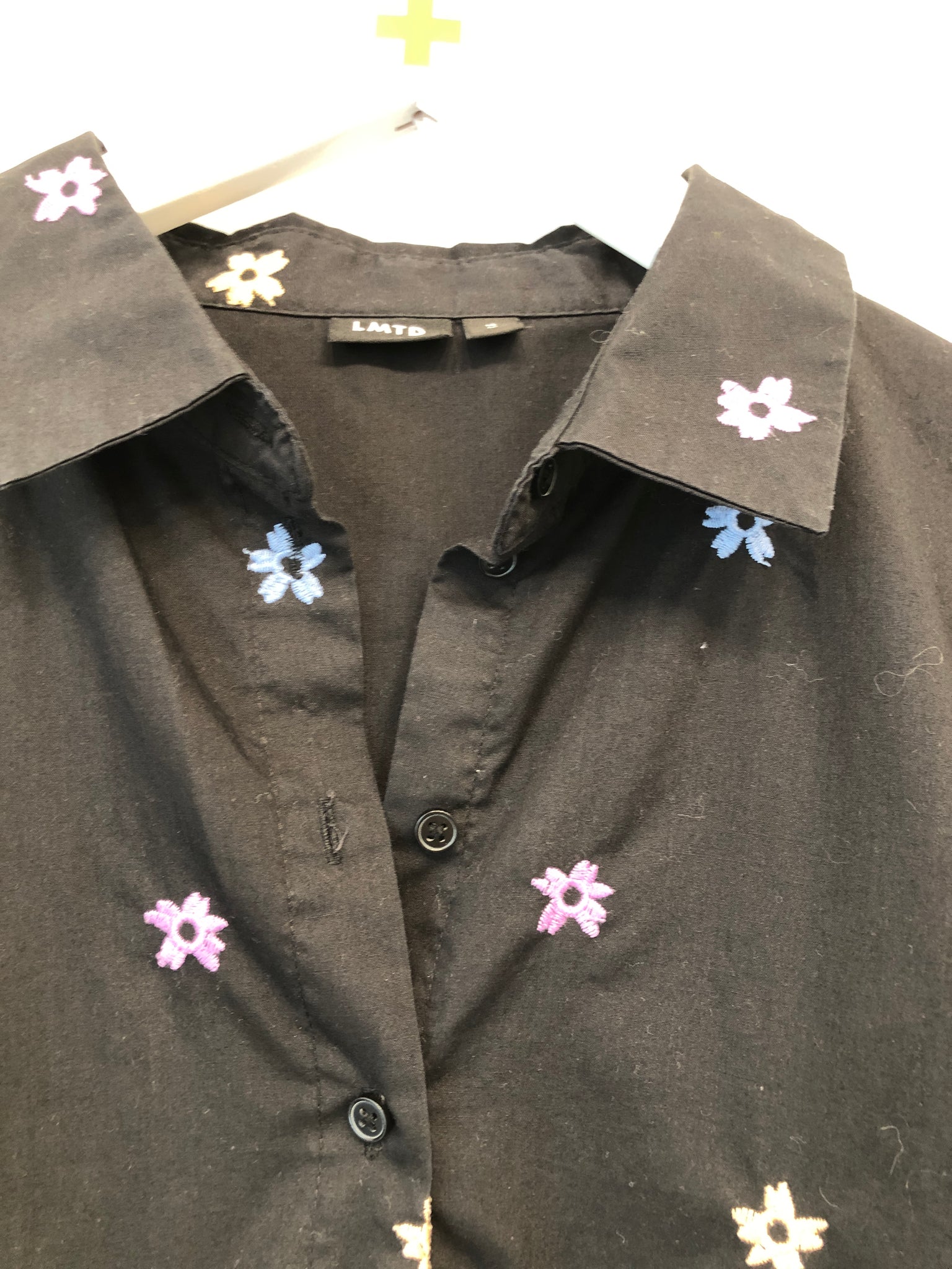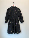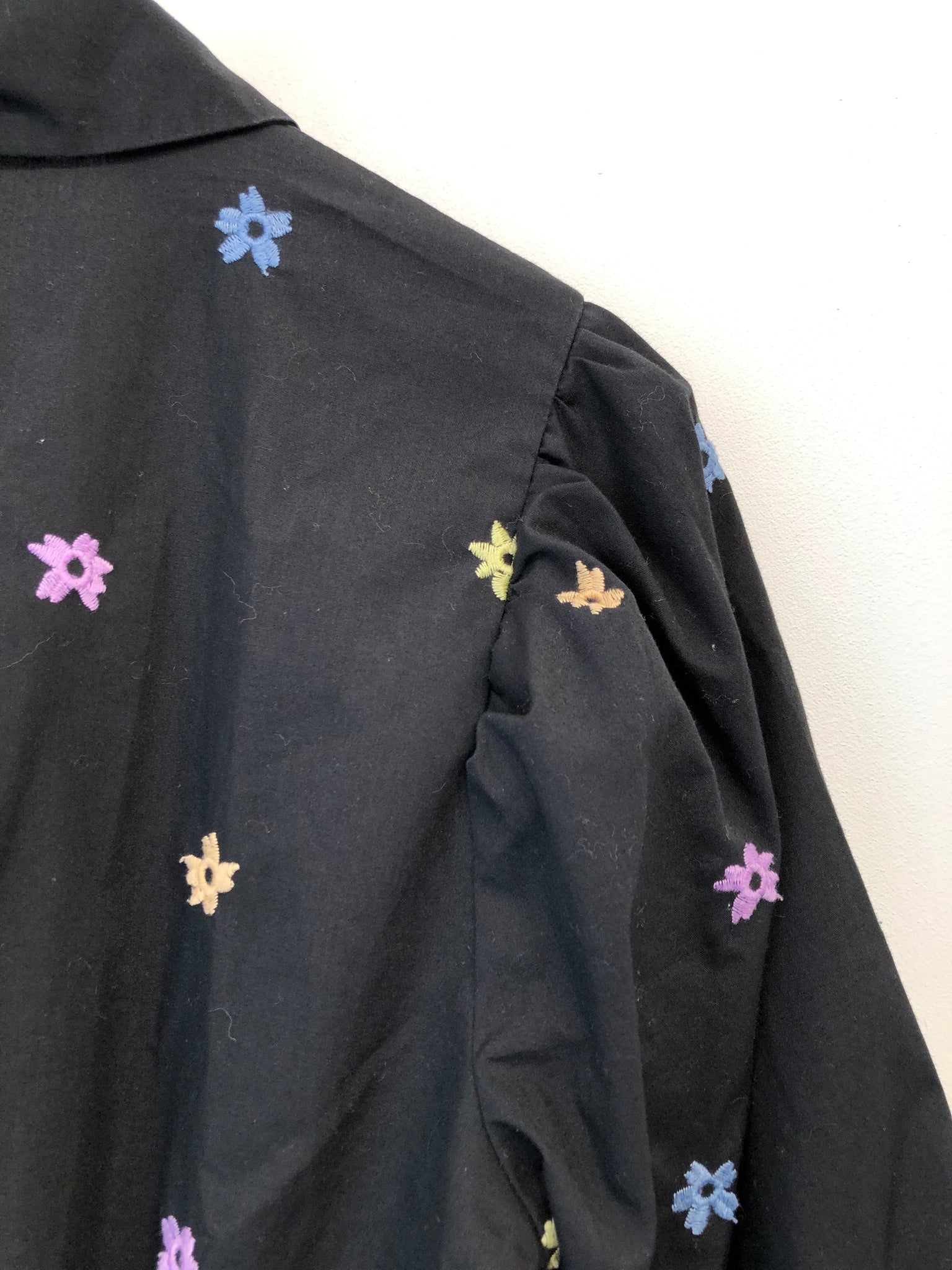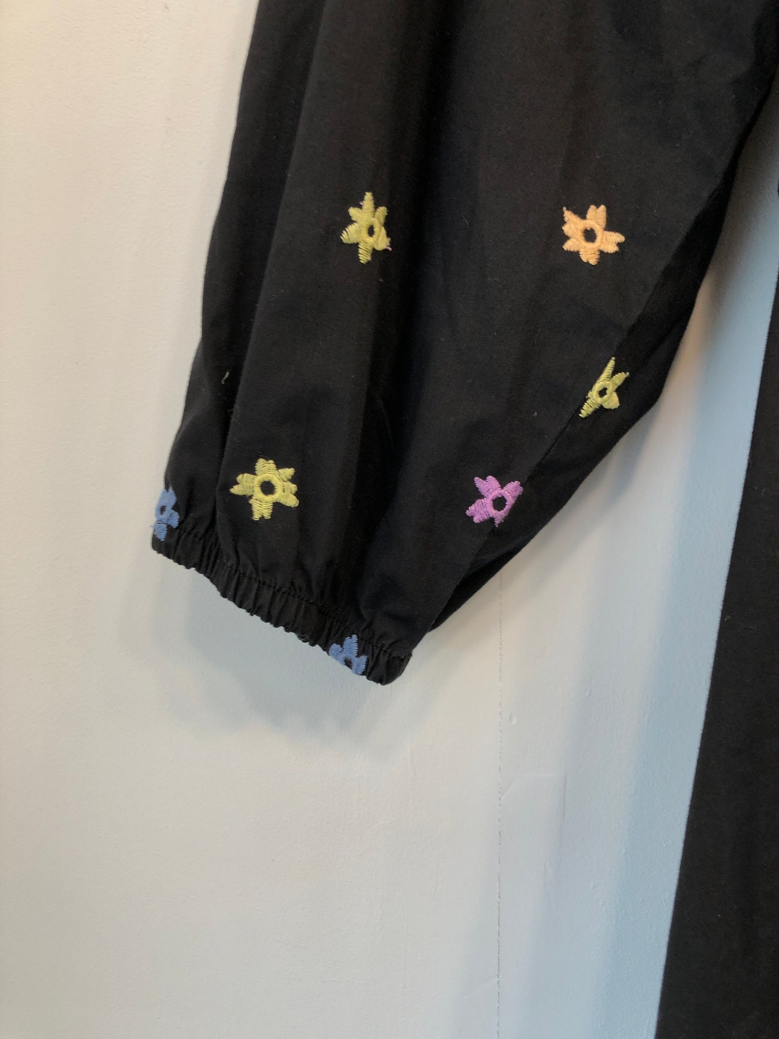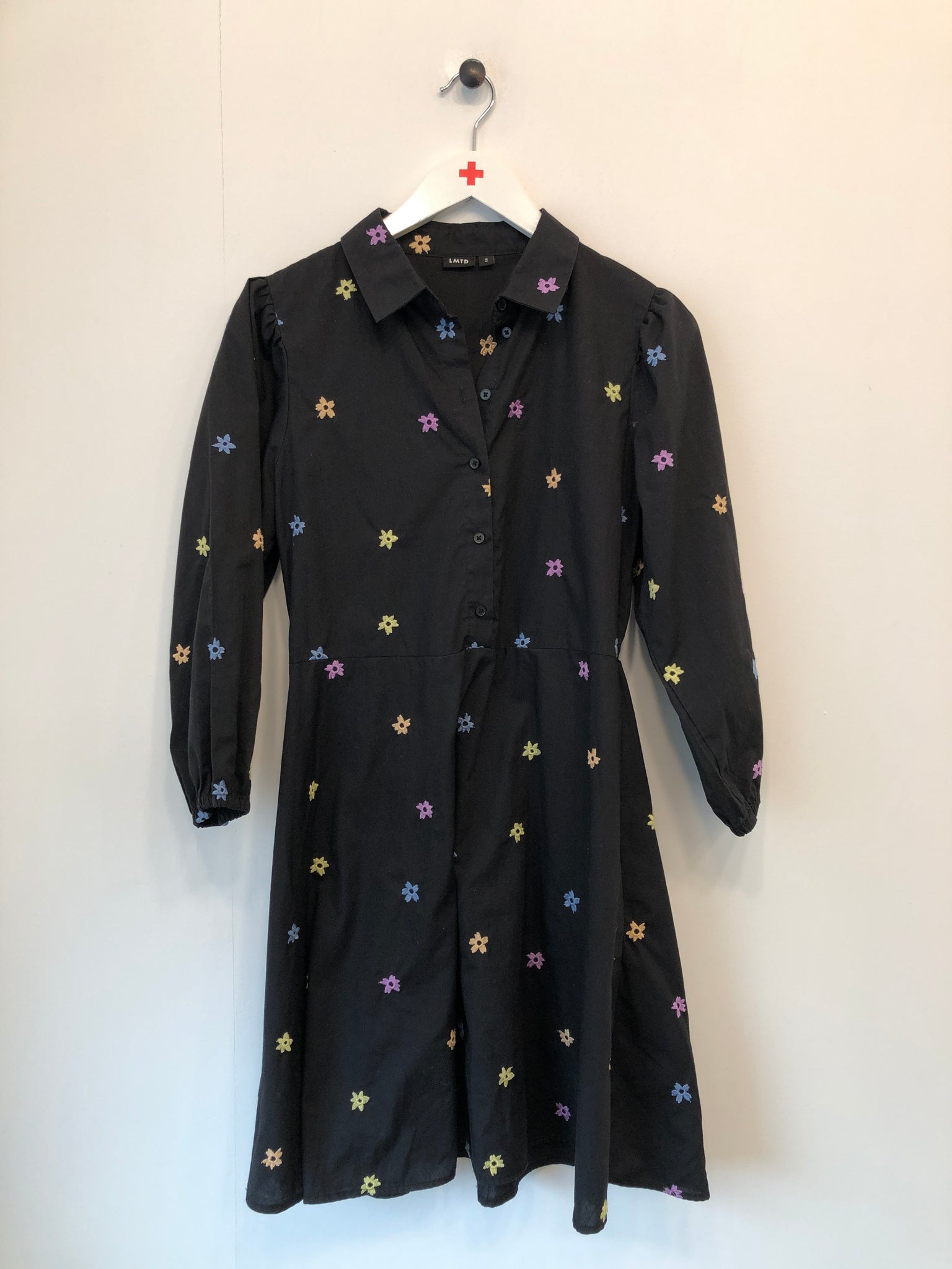 Chic kjole med krave, knapper foran og broderede blomsterdetaljer.
