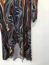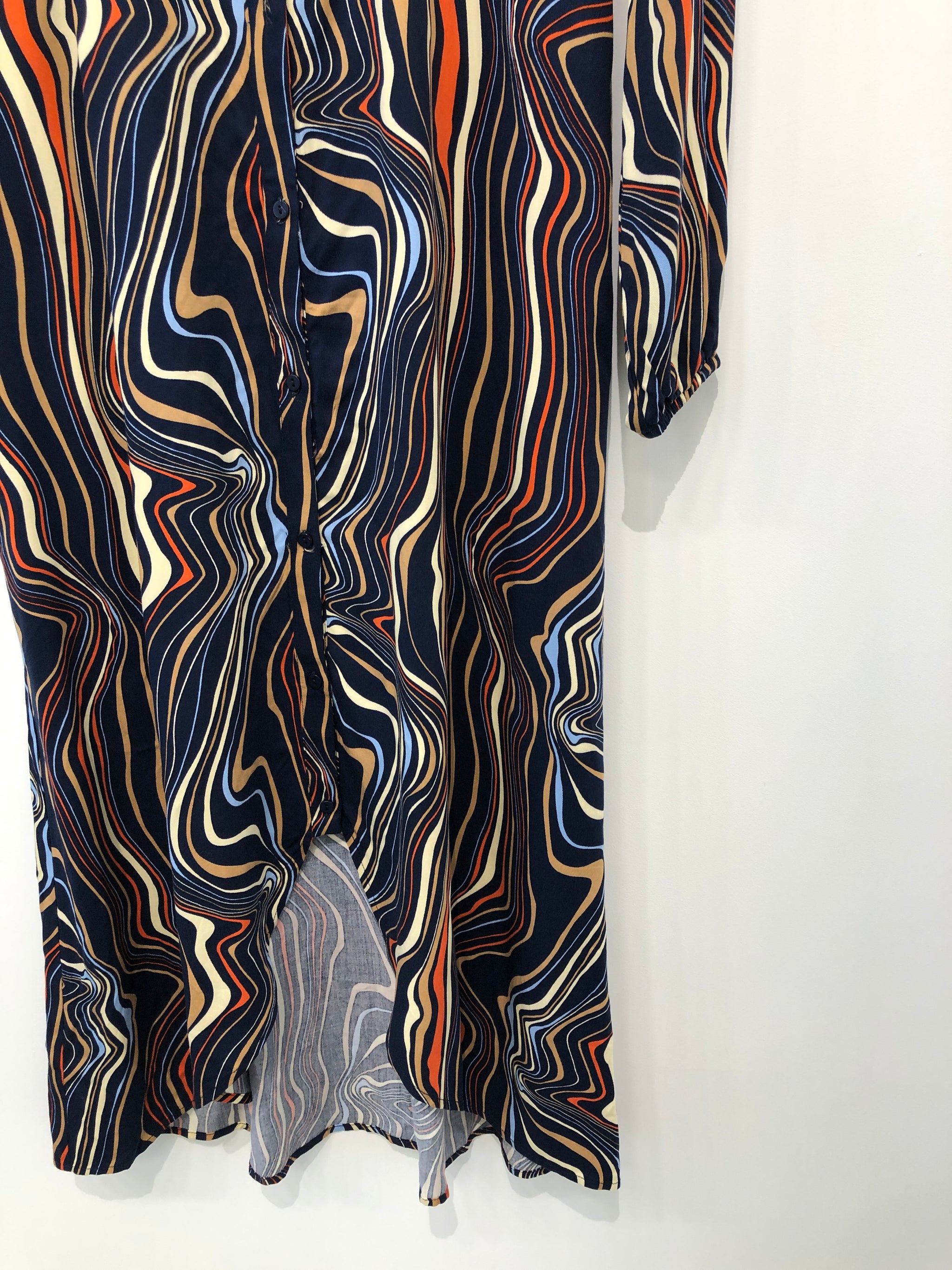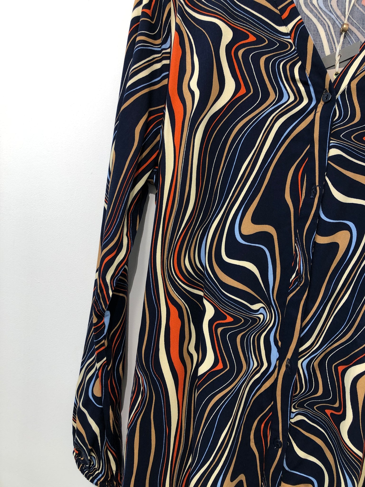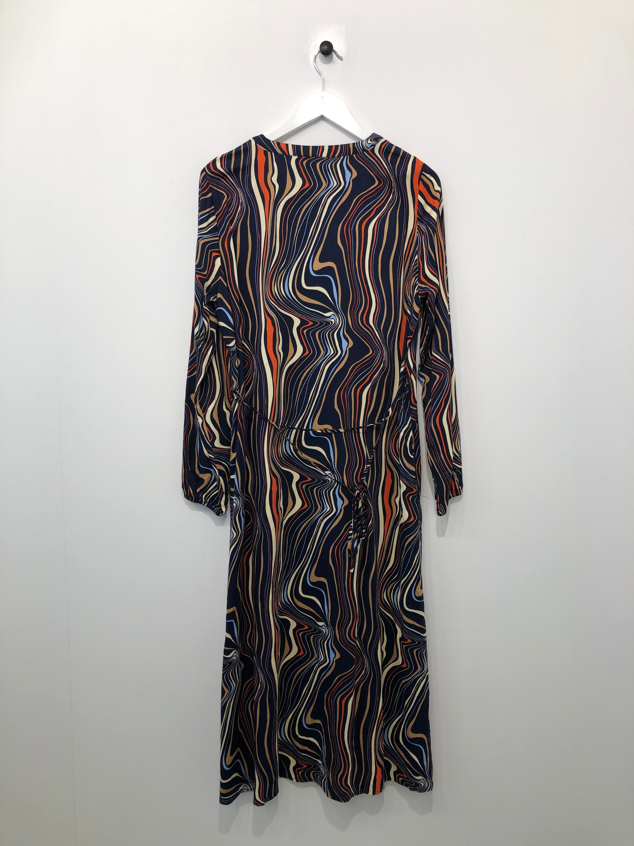 Kjole med V-hals udskæring, samt med knapper i fronten. Derudover har kjolen et flot mønster.