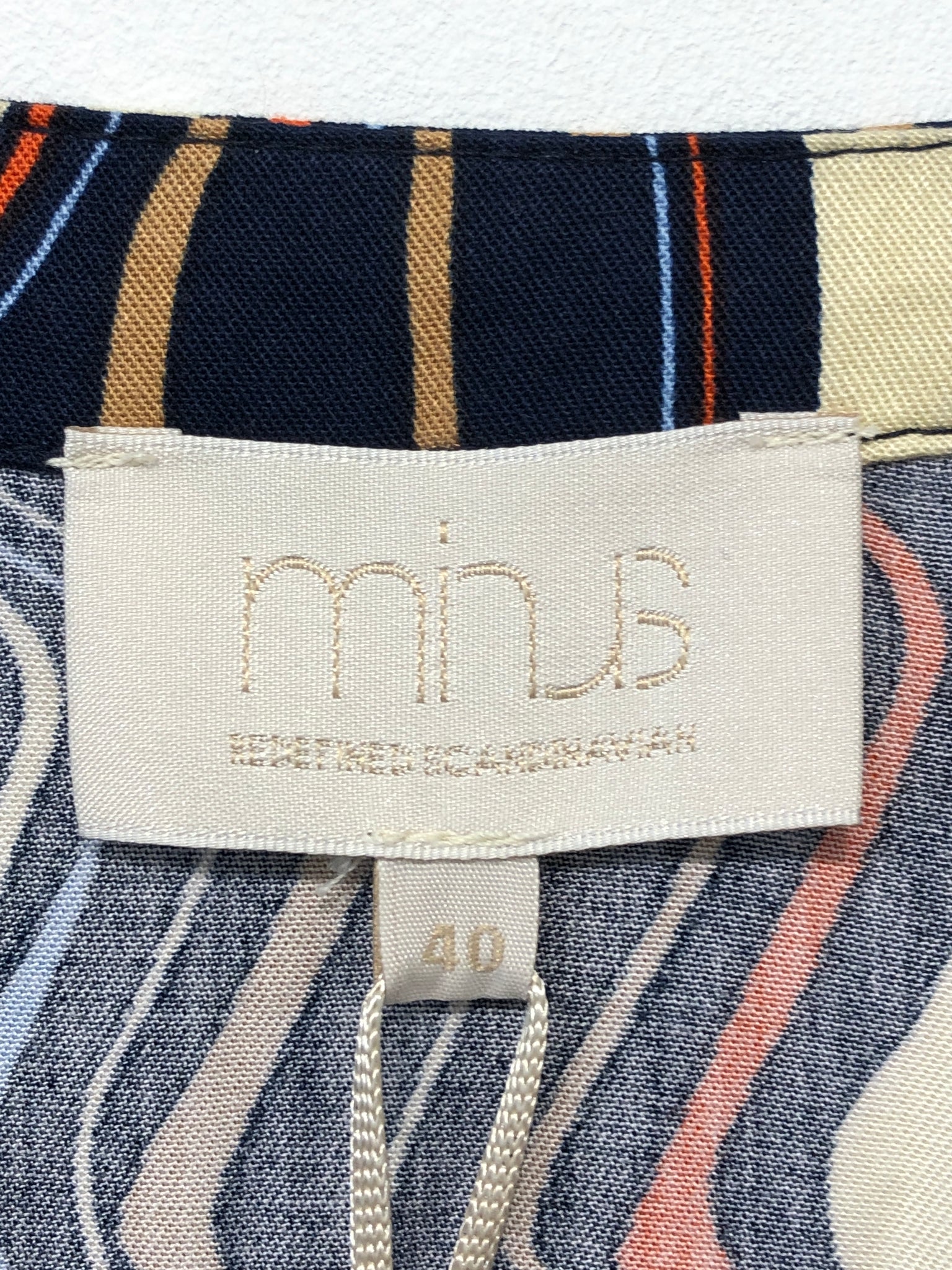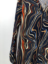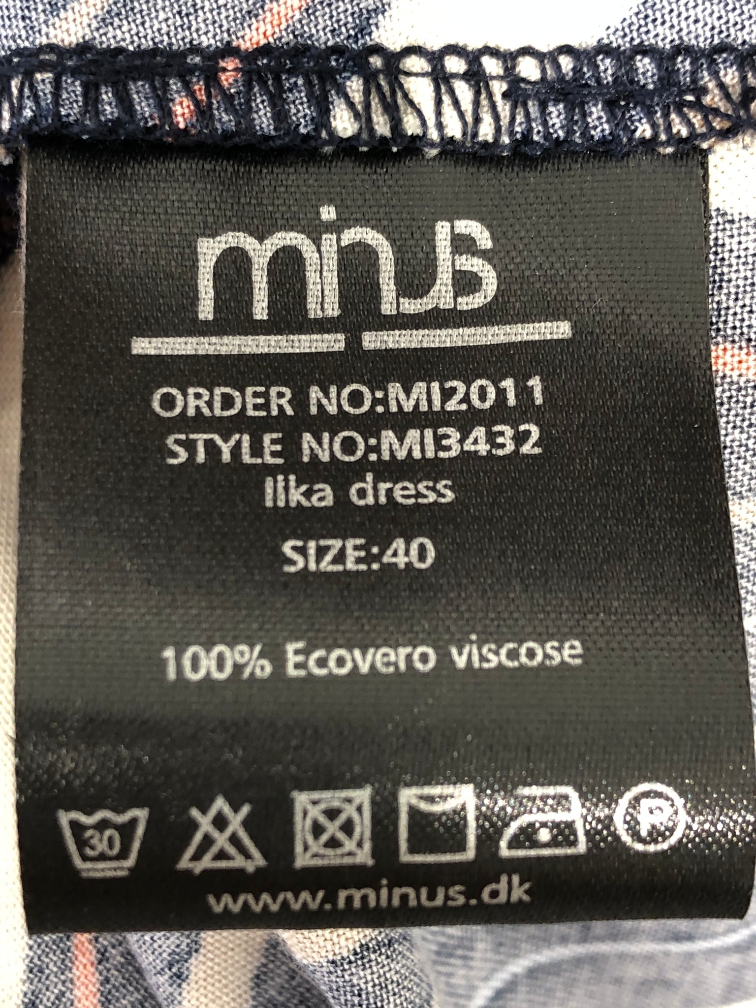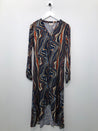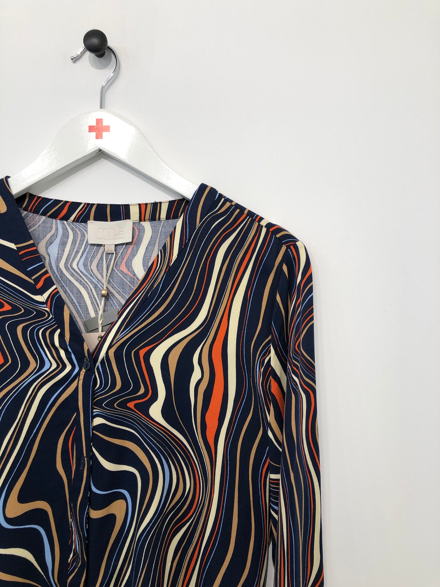 Kjole med V-hals udskæring, samt med knapper i fronten. Derudover har kjolen et flot mønster.