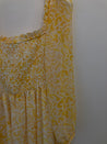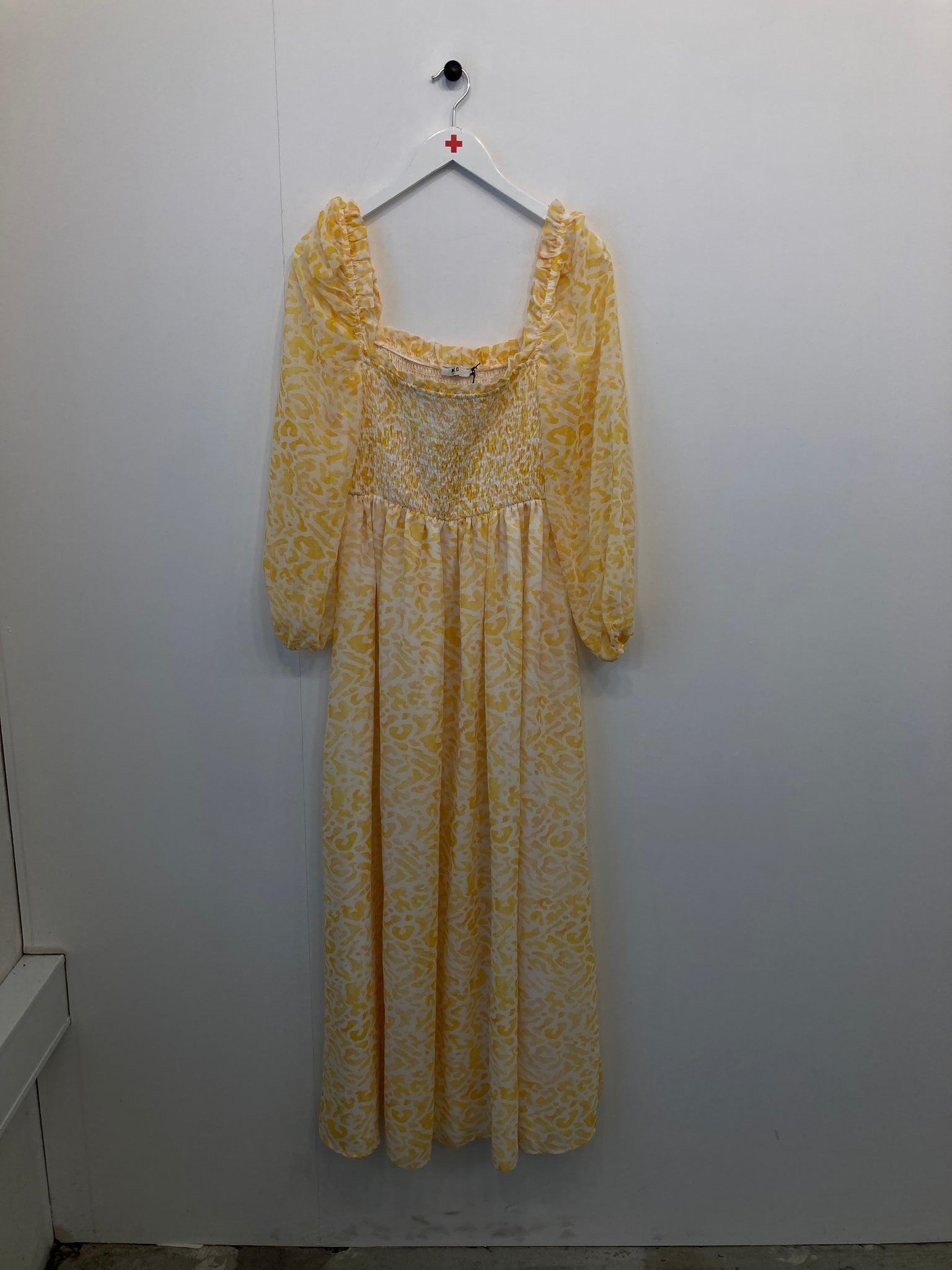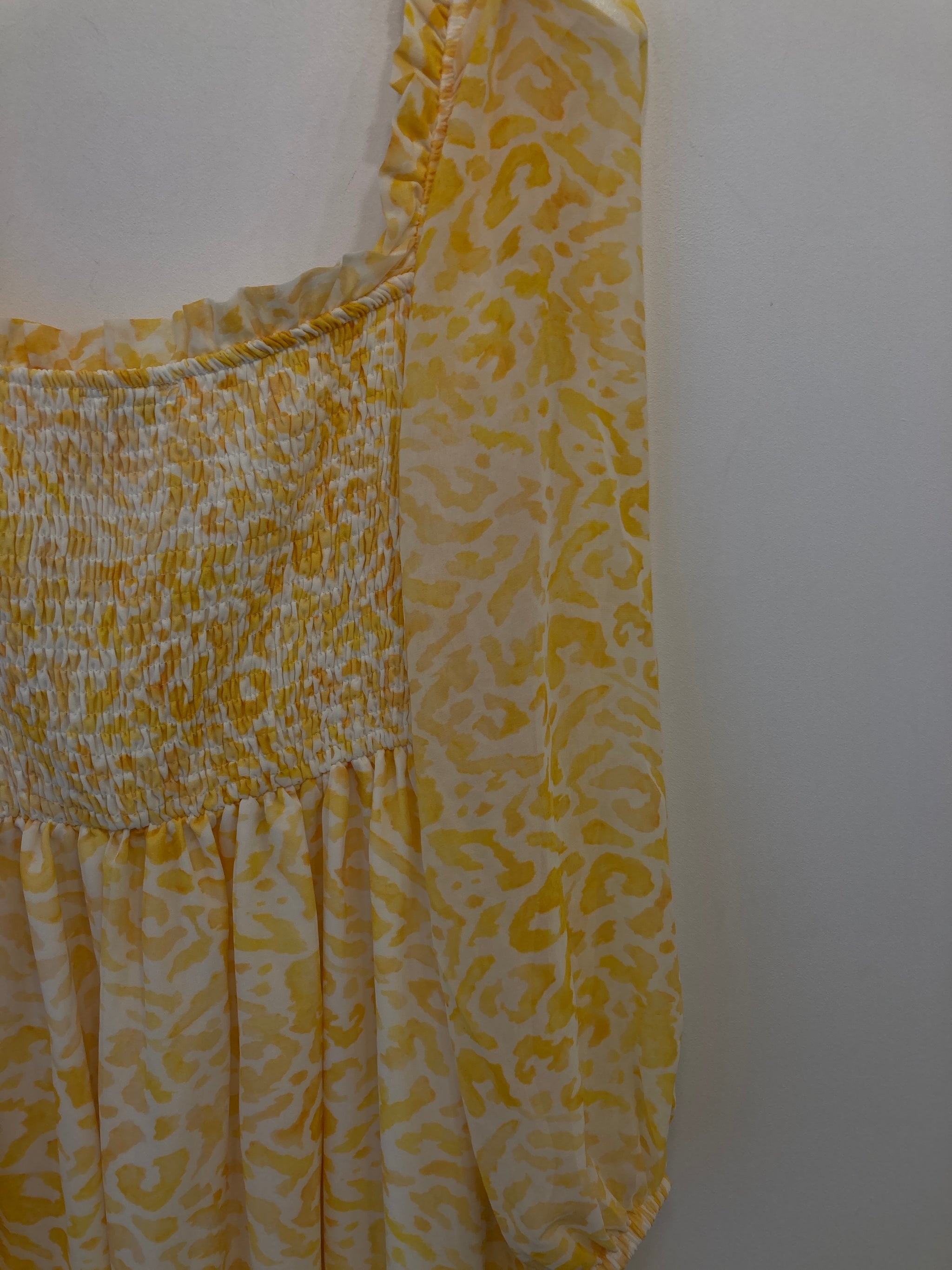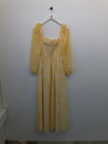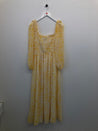 Lang kjole med ballonærmer, udskæring med elastik og flæse, elastikbånd på bryst og i ryg.