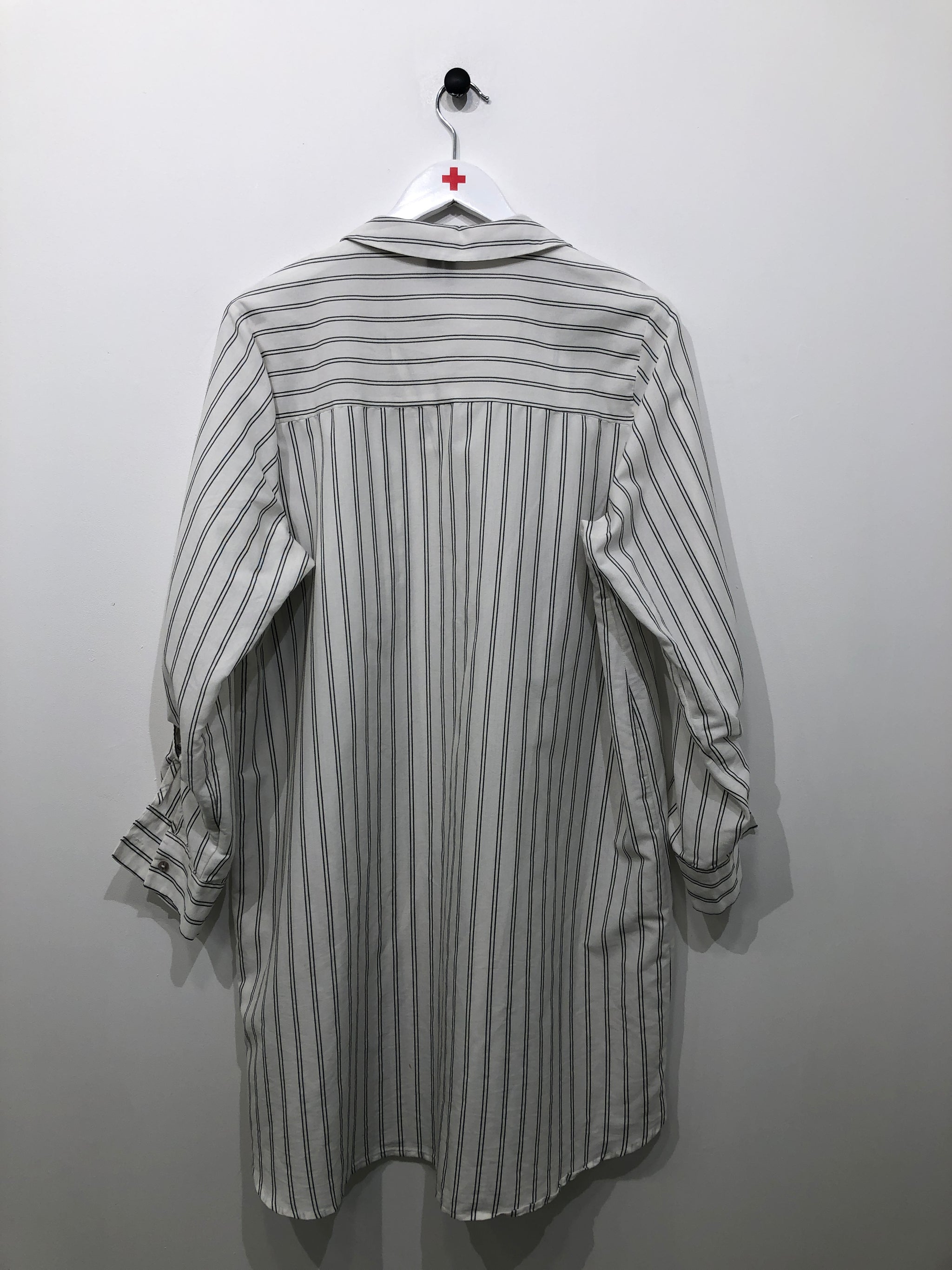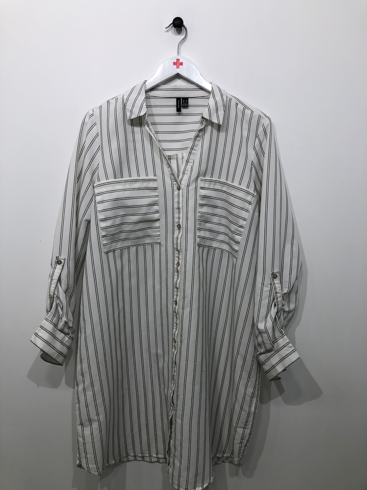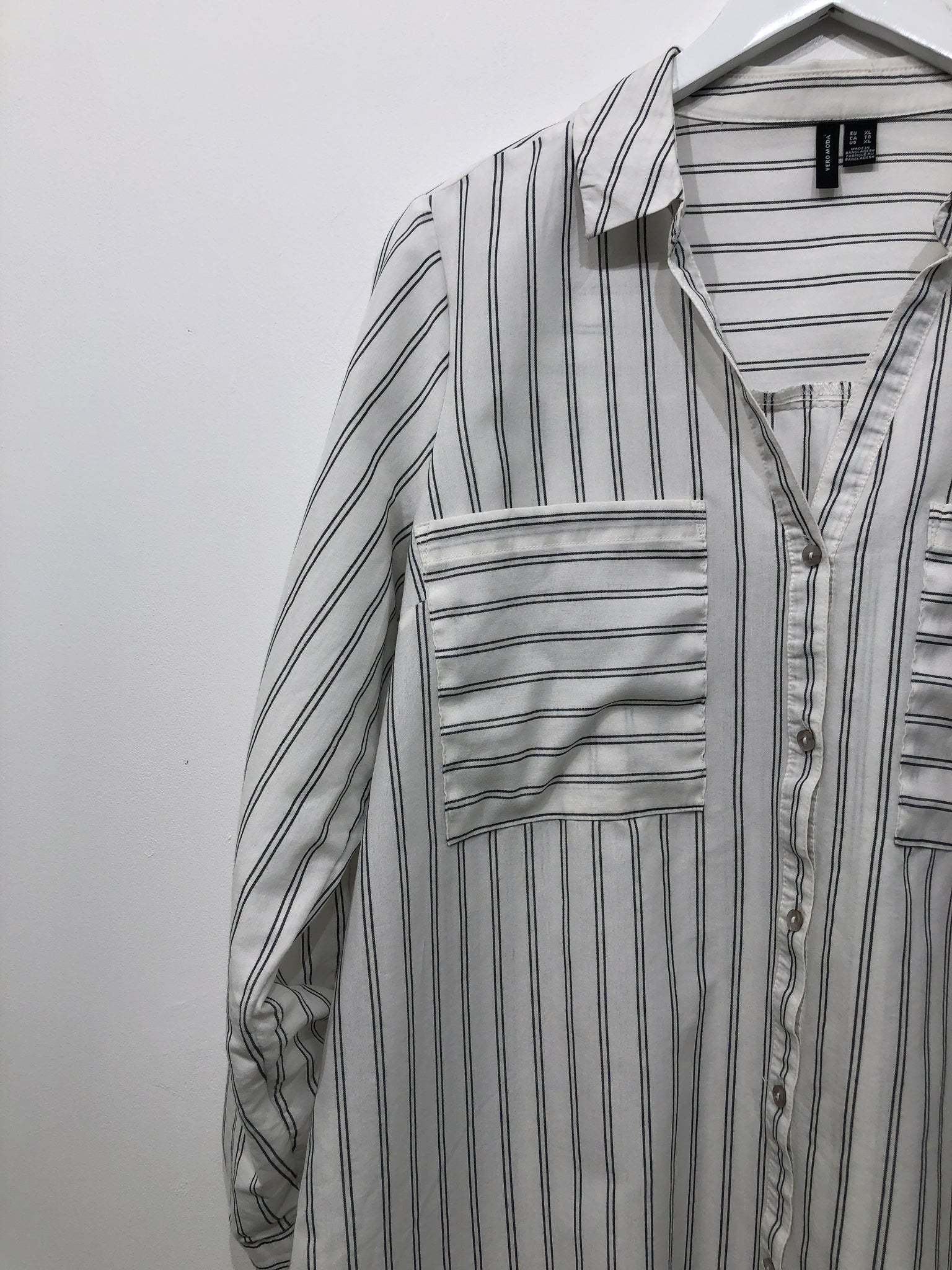 Chic lidt længere skjorte med lodrette striber, krave og brystlommer – elegant og modern.