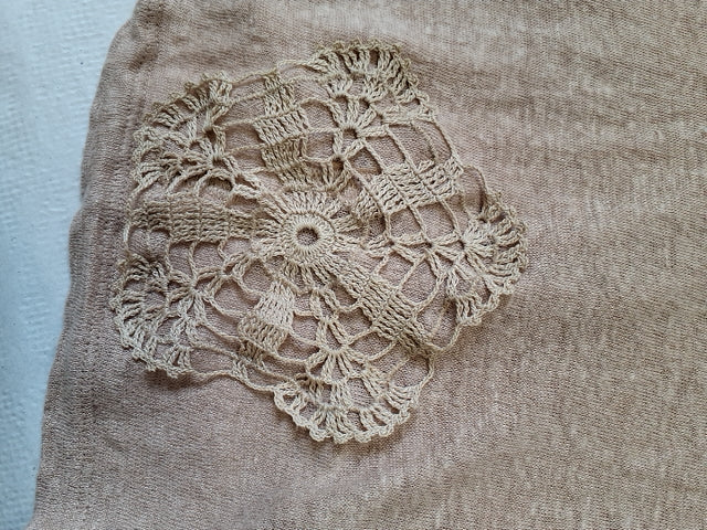 Denne bluse i 100% hør er pyntet med påsyet smuk hækleri. Så fin! Blusen er upcyklet her på stedet af frivillige i Nørklegruppen.