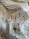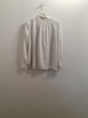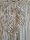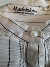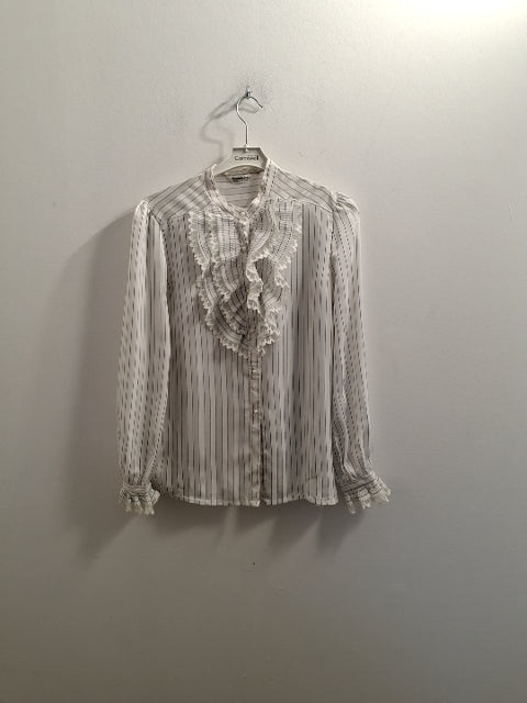 O459 Blusen er stribet med en rynket detalje foran og manchetter. Den er lavet af let stof.