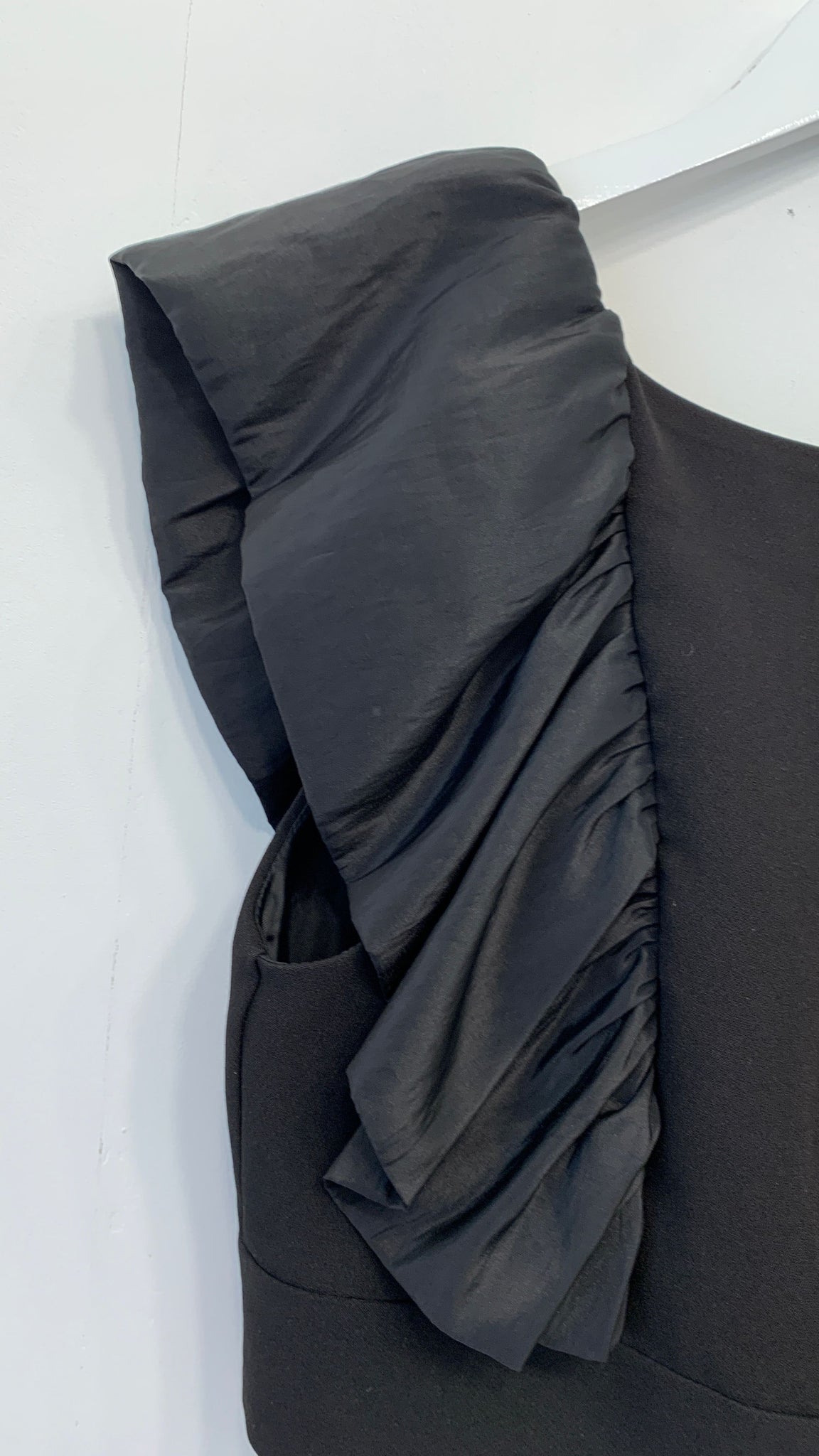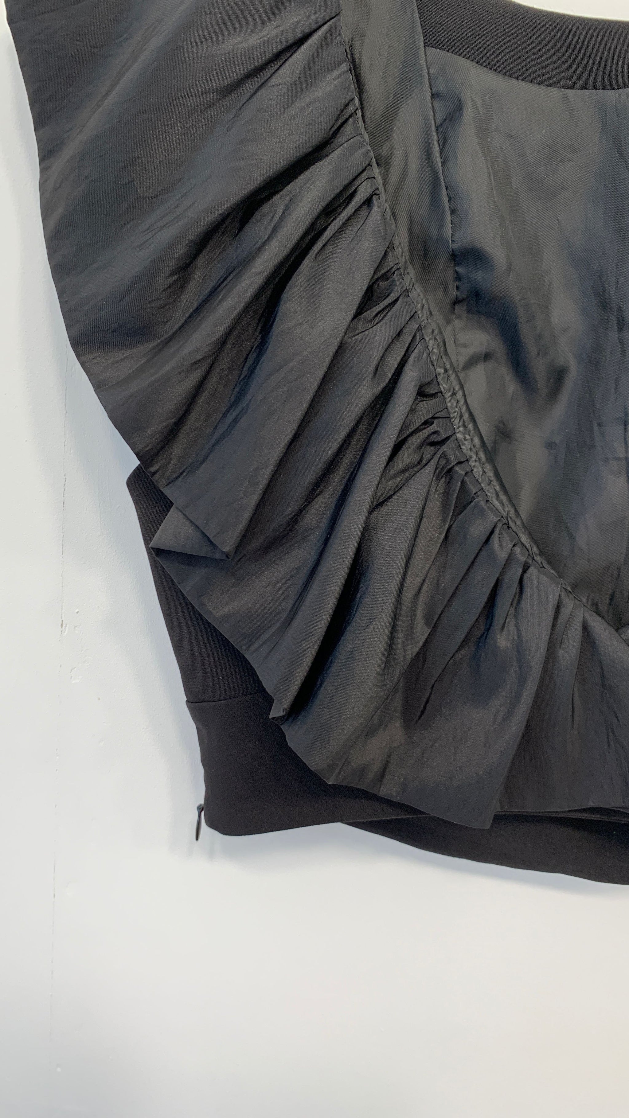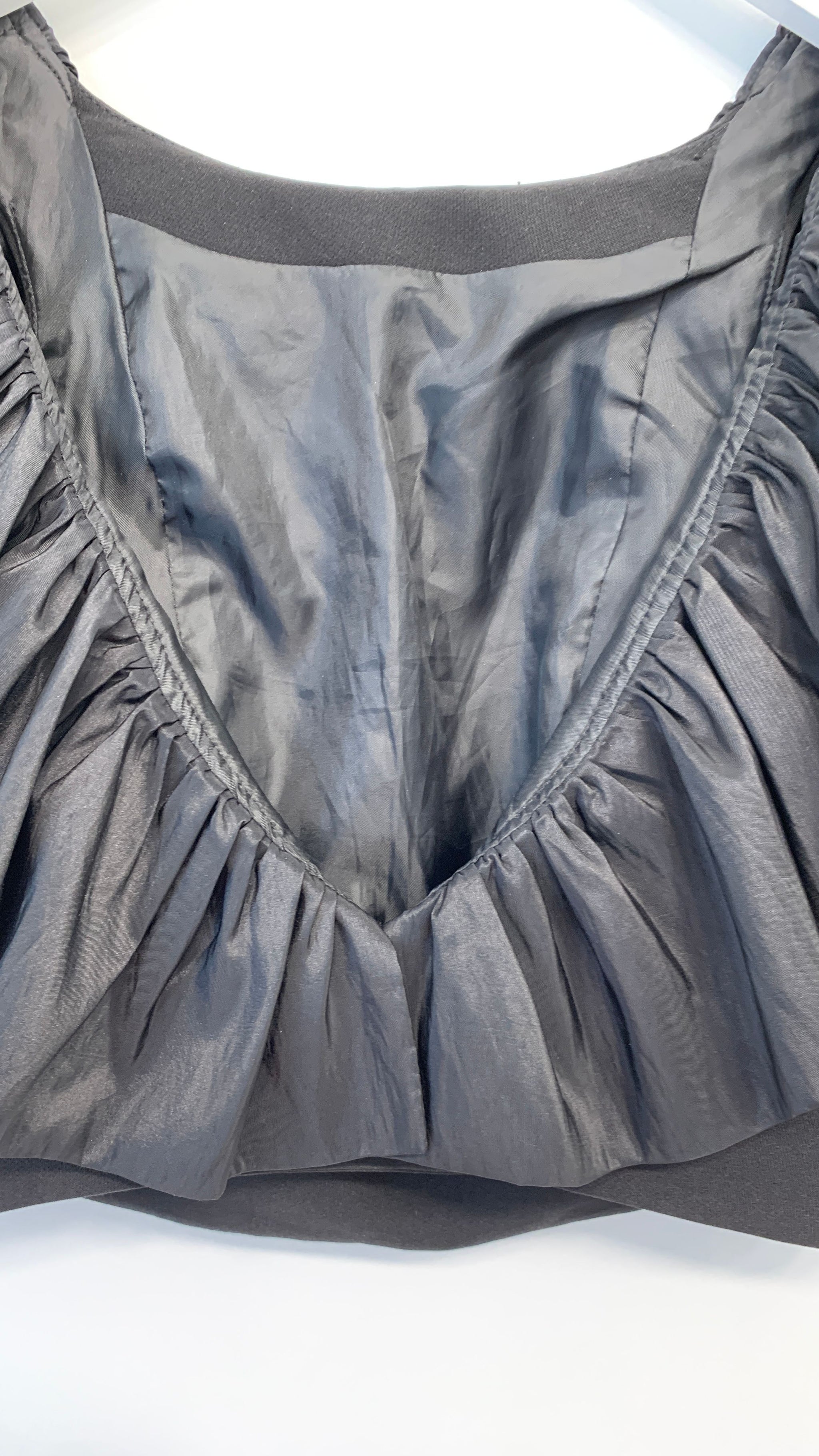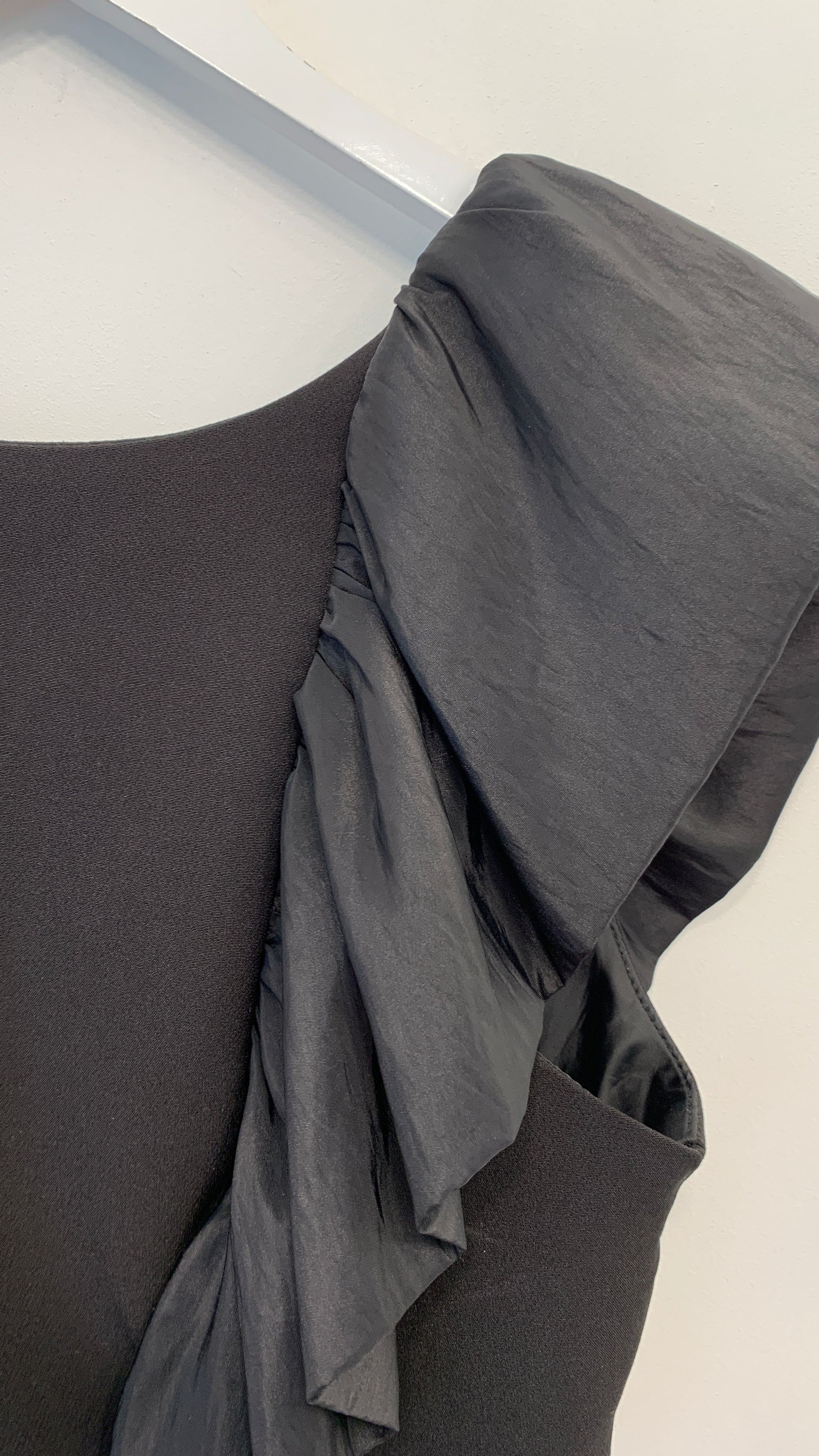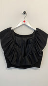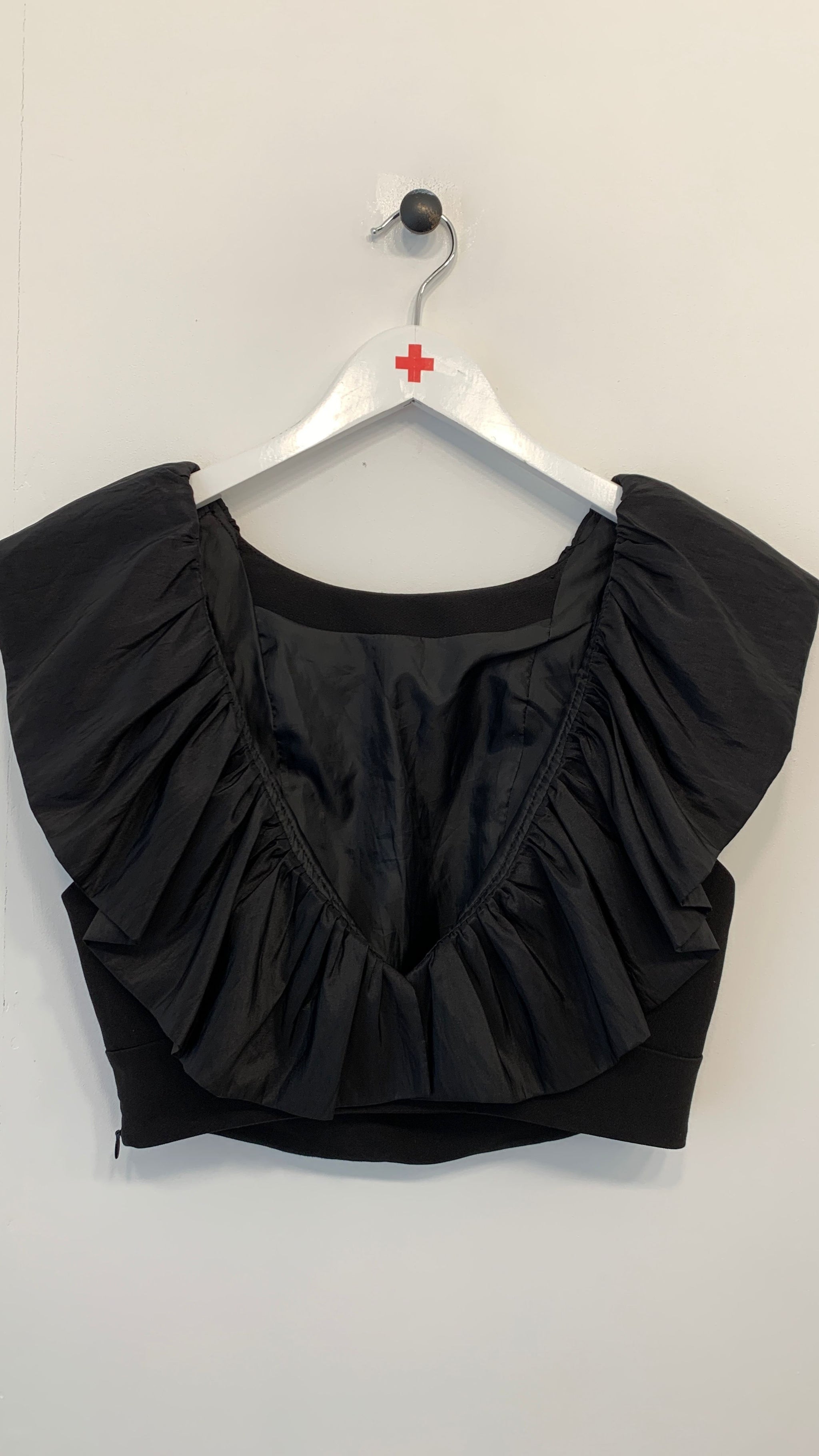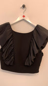 Elegant kort ærmeløs bluse med flæser og dyb V-udskæring i ryg.
