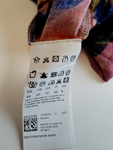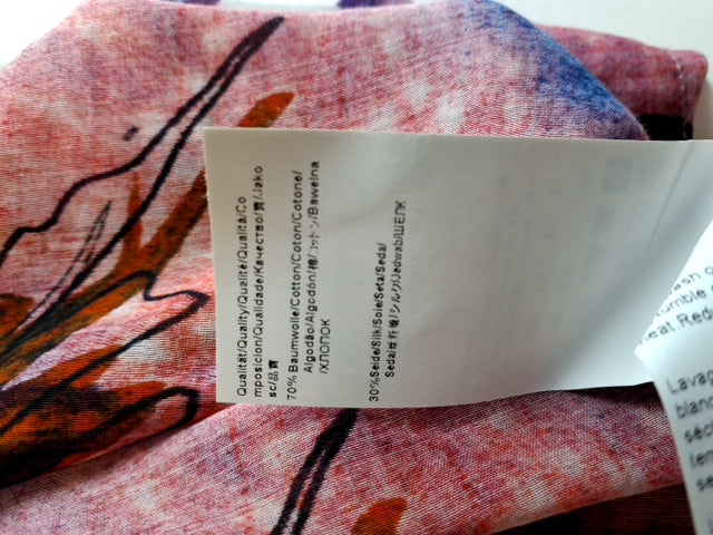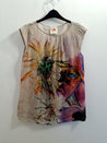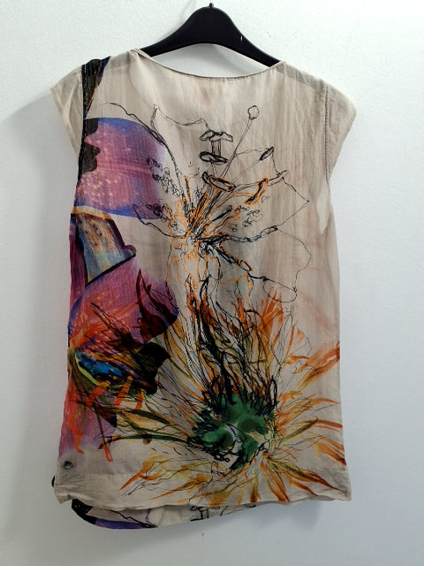 R700 Blusen har en løs pasform og er fremstillet af et blødt, let bomuld/ silkeblanding. Den prydes af farverige blomsterprints, der skaber et livligt udseende. Beholder et feminint look med rund halsudskæring og korte ærmer.
