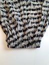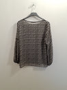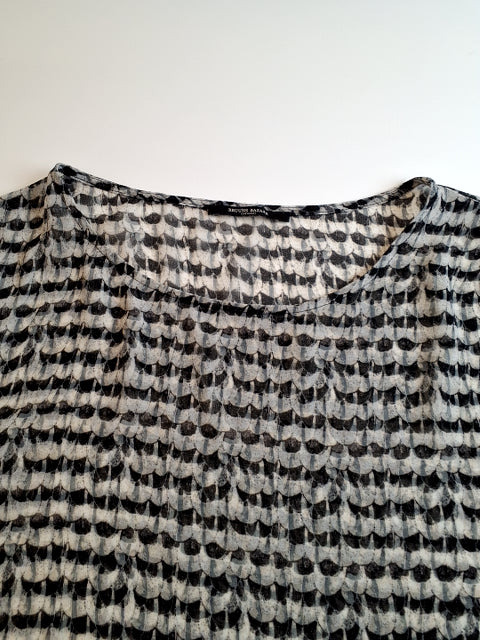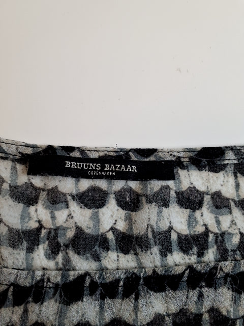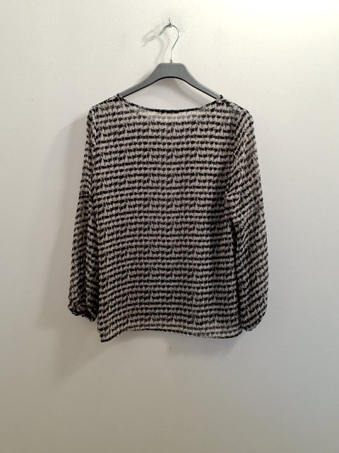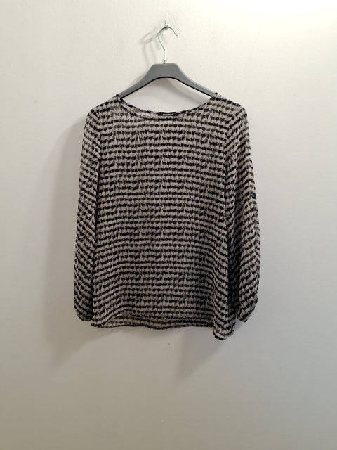 O192 Blusen har lange ærmer og en løs pasform. Den er i let, gennemsigtigt materiale med et mønster.Sort og grå nuancer i mønstret.