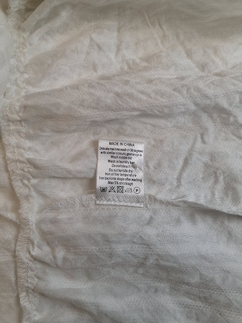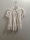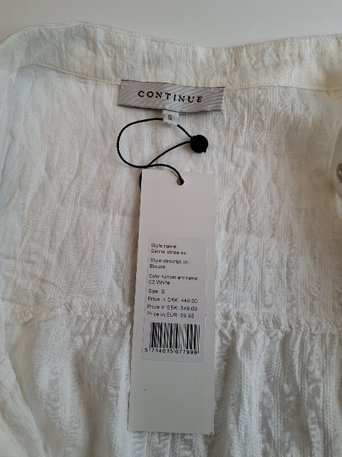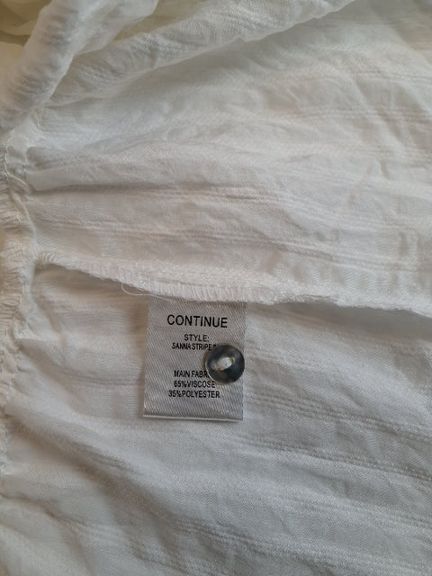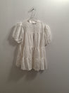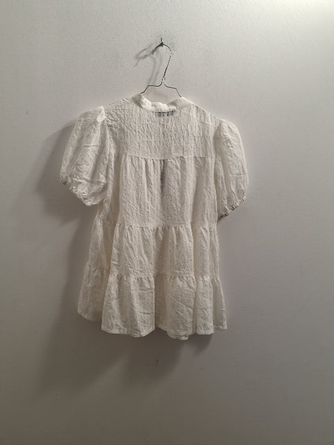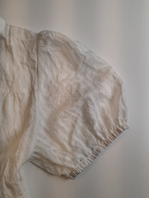 O217Blusen har korte puffærmer og knaplukning, lavet af let, krøllet stof.