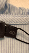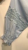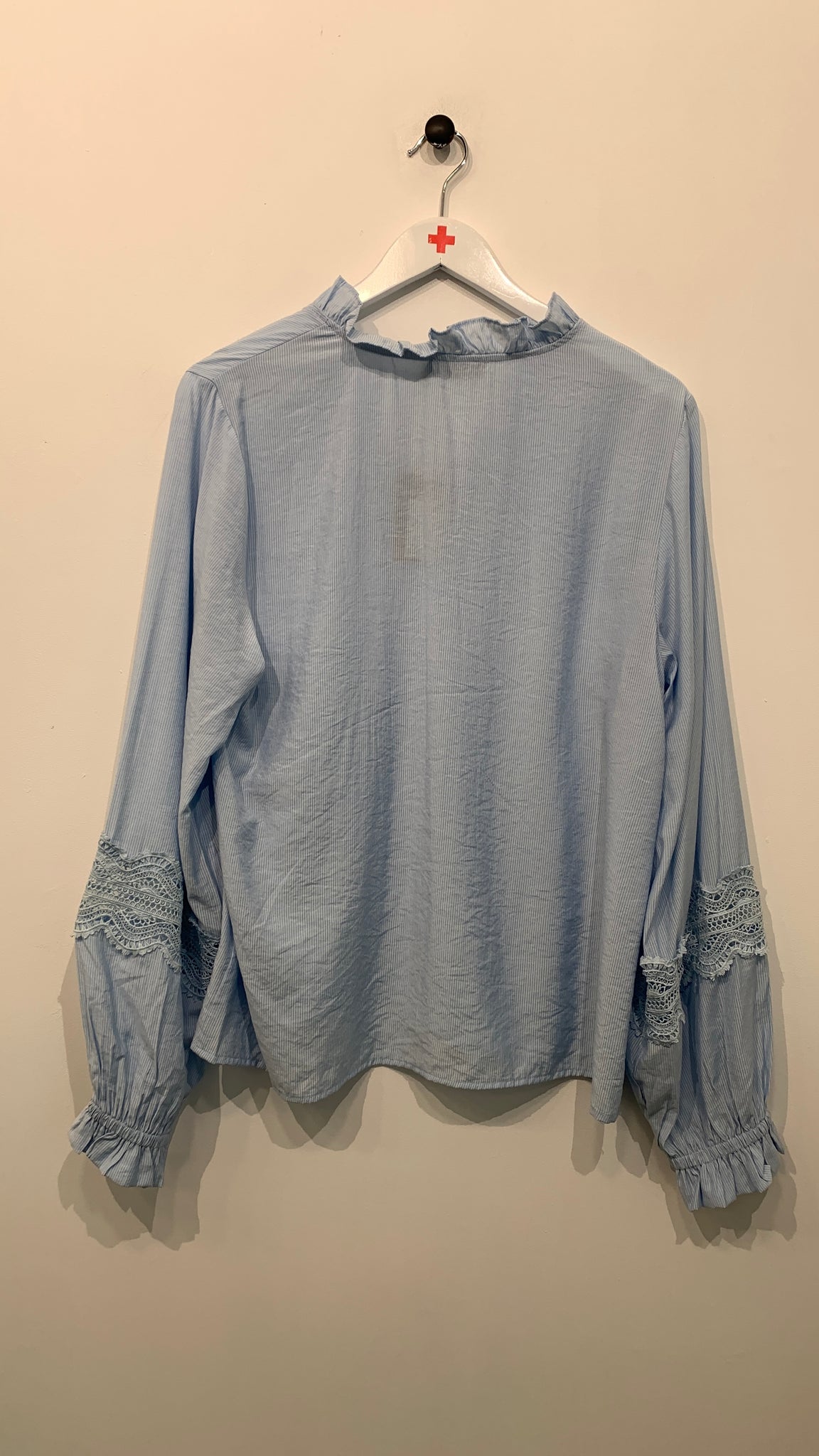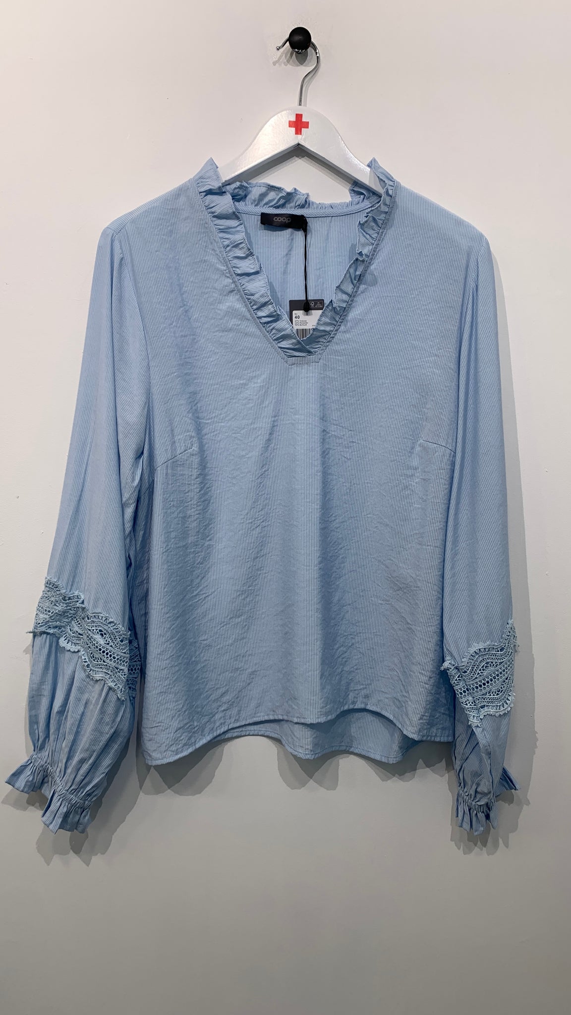 Bluse med V udskæring med flæse, lange ærmer med blonde og flæse.