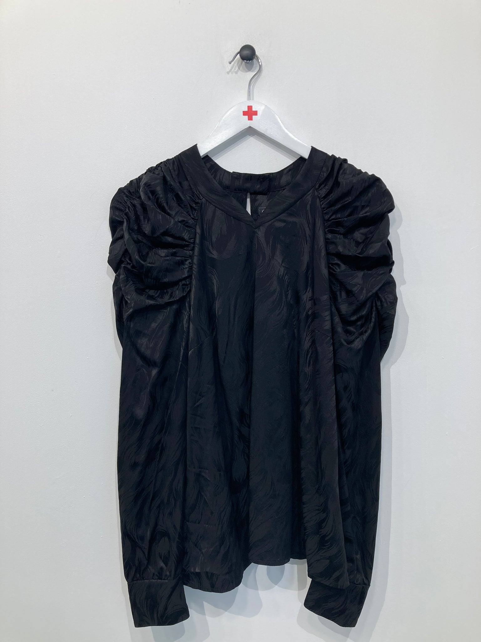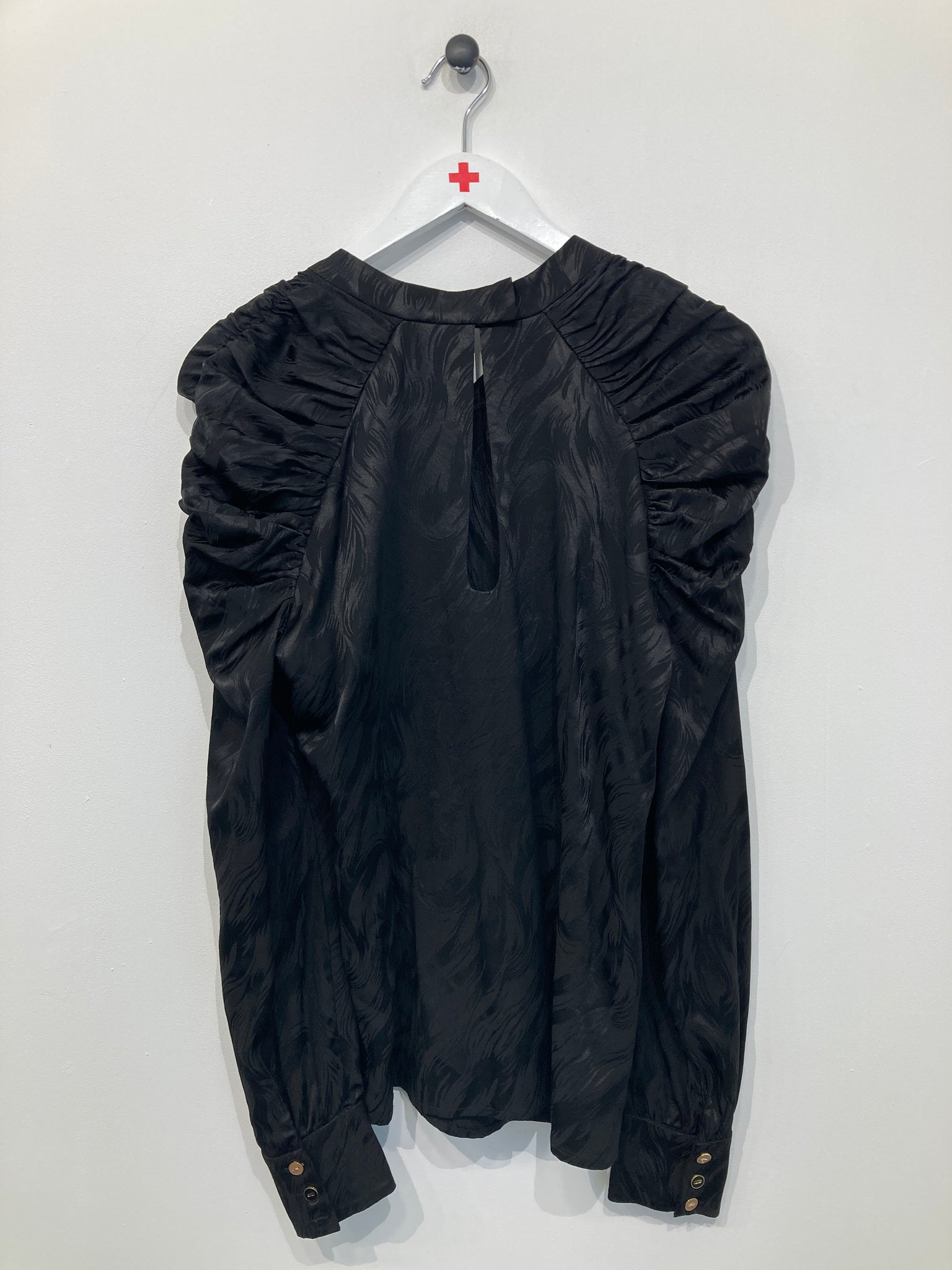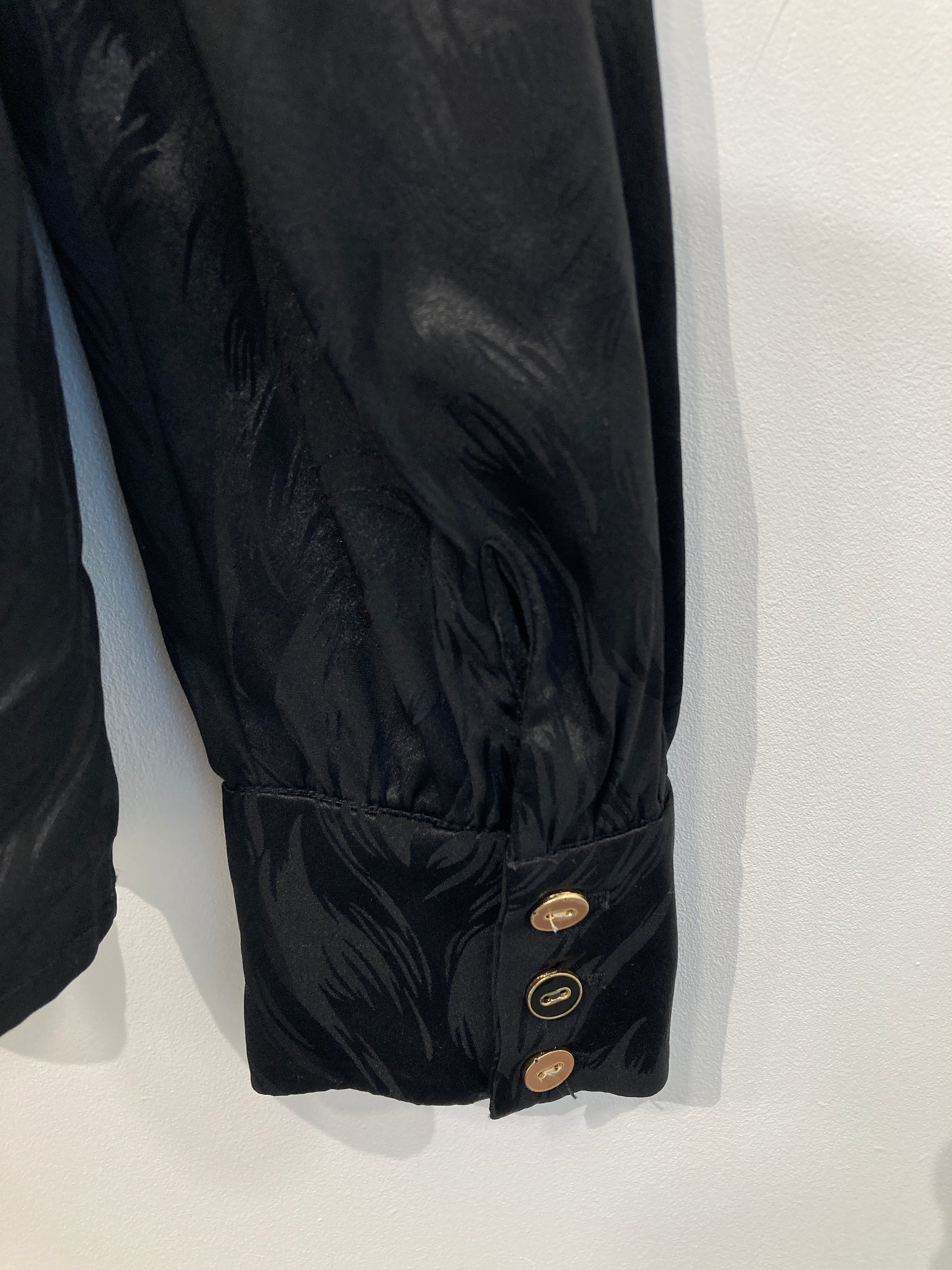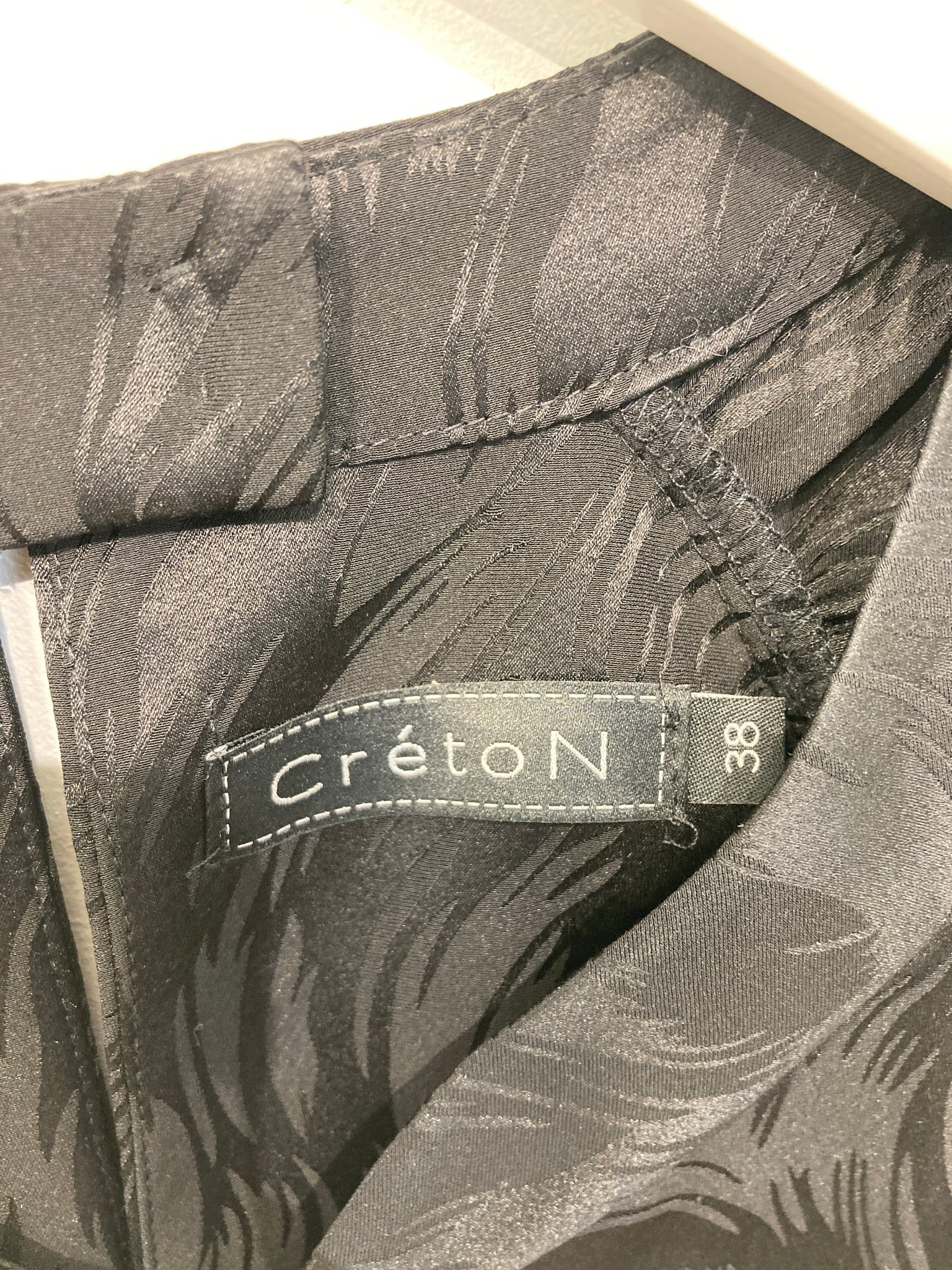 Sød bluse af mærket Créton med lange ærmer og ruflede skuldre, og et subtilt mønster i stoffet.