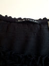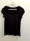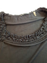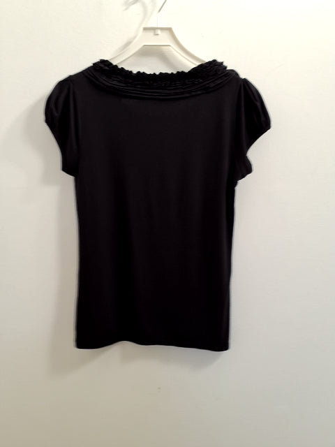 O123 Blusen har korte ærmer og en dekorativ krave i rynket materiale. Den er tætsiddende og blød.
