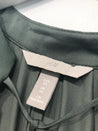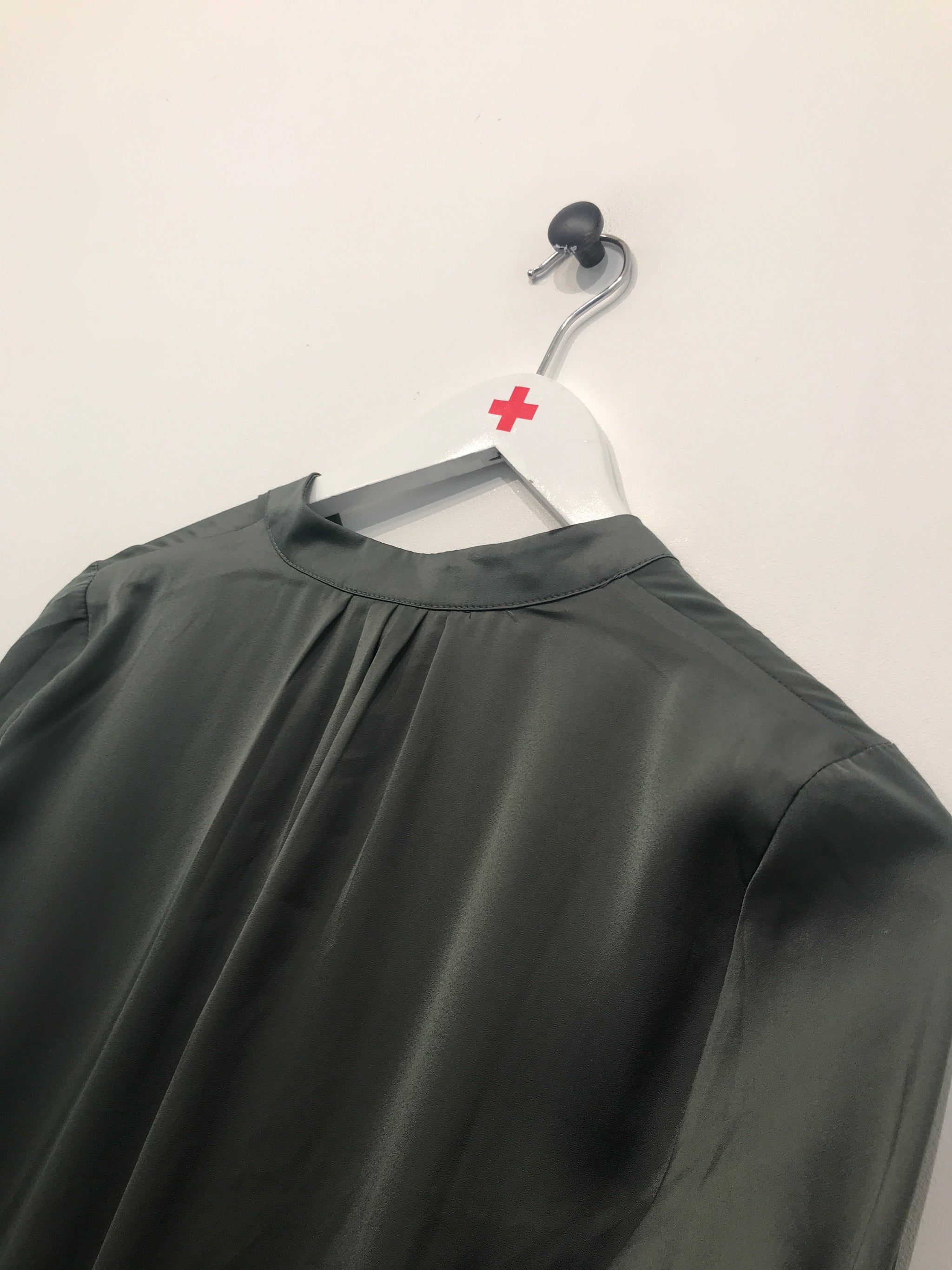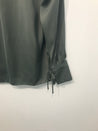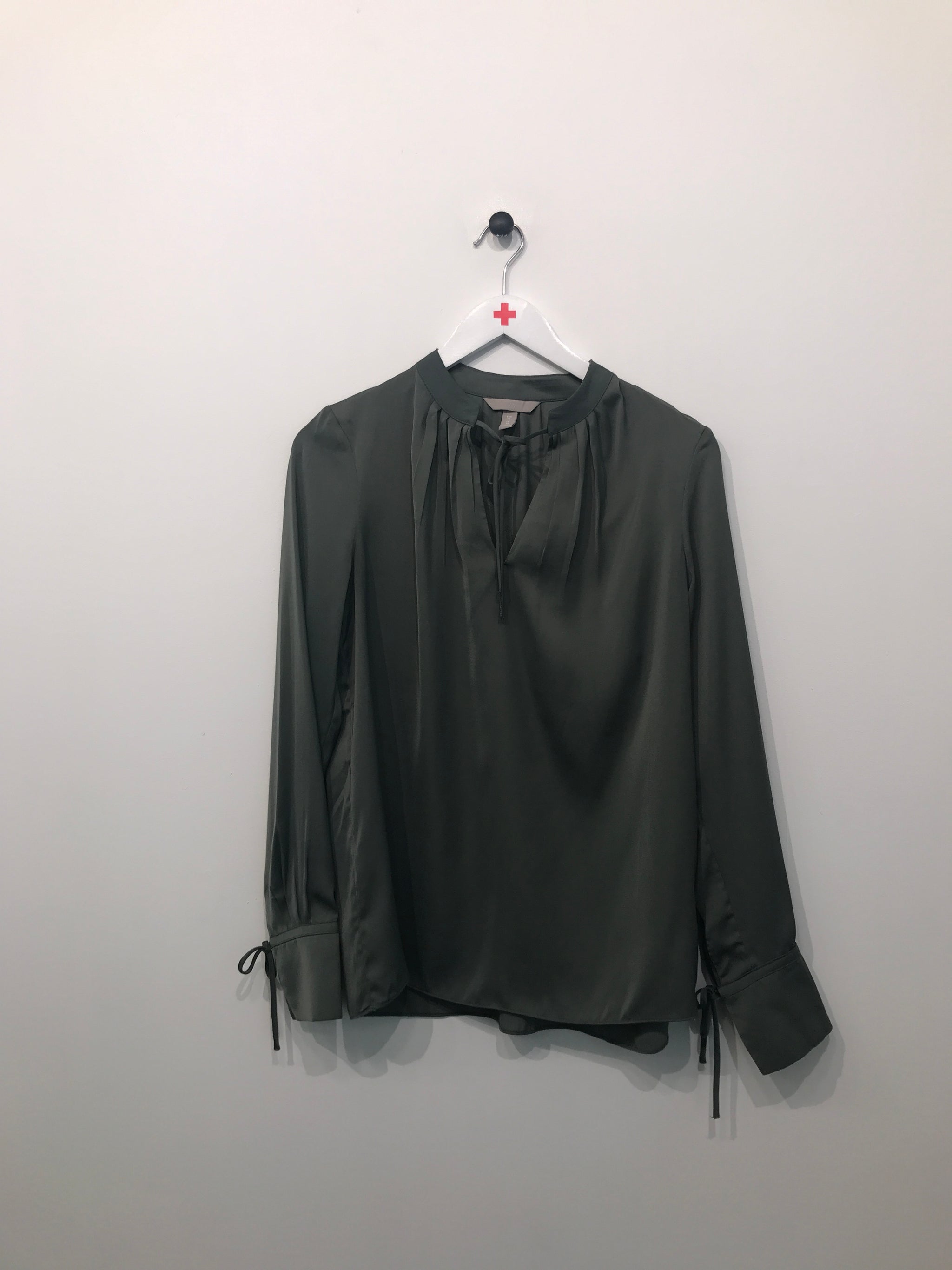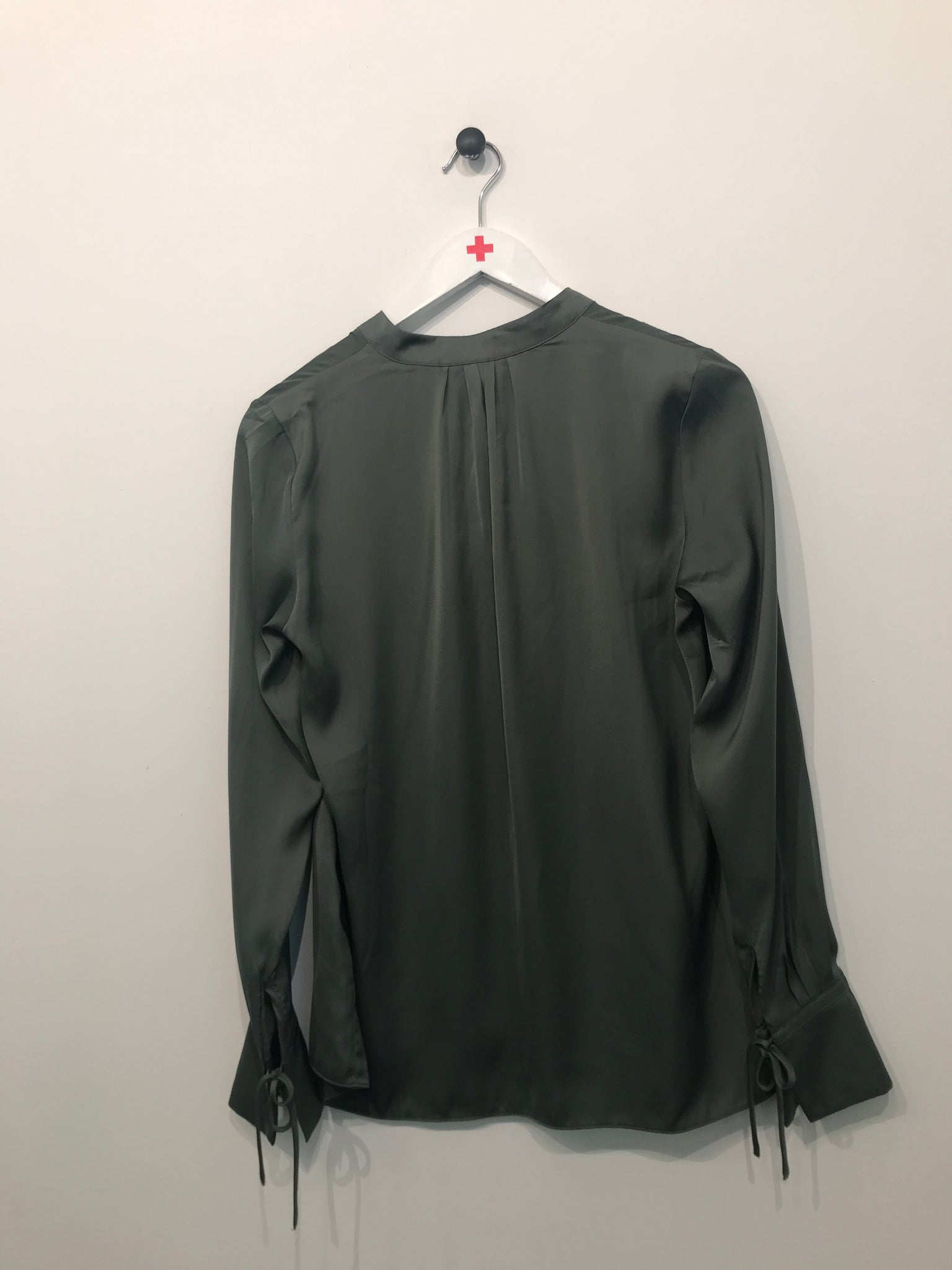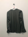 Bluse med læg og bindebånd i V udskæring, lange ærmer med bindebånd.