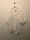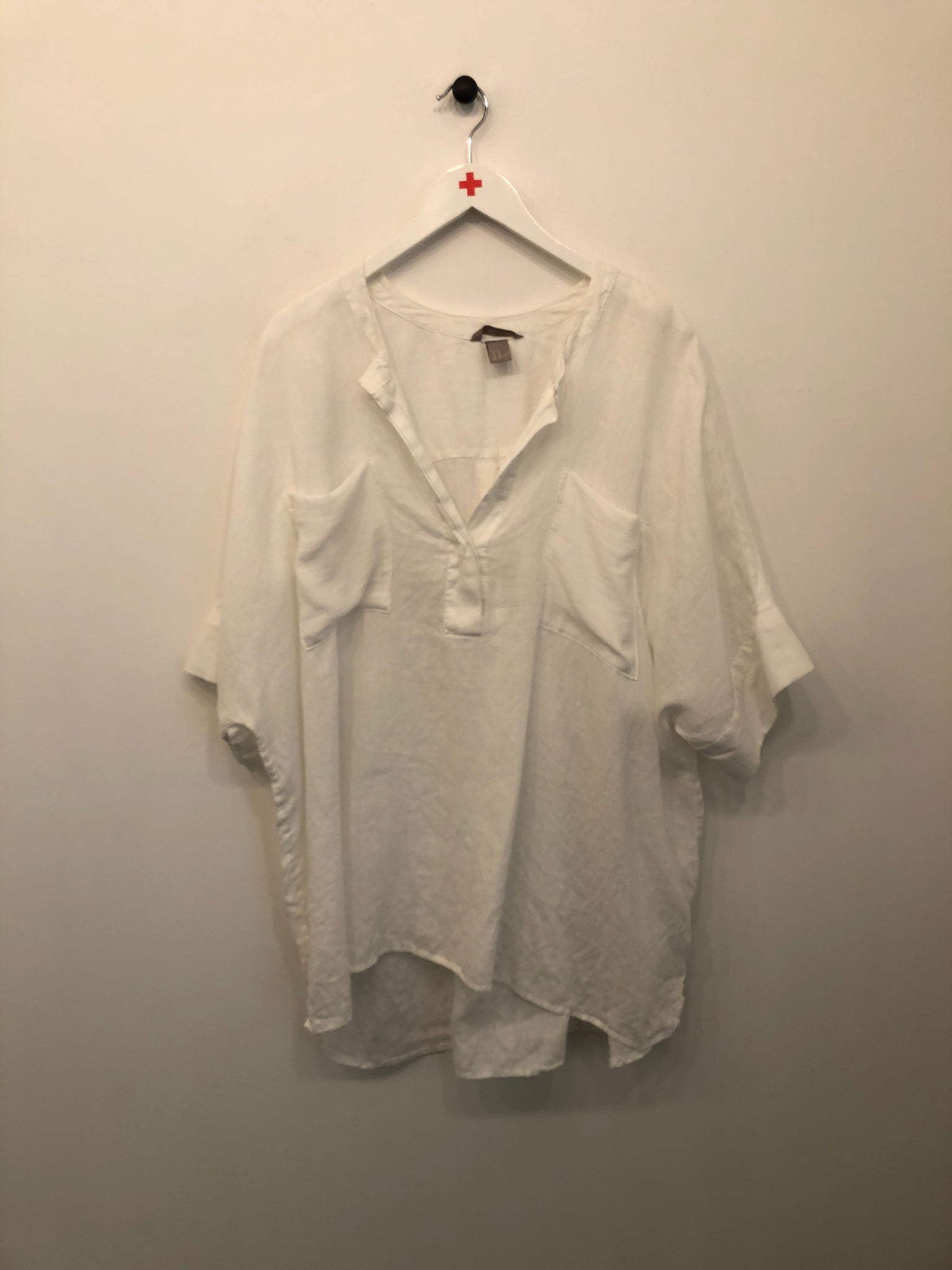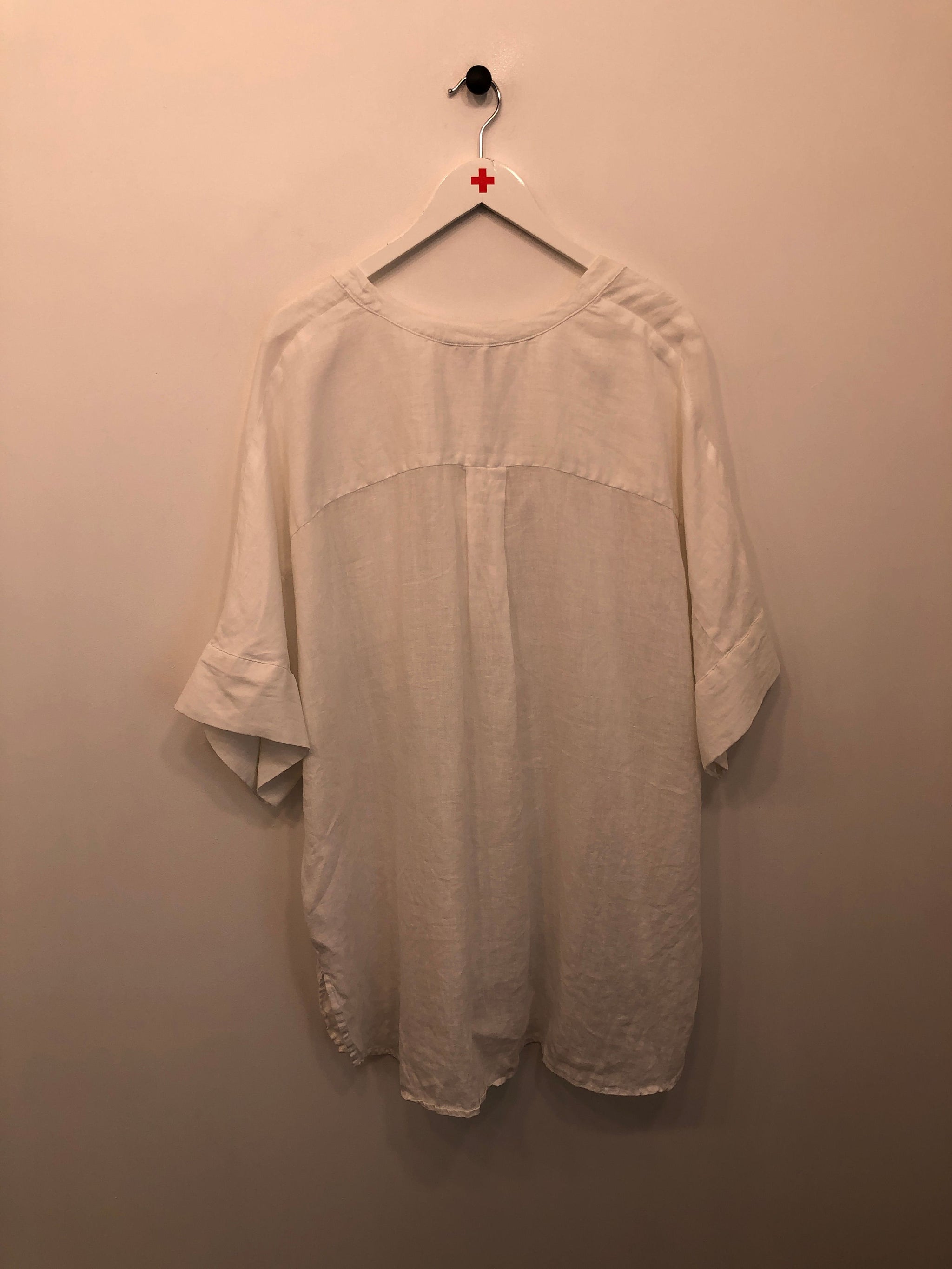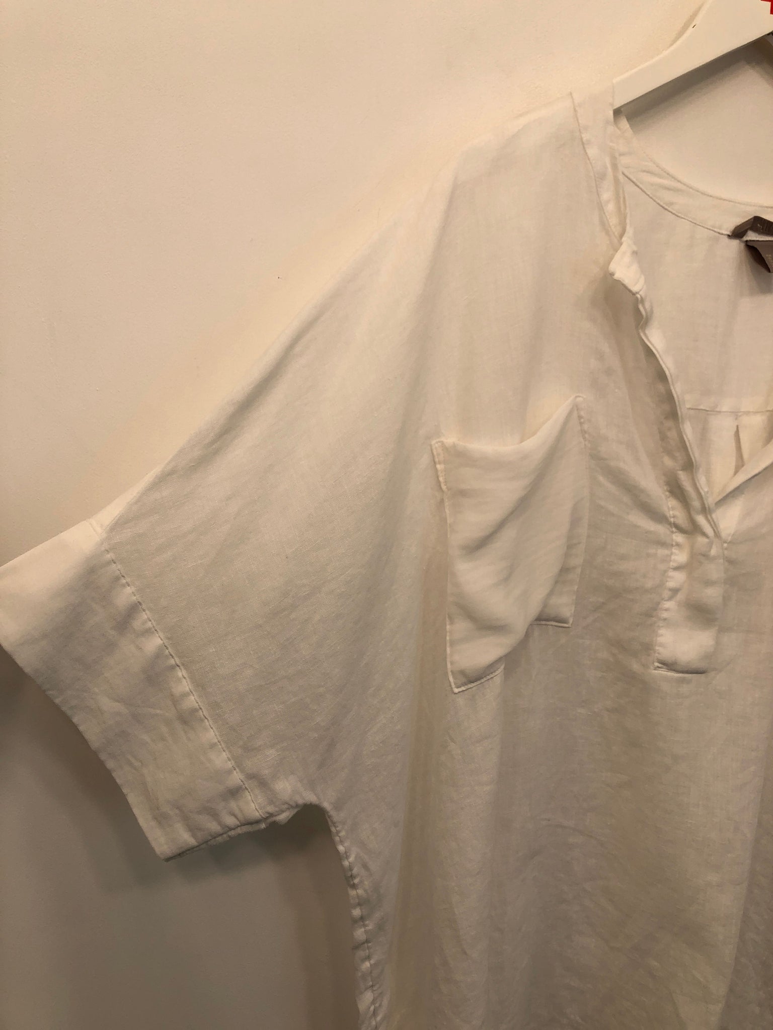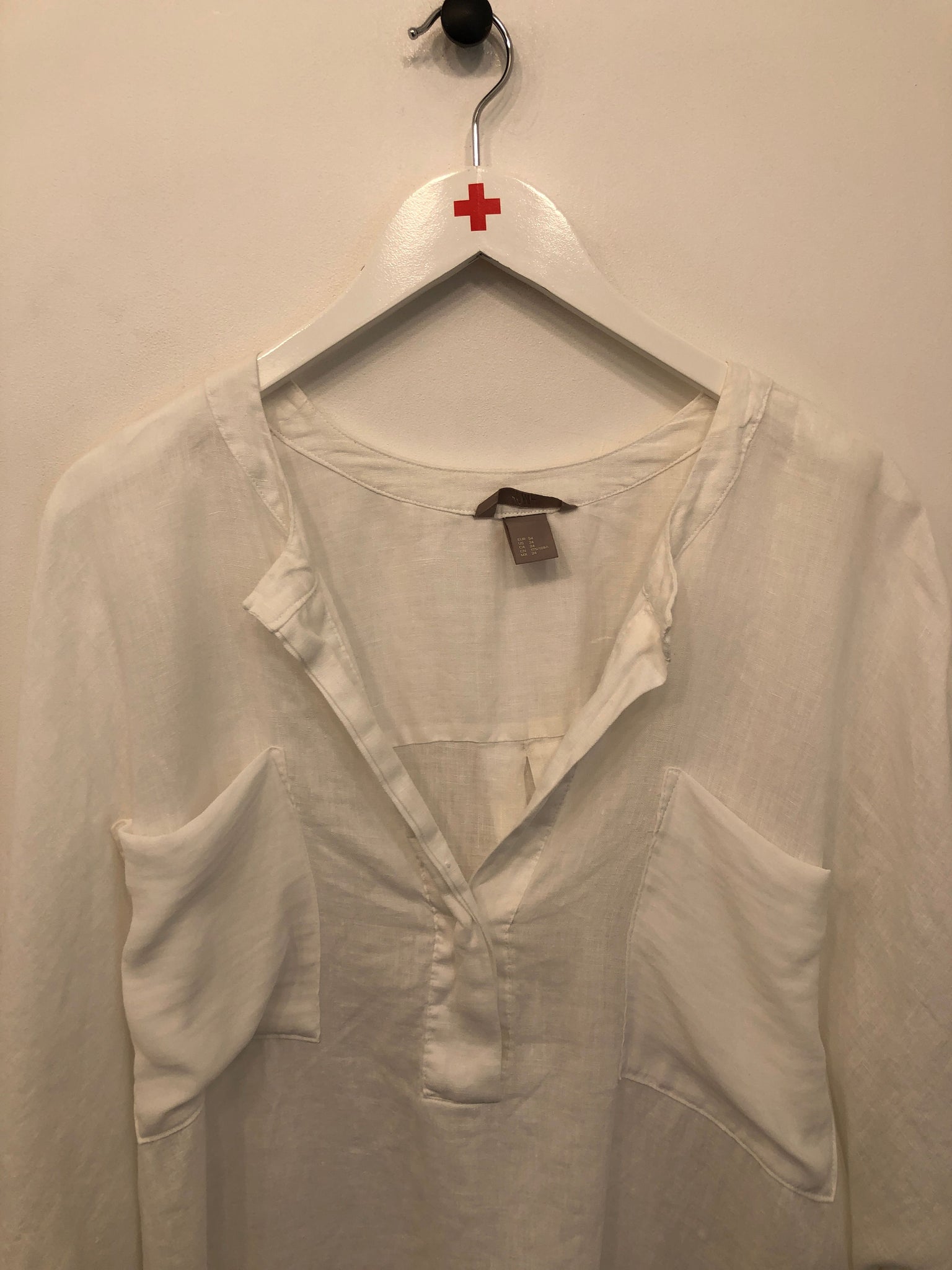 Pæn bluse med stolpelukning, korte ærmer og brystlommer.