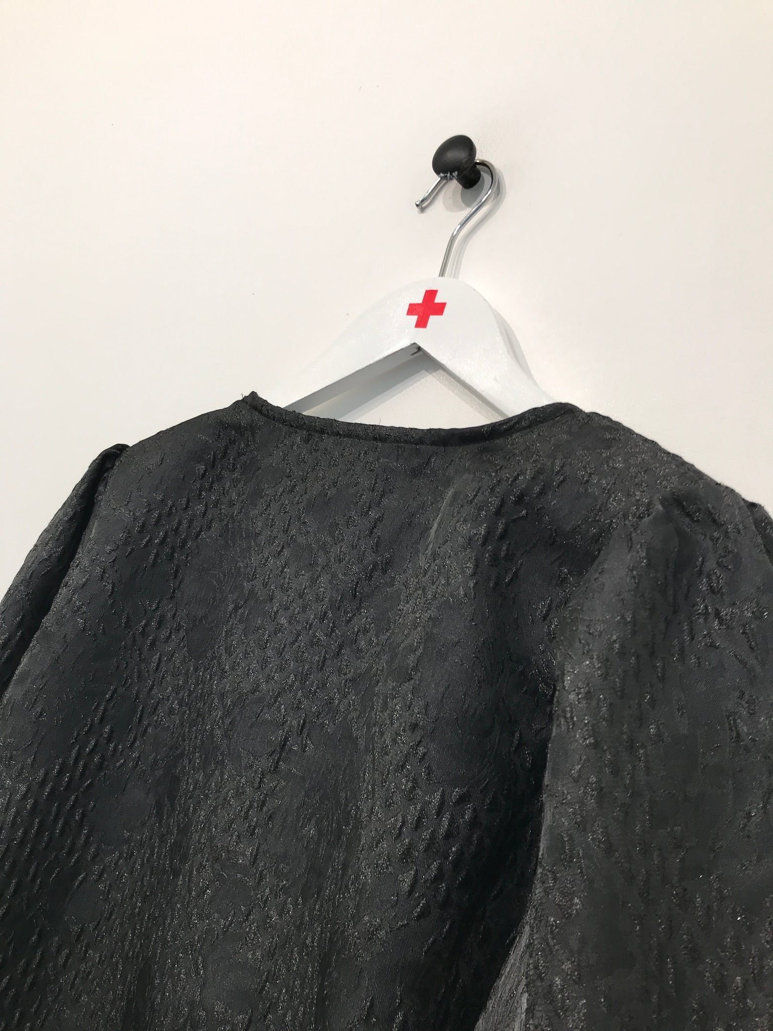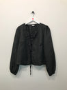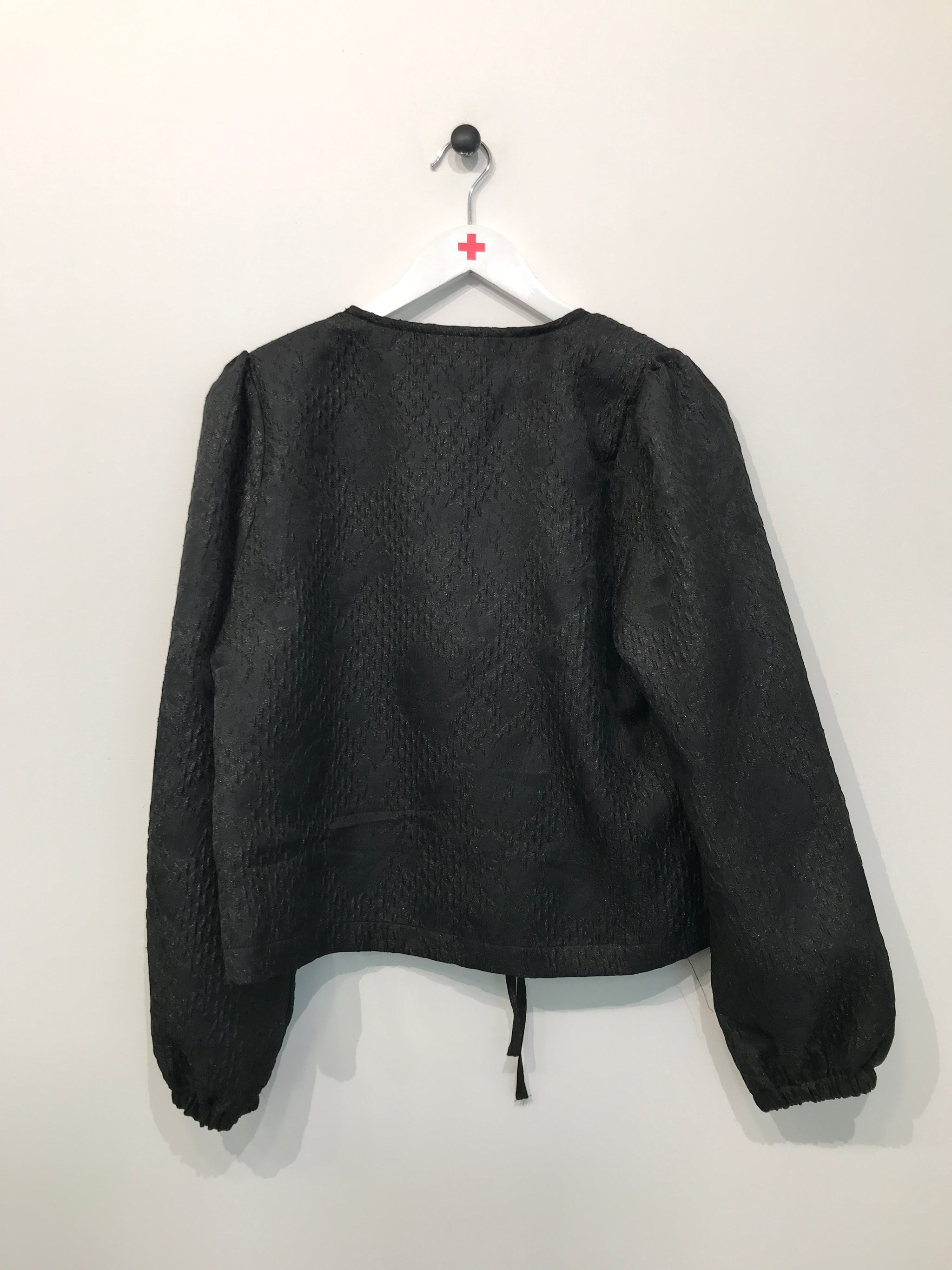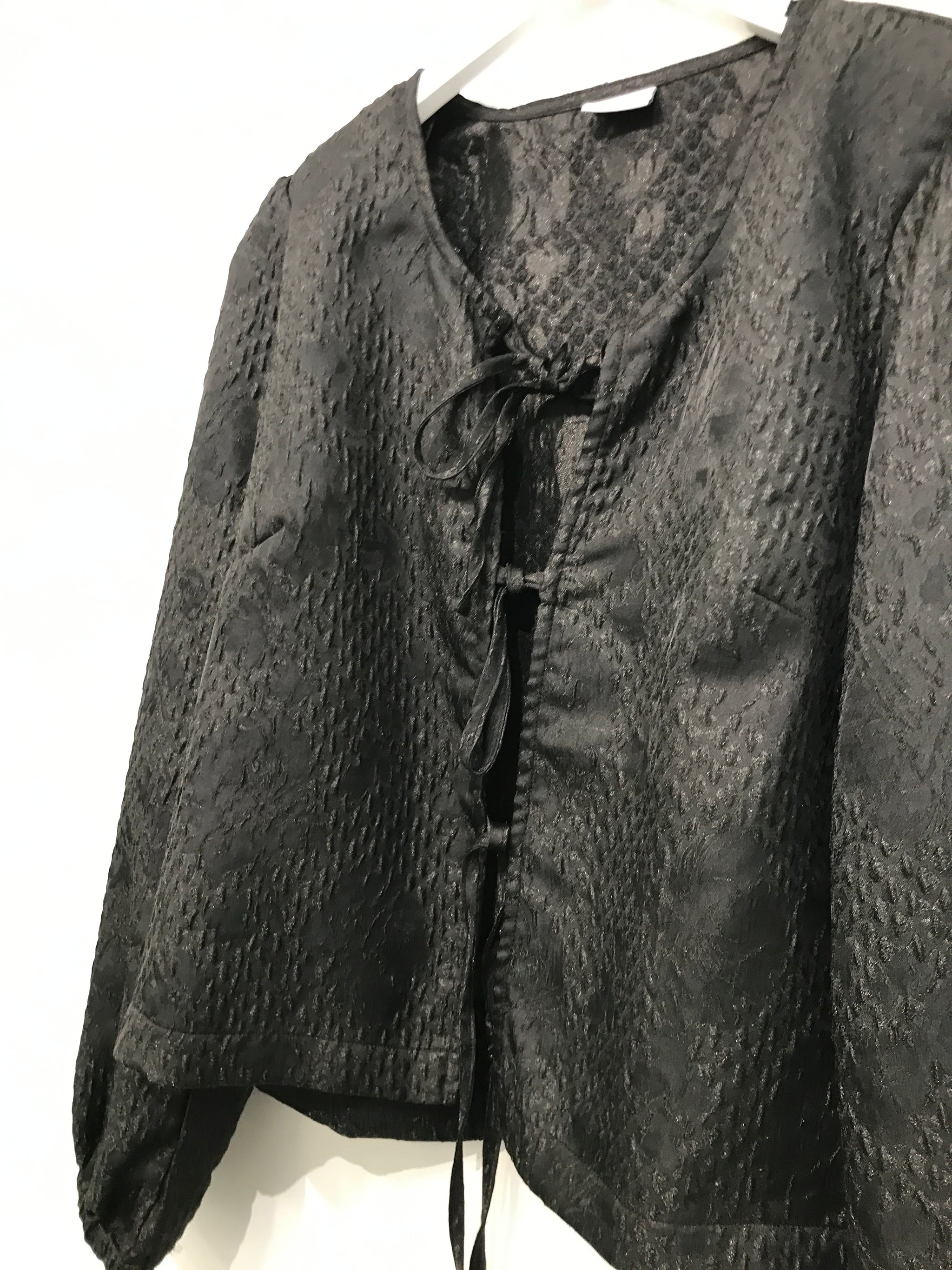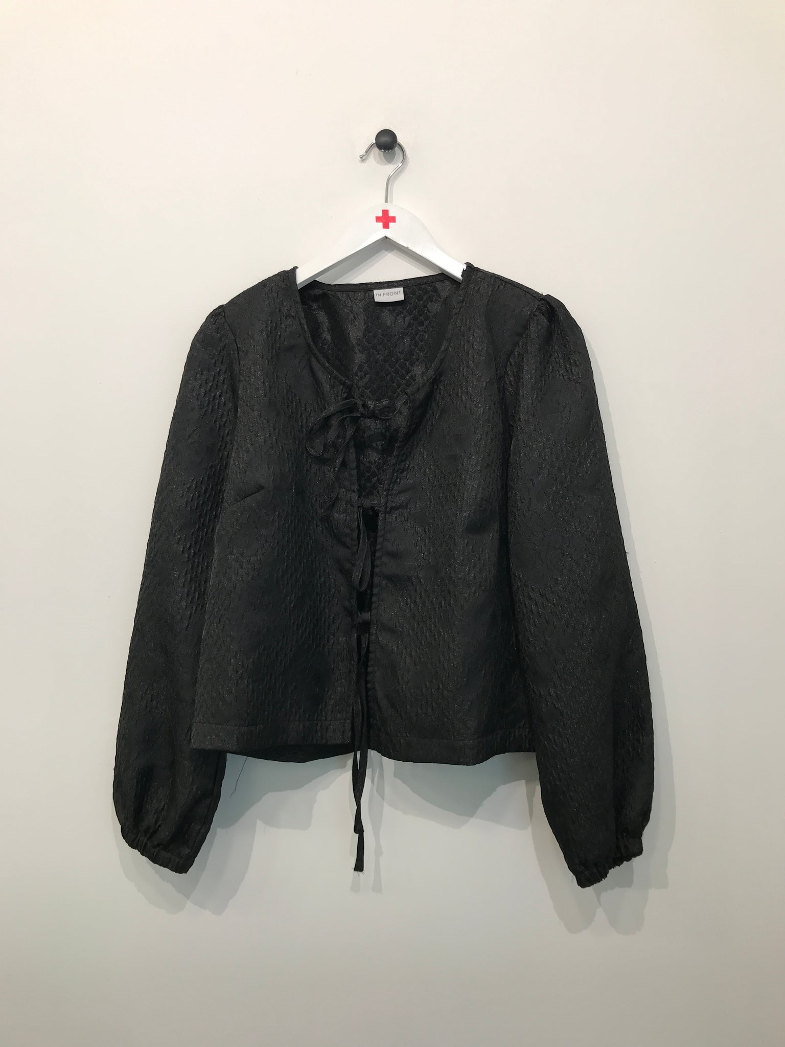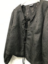 Bluse med rund halsudskæring, bindebåndslukning på front, lange ærmer med elastikkant.