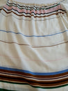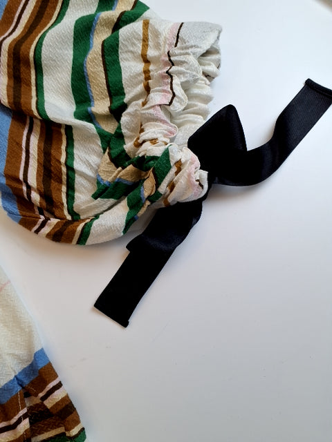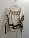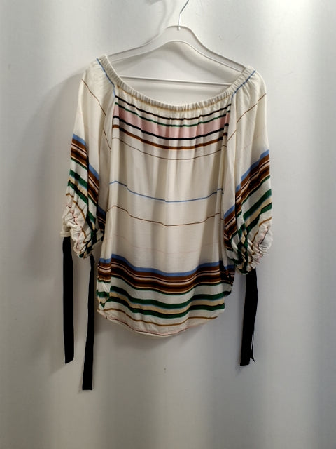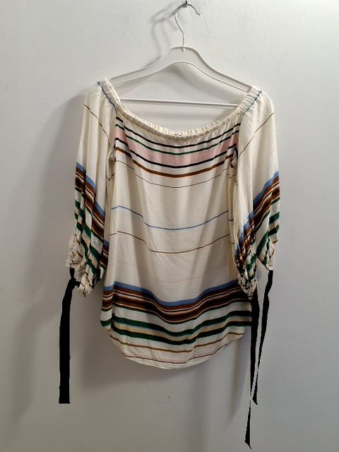R757 Blusen har en løstsiddende pasform med off-shoulder design og rummelige ærmer. Den er dekoreret med striber i forskellige farver og har snøring ved ærmerne. Materialet blanding viskose/Mulberry Silke
