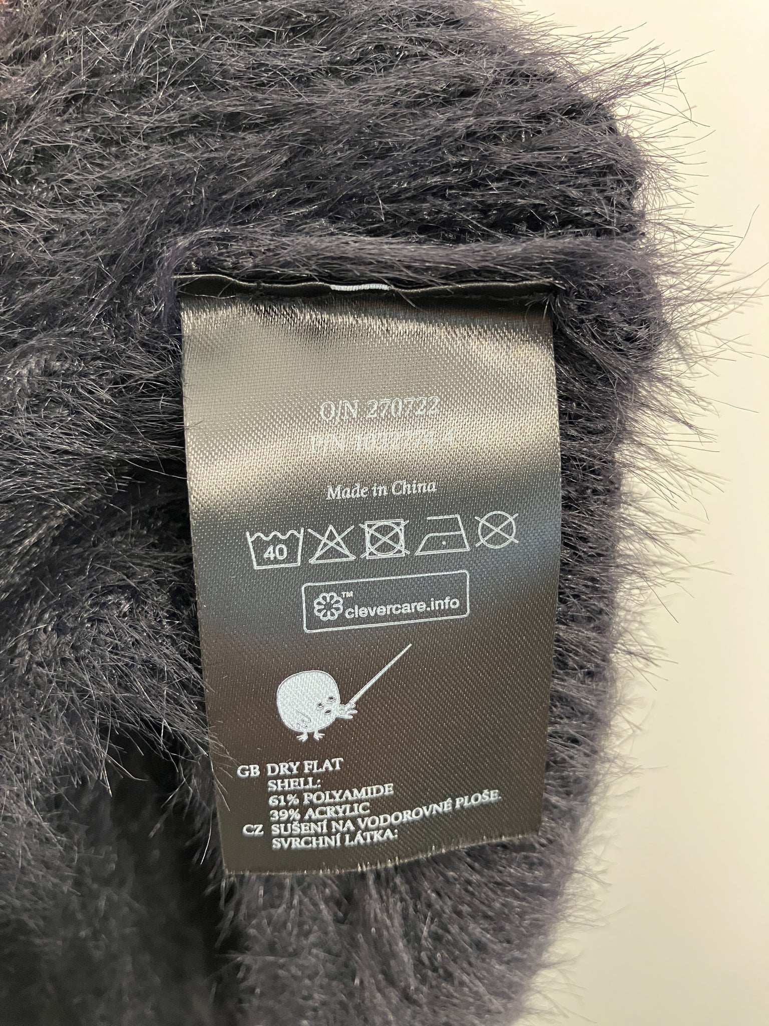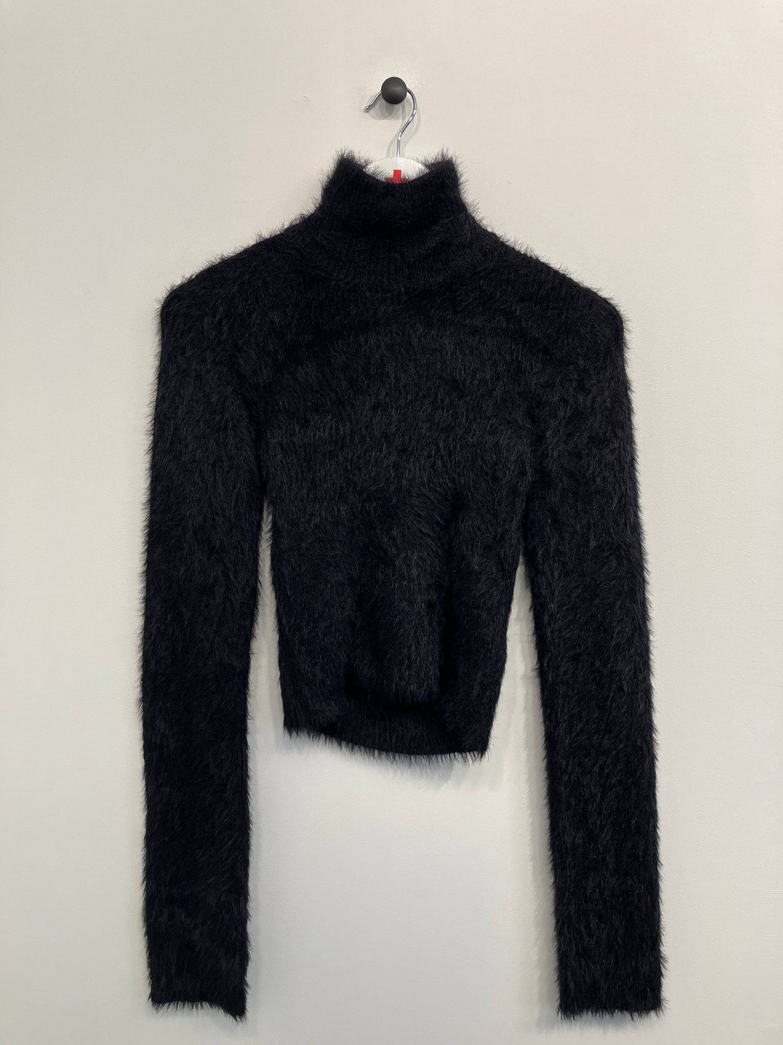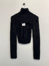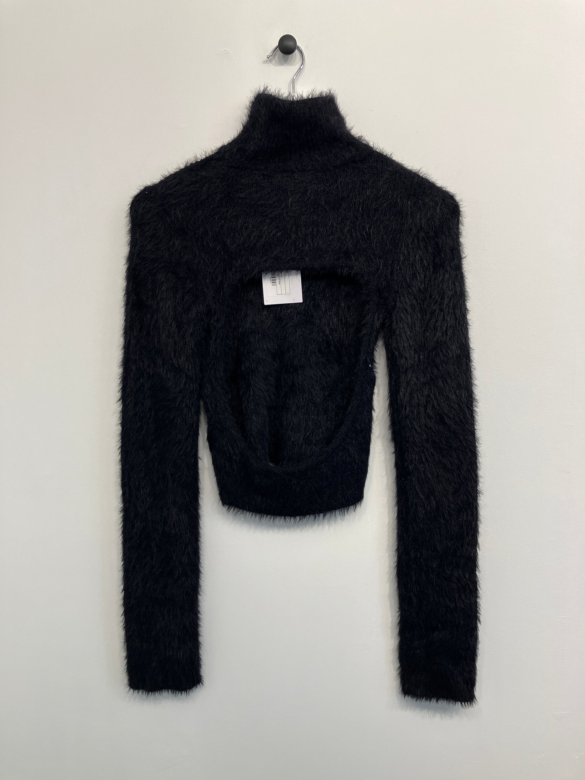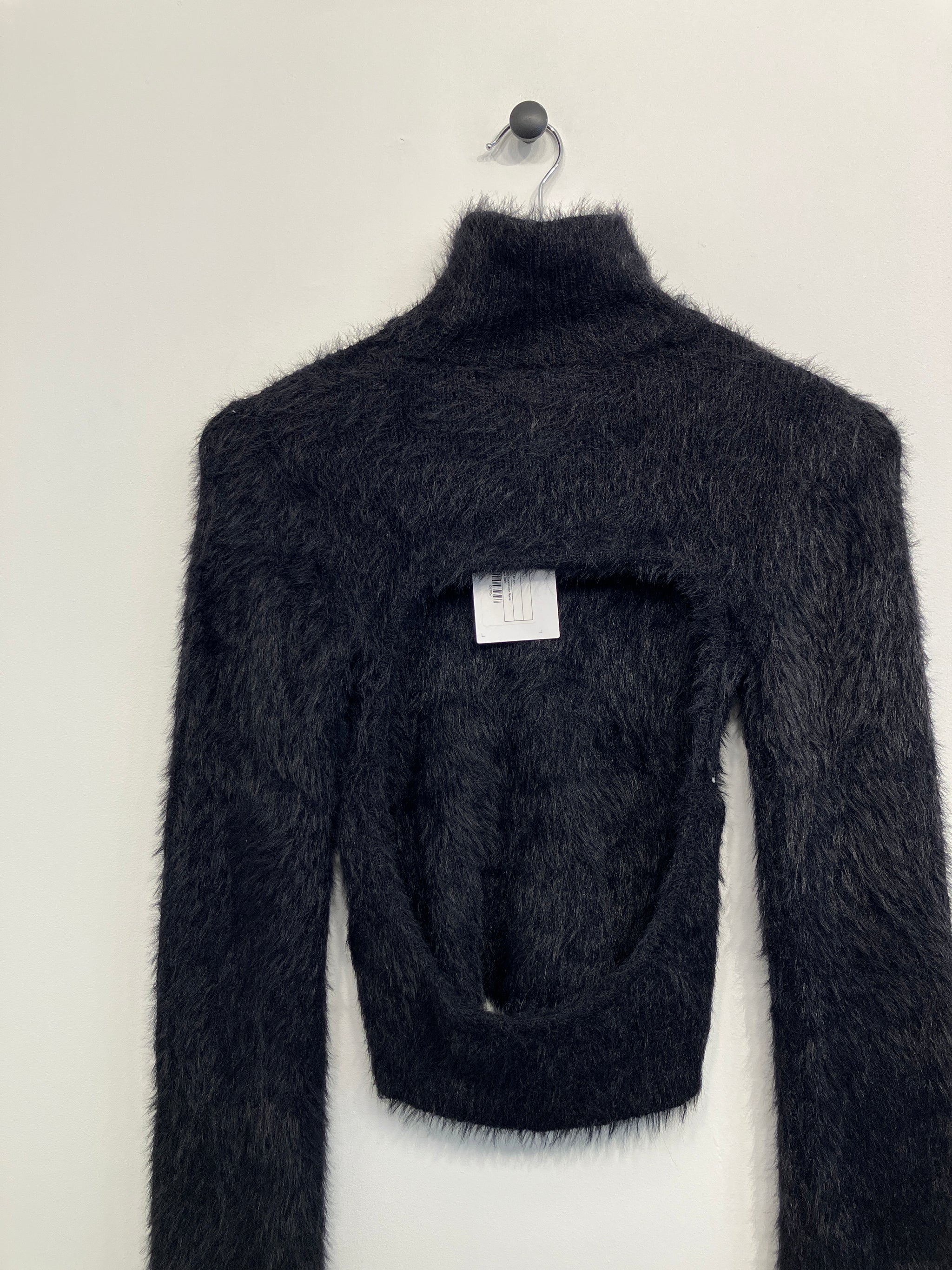 Tætsiddende bluse i plys stof med høj hals, åben ryg og lange ærmer.
