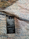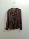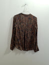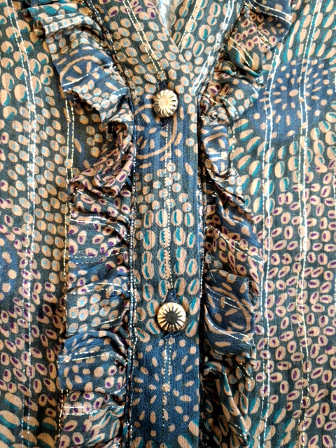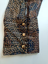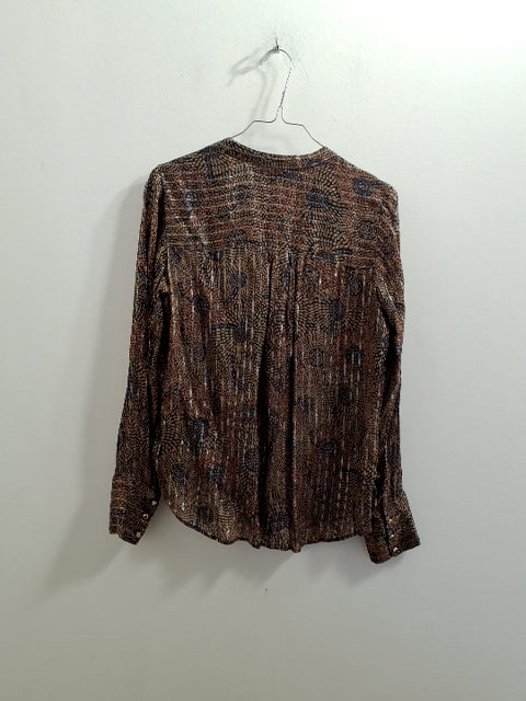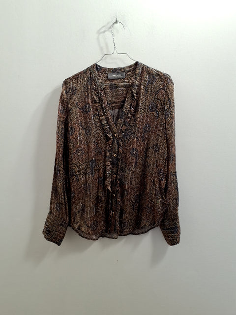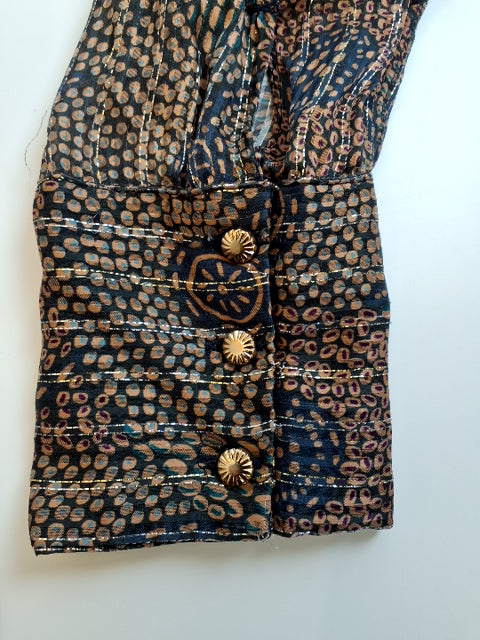 O214 Blusen er mønstret med smalle guldstriber og knapper foran. Den er let og luftig.