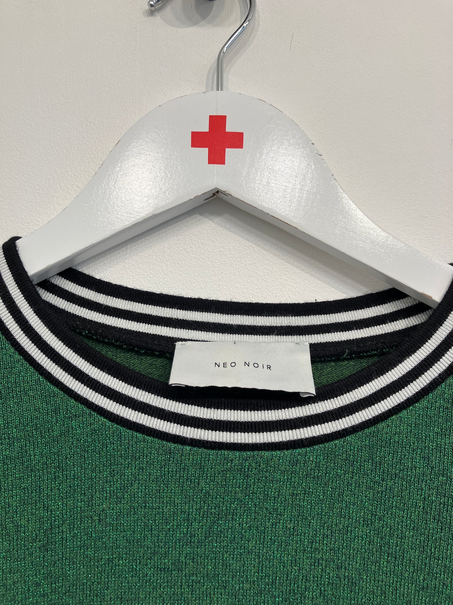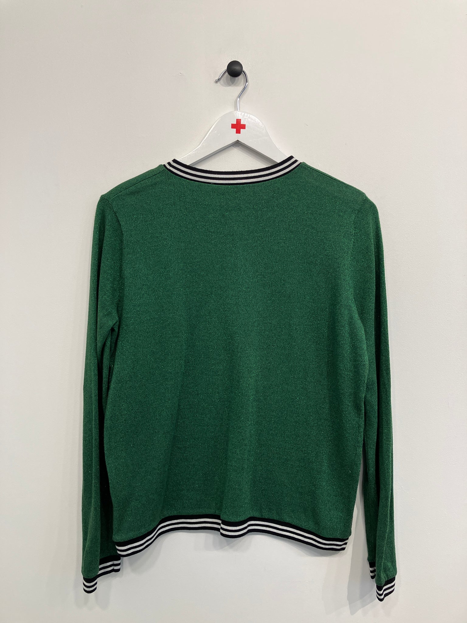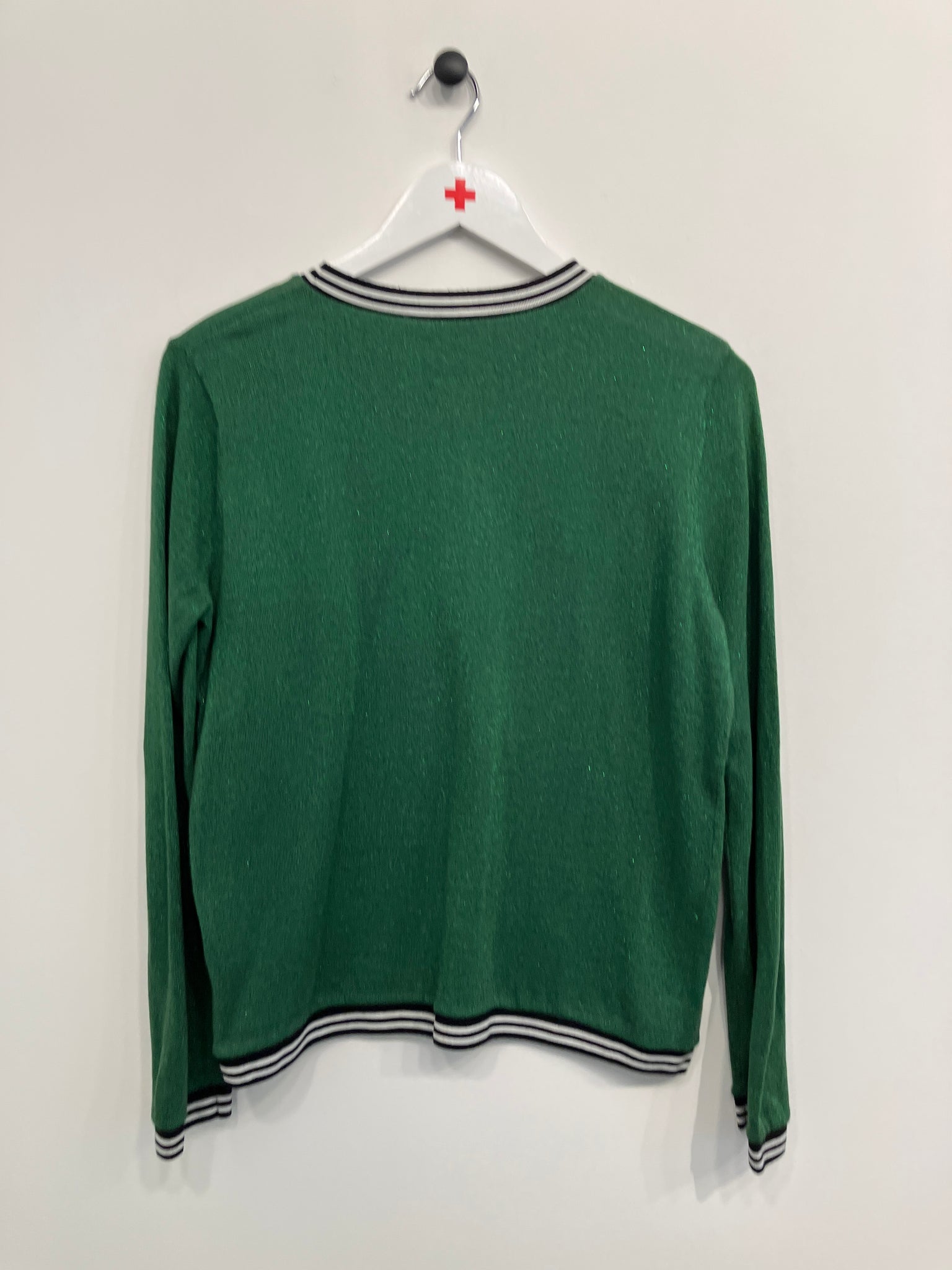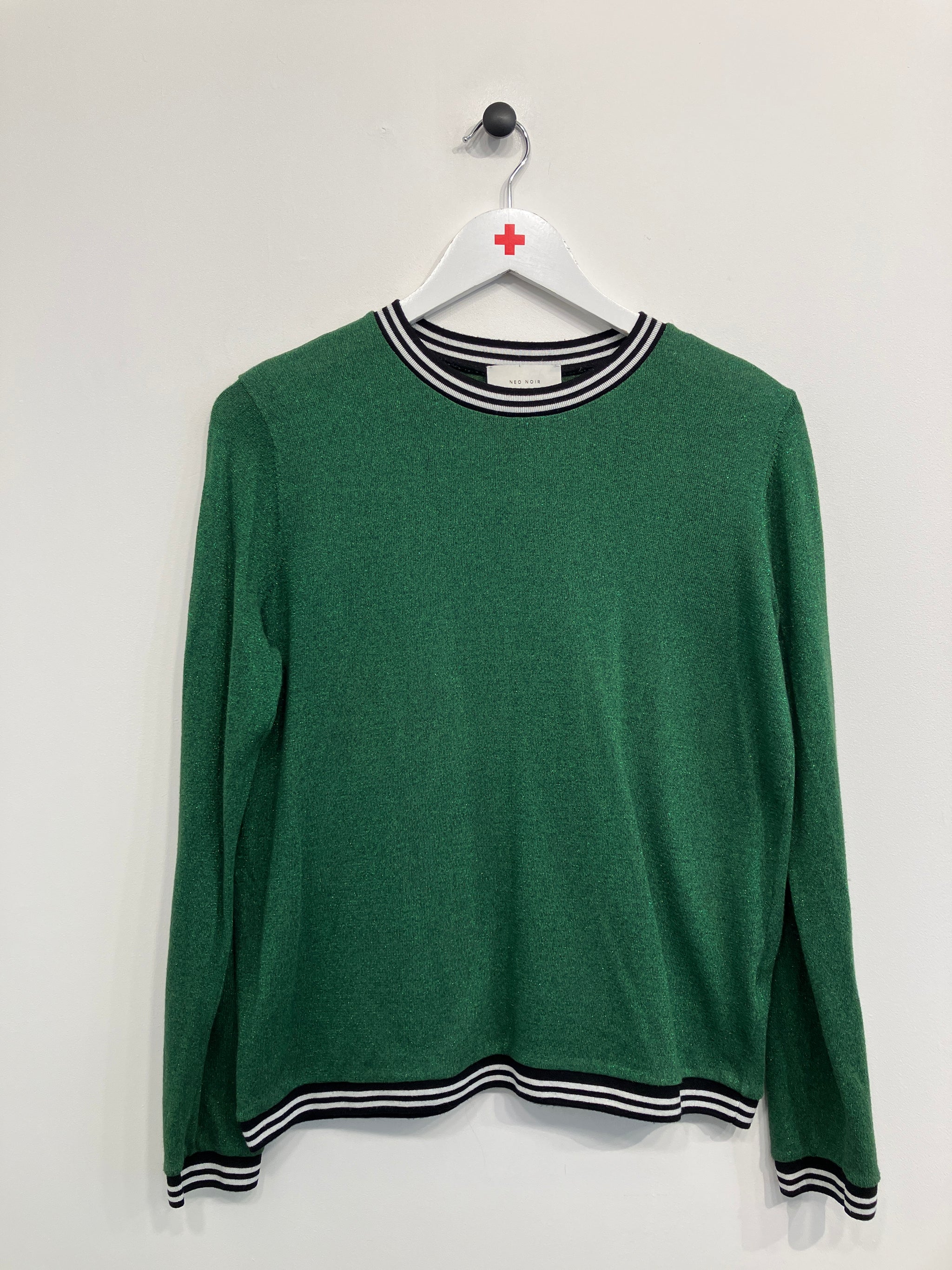 Bluse med rund hals og lange ærmer. Stoffet er i let glimmer og blusen har sort/hvid stribede kanter ved hals, ærmer og i bund.