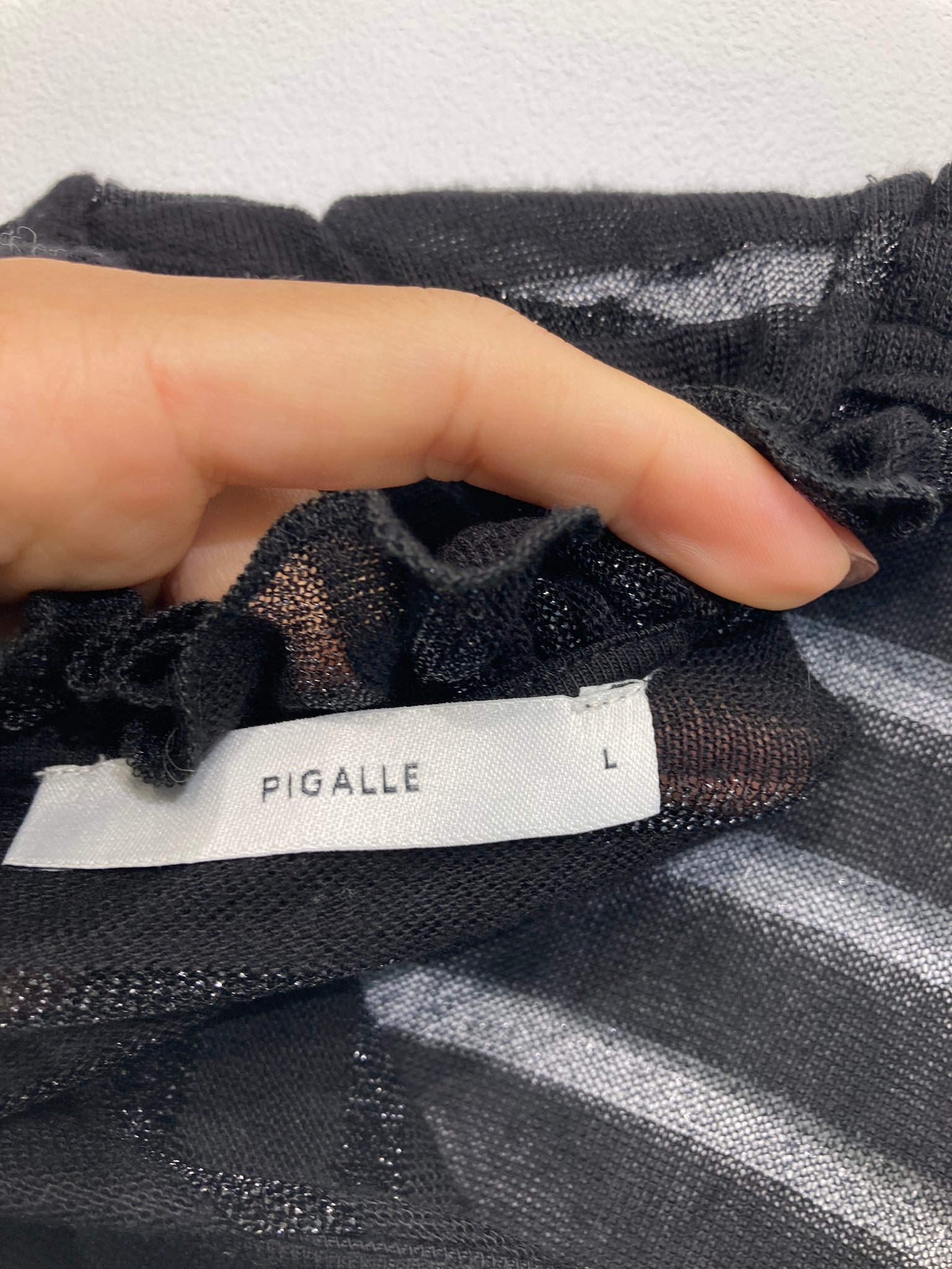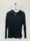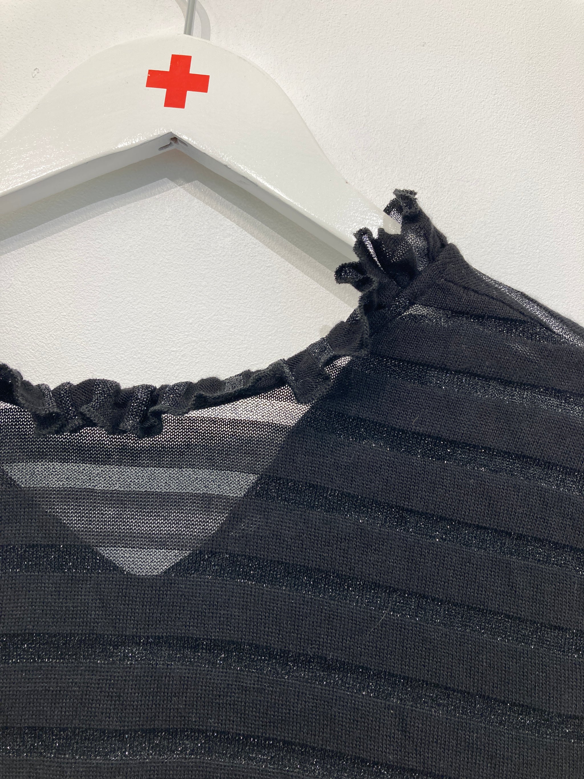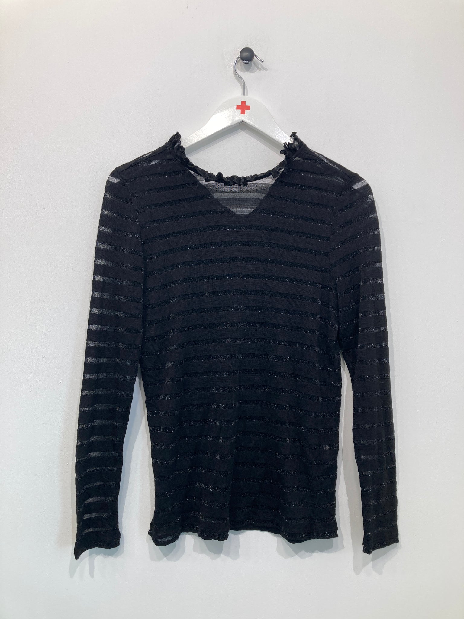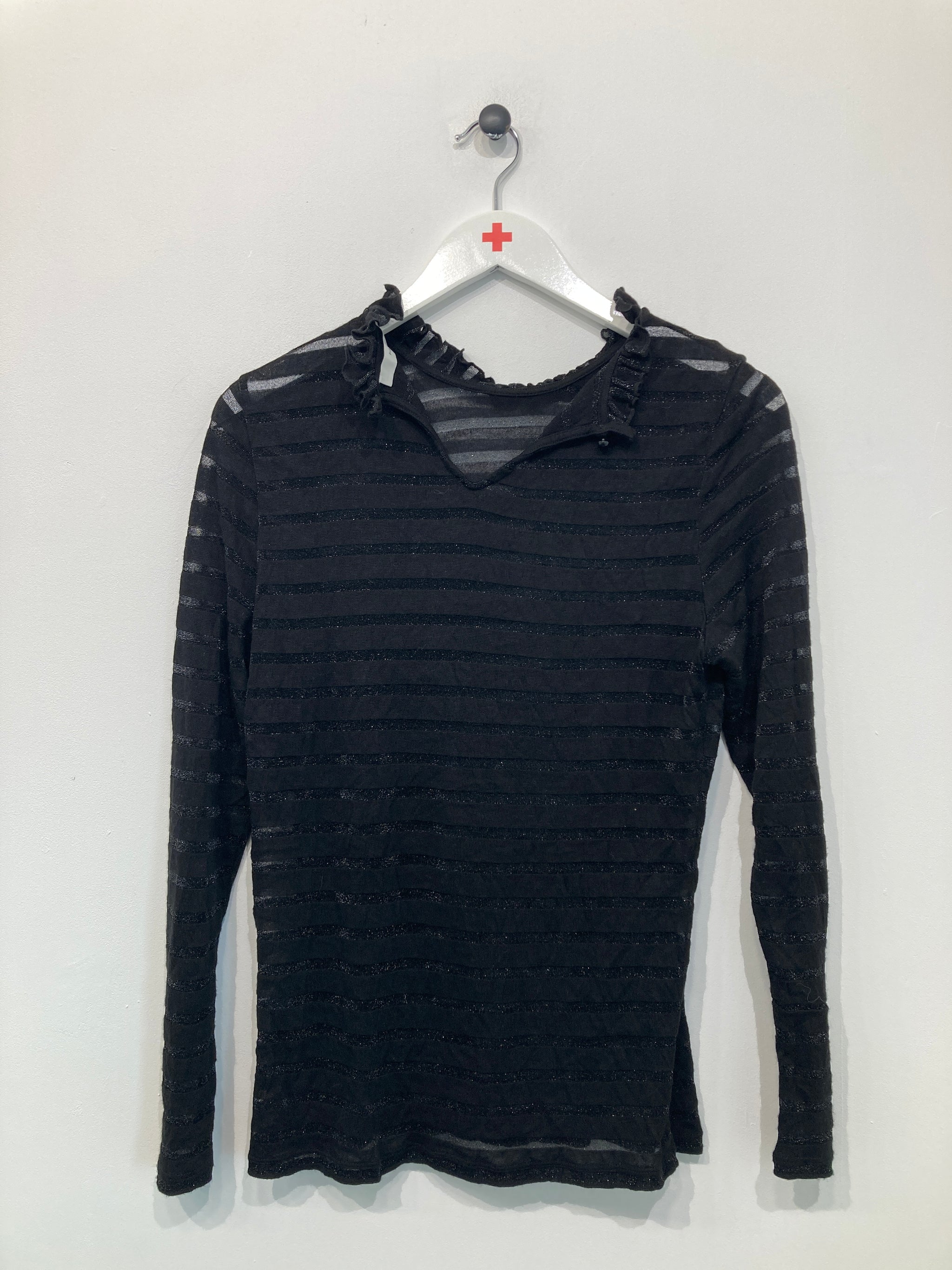 Bluse med flæse og knaplukning i hals, lange ærmer. Blusen er gennemsigtig.
