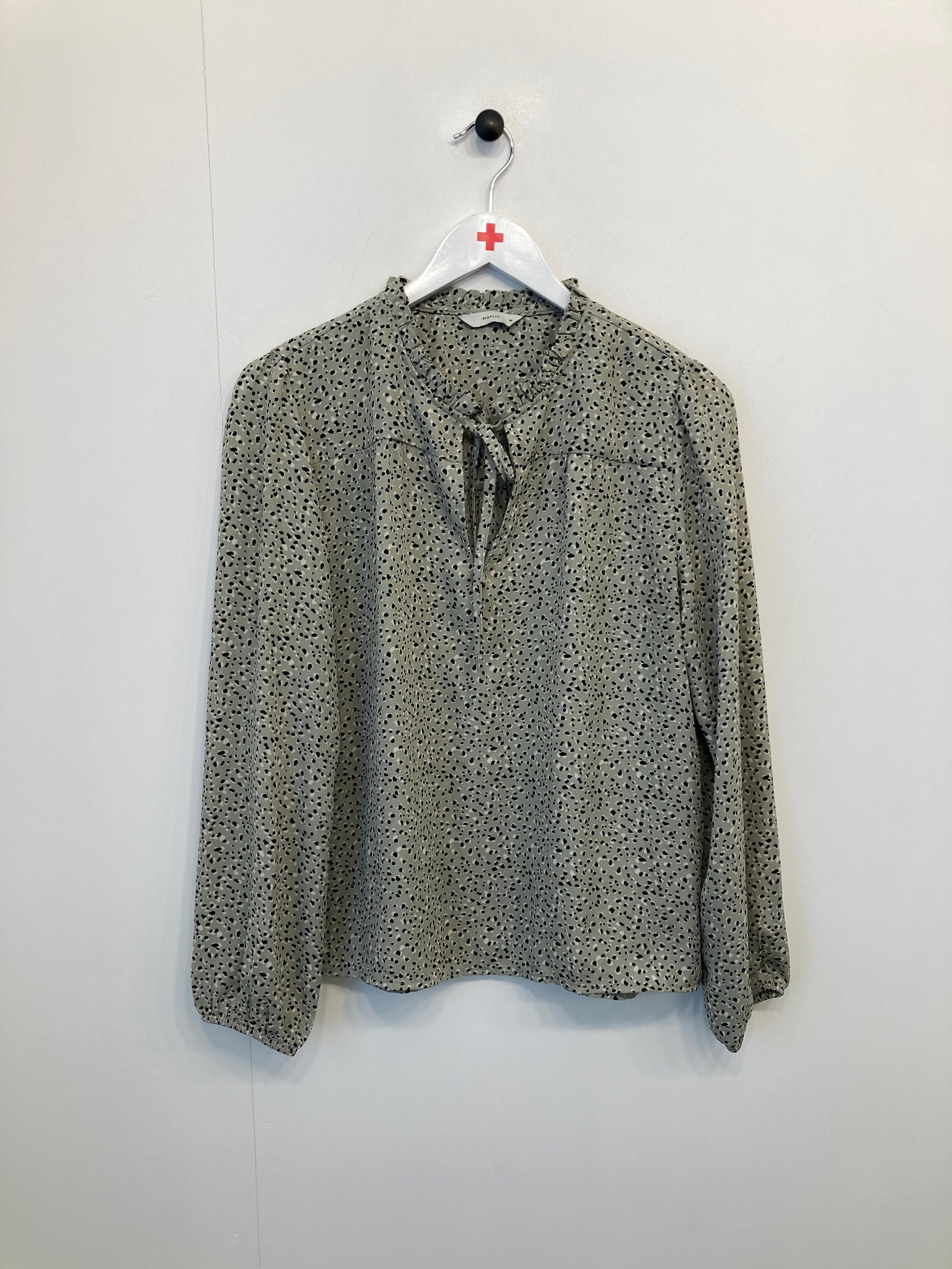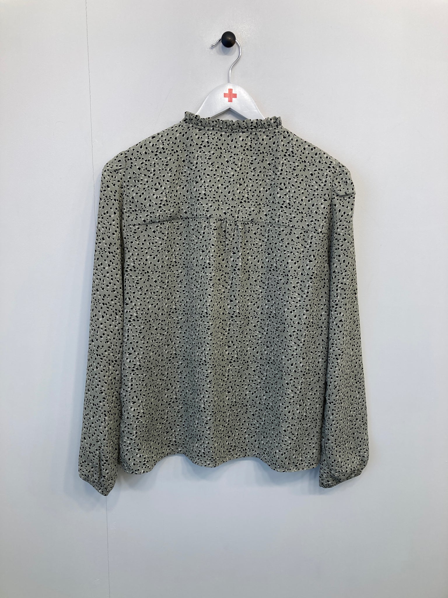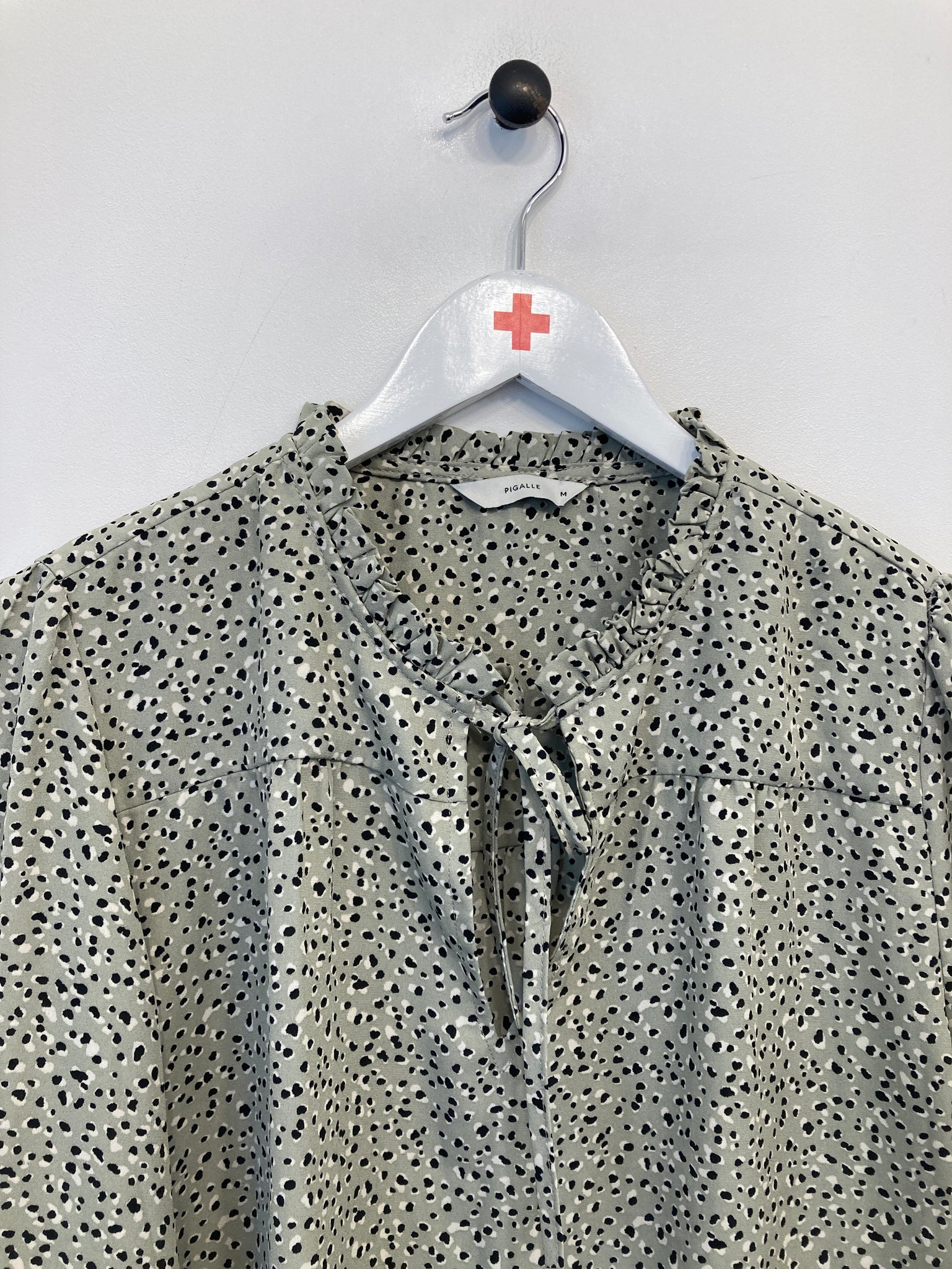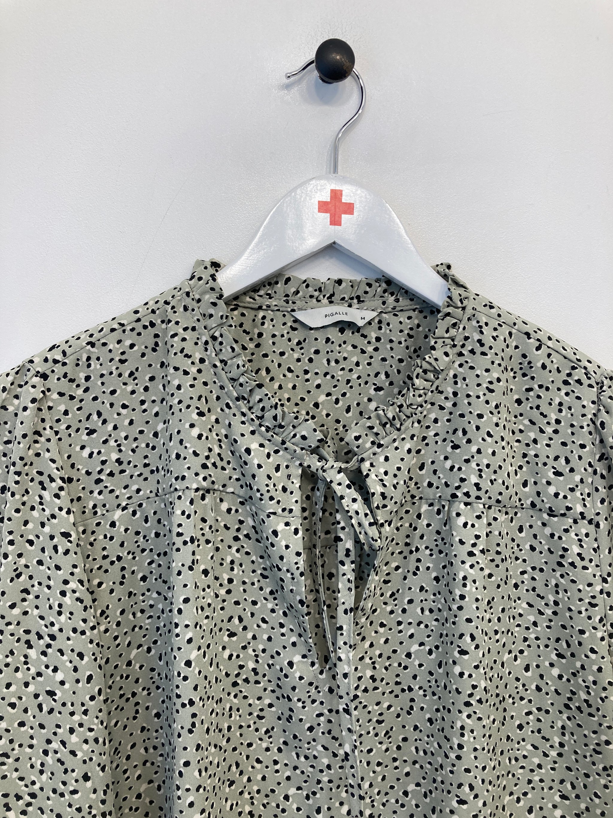 Flot langærmet bluse fra Pigalle med prikket mønster og fin krave med bindebånd.