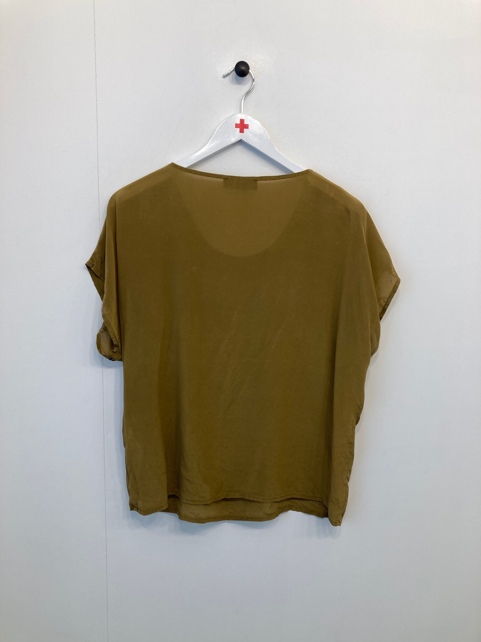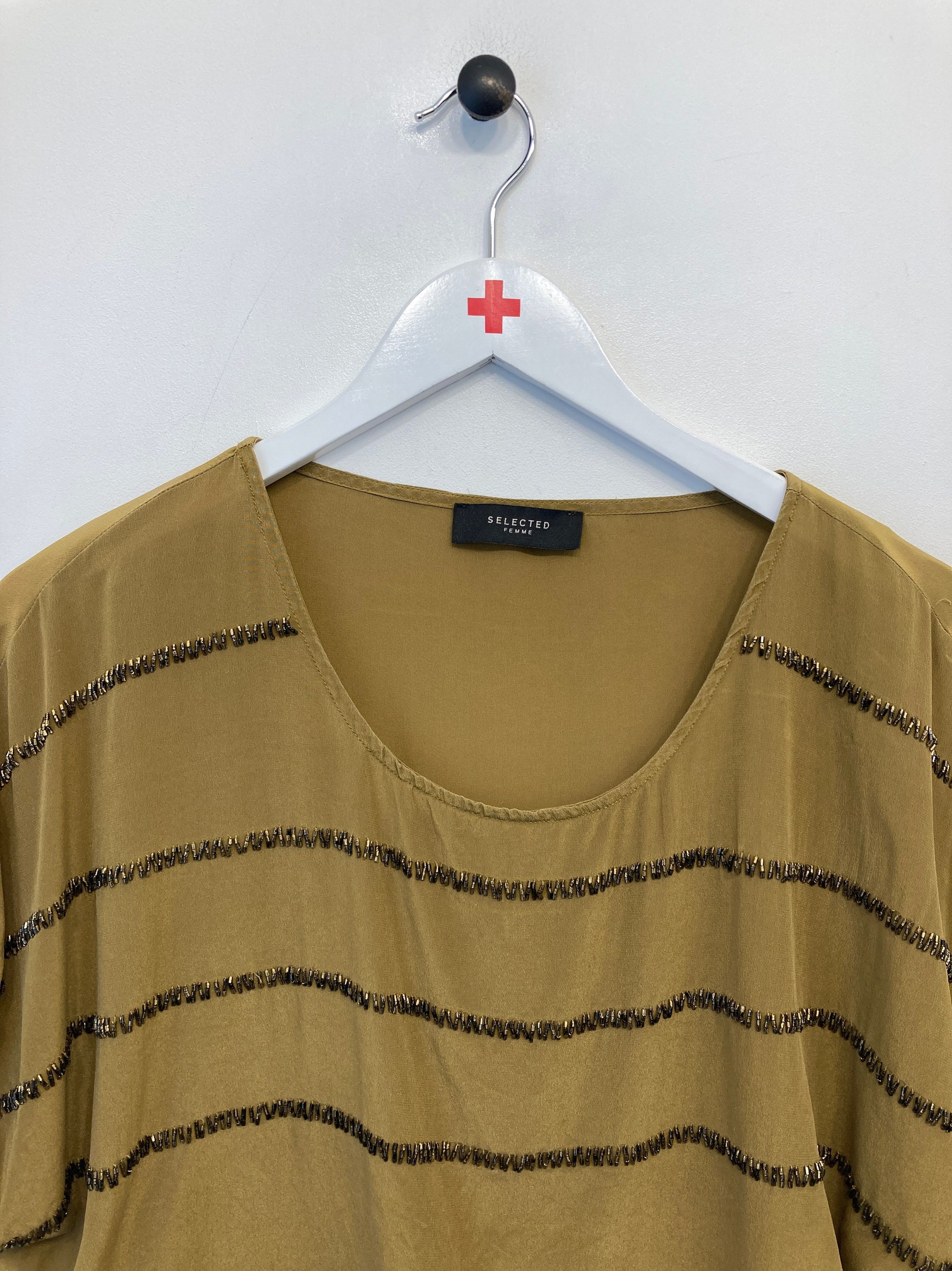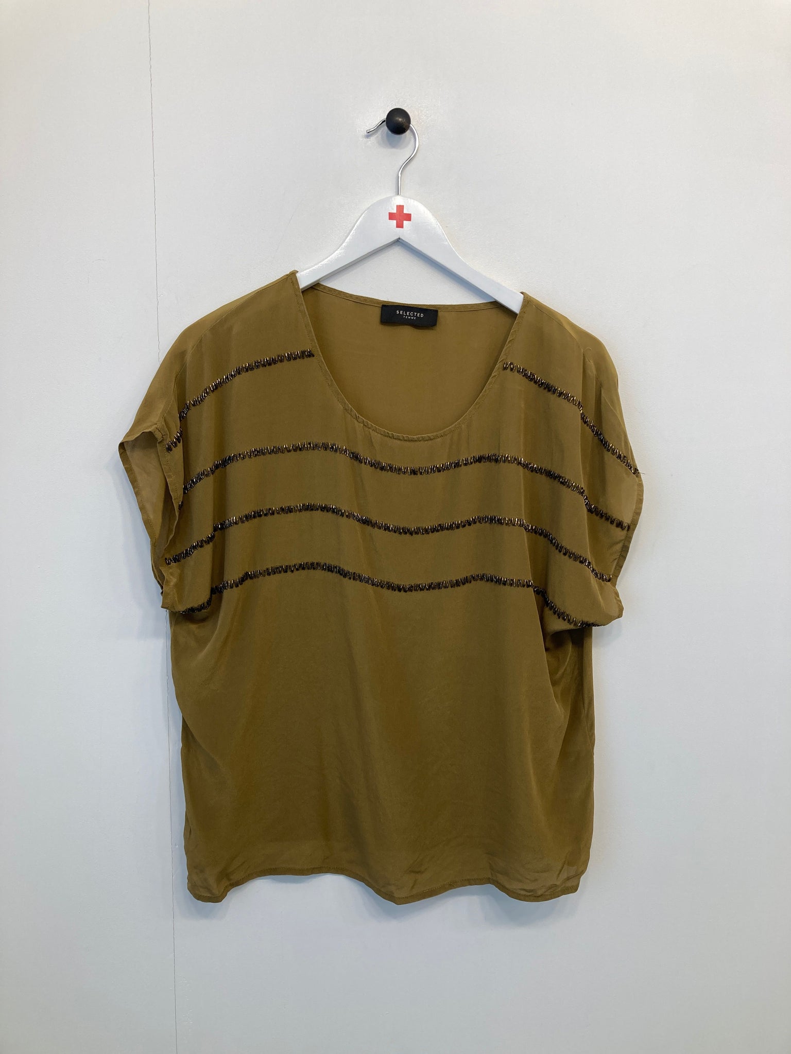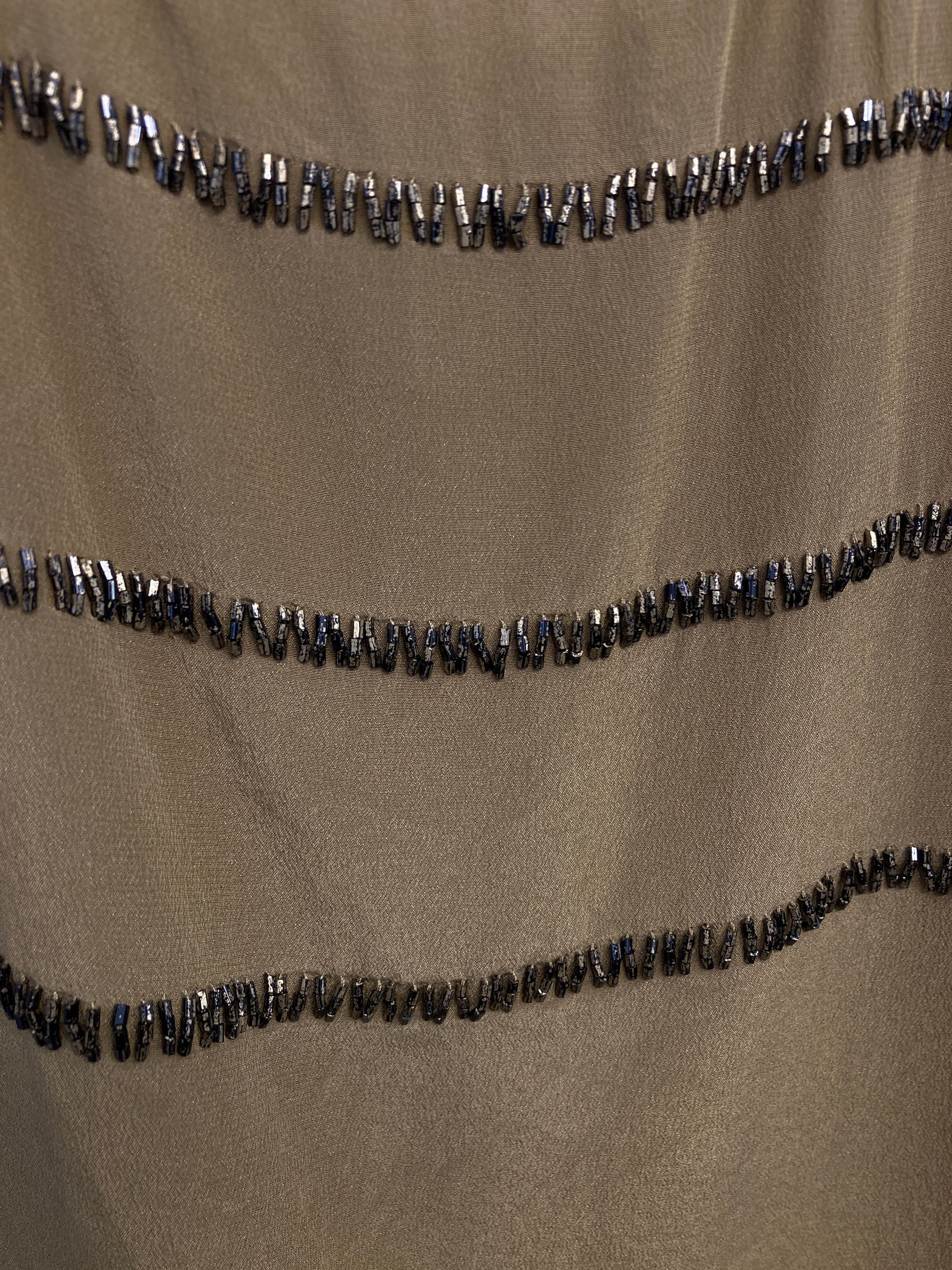 Skøn olivengrøn silkebluse med smarte pynte striber