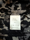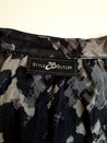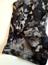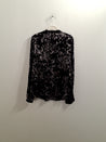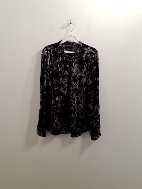 O433 Blusen har lange ærmer og en blød, glat overflade med et mønster i sort og g gråt.