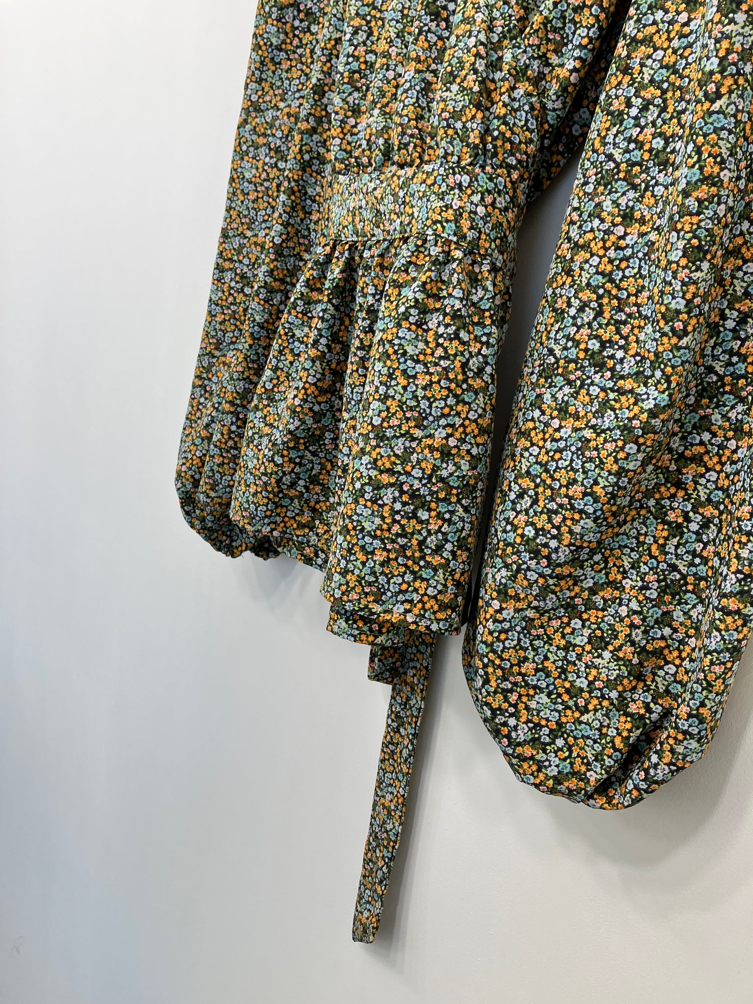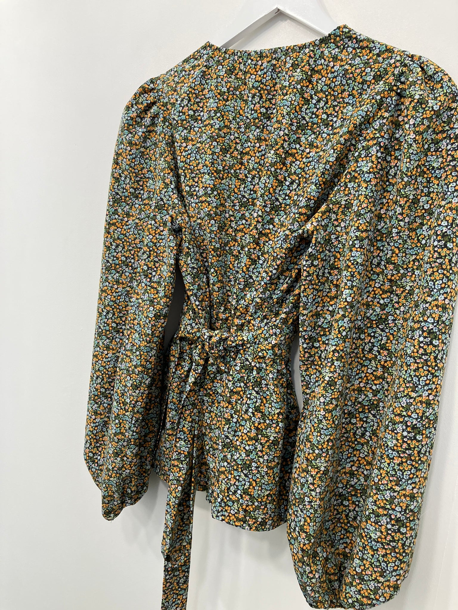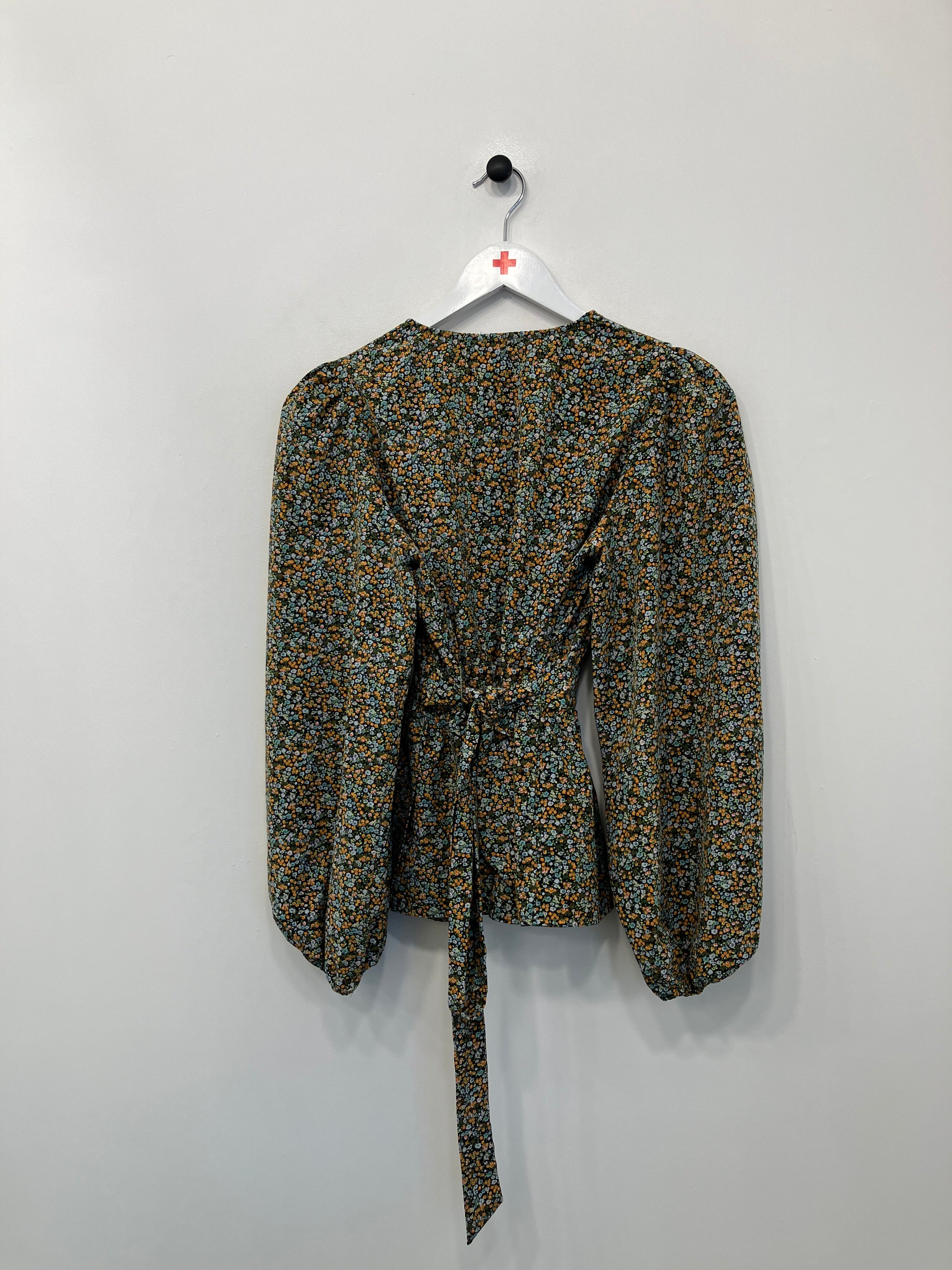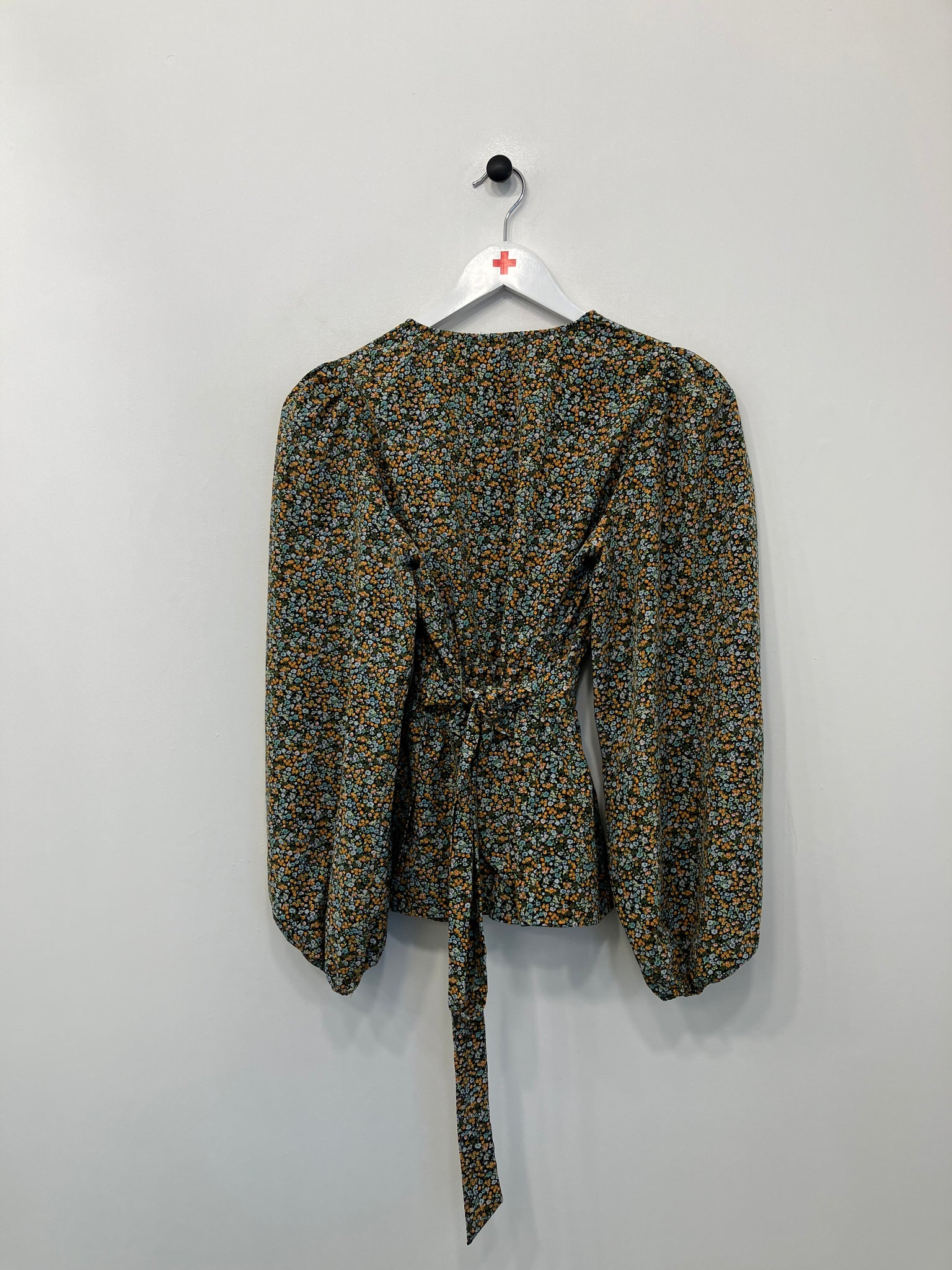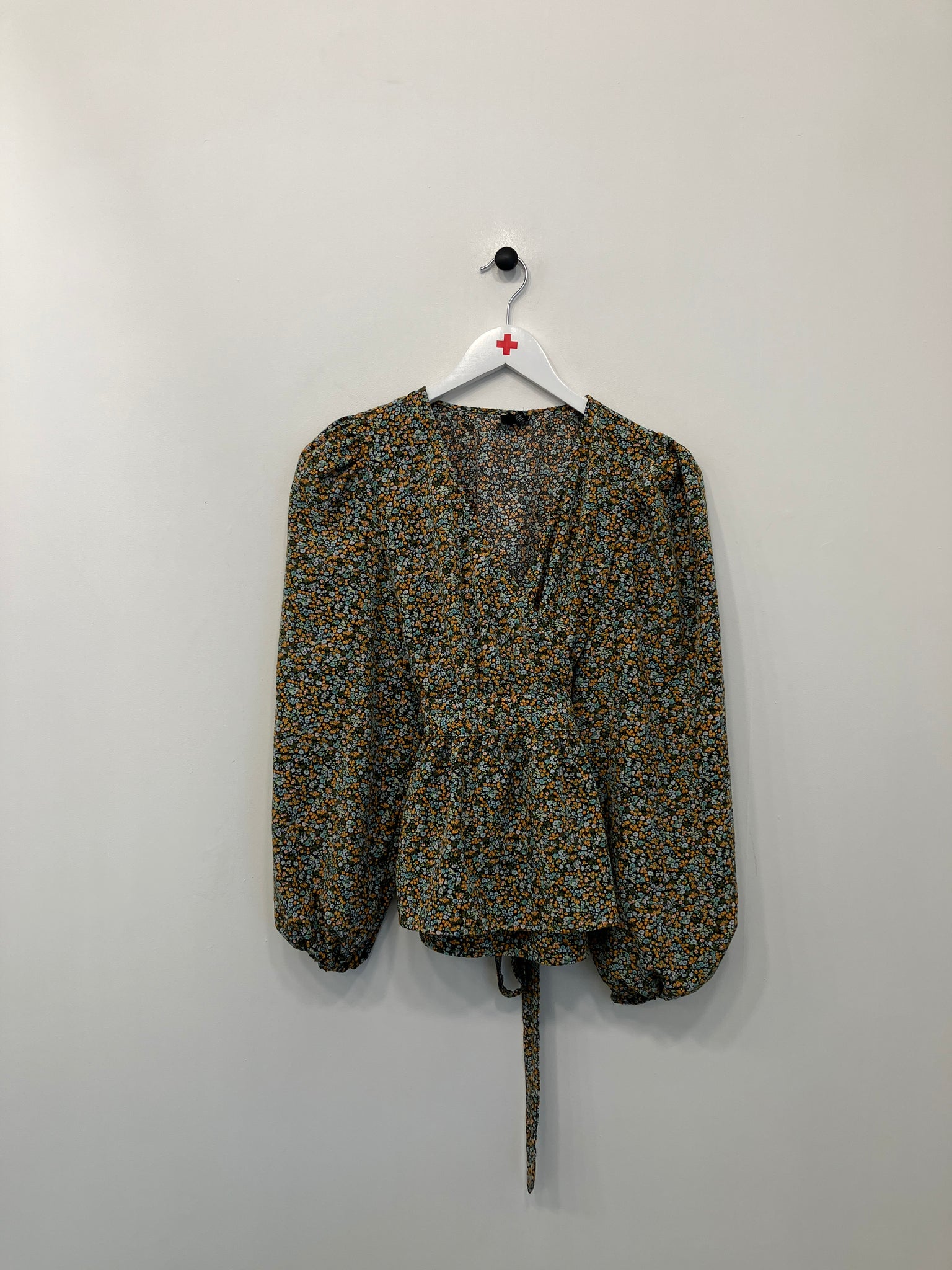 En slå-om-bluse i blomsterprint med puffede ærmer og V-udskæring. Manglende vaskemærke.