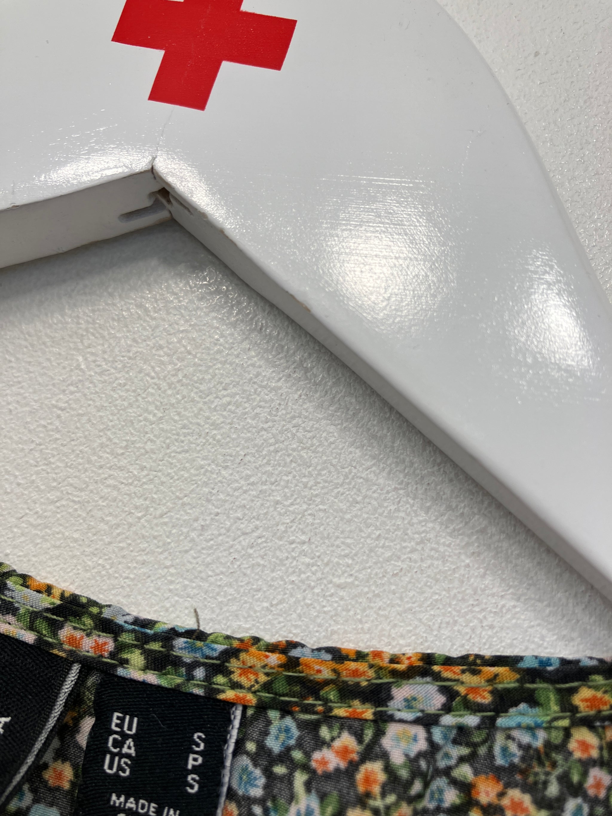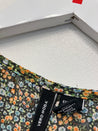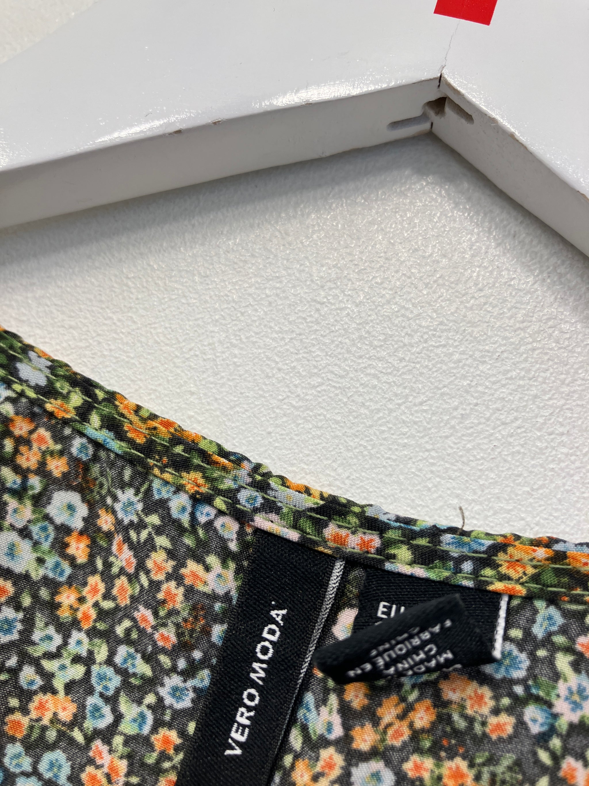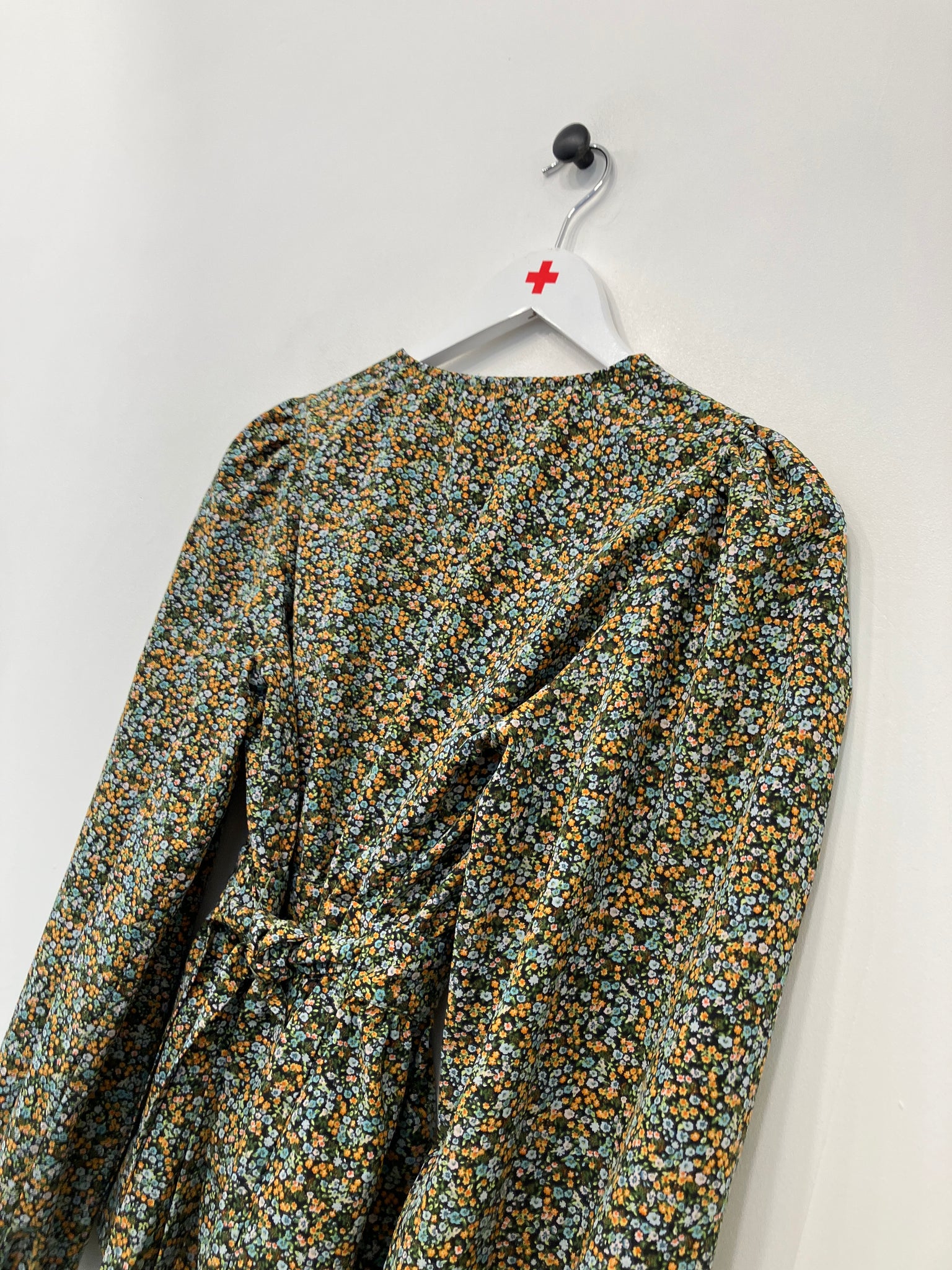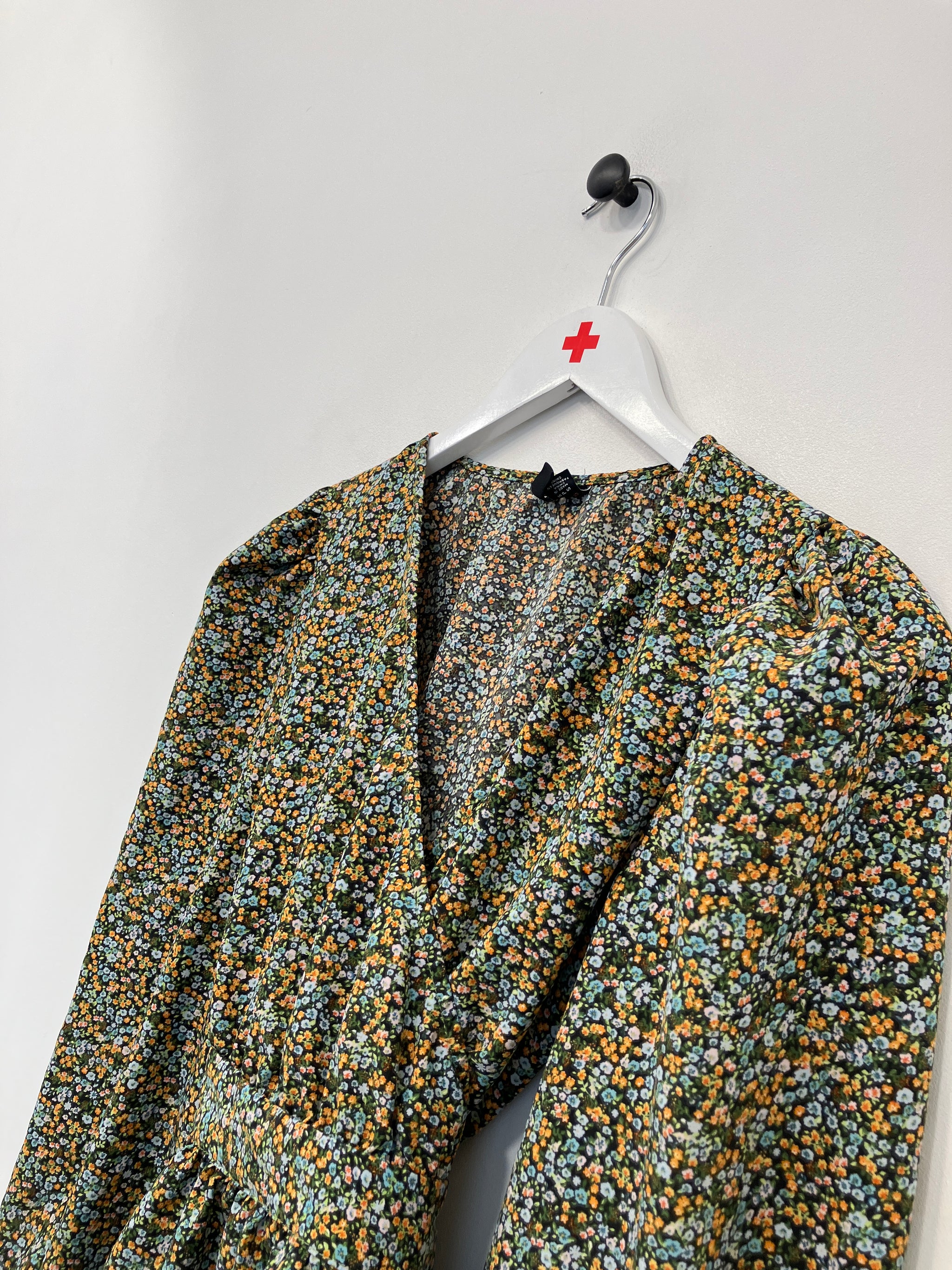 En slå-om-bluse i blomsterprint med puffede ærmer og V-udskæring. Manglende vaskemærke.
