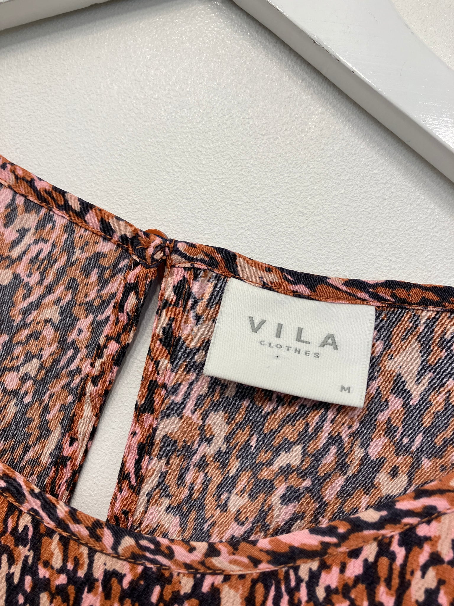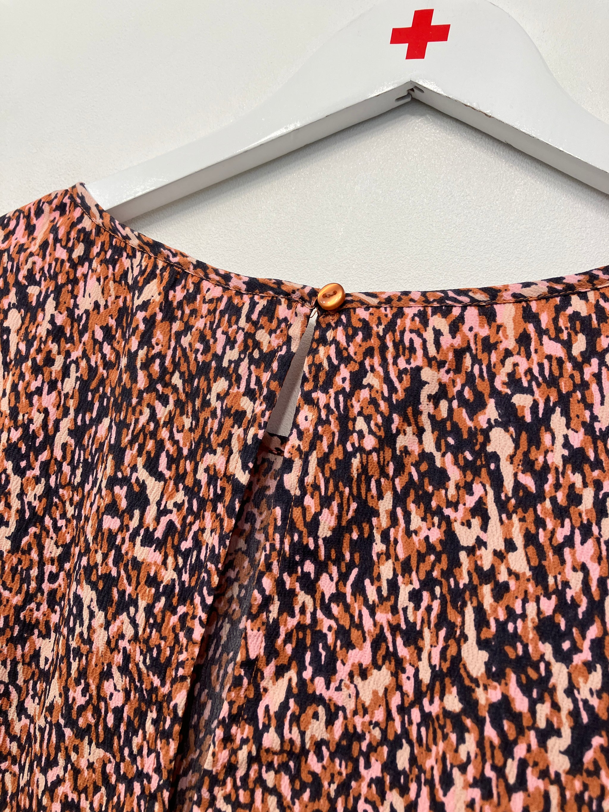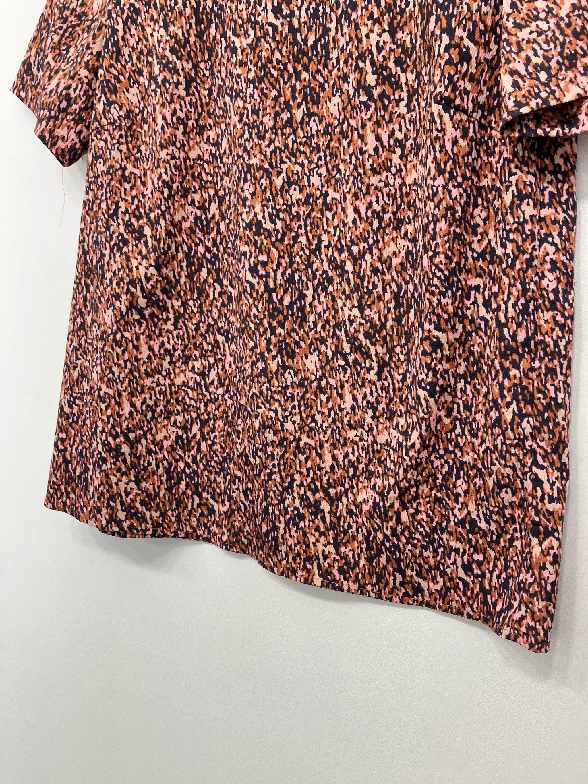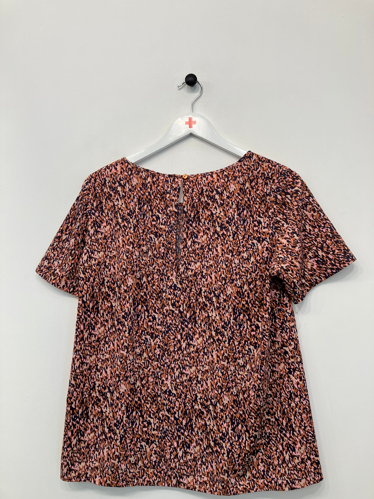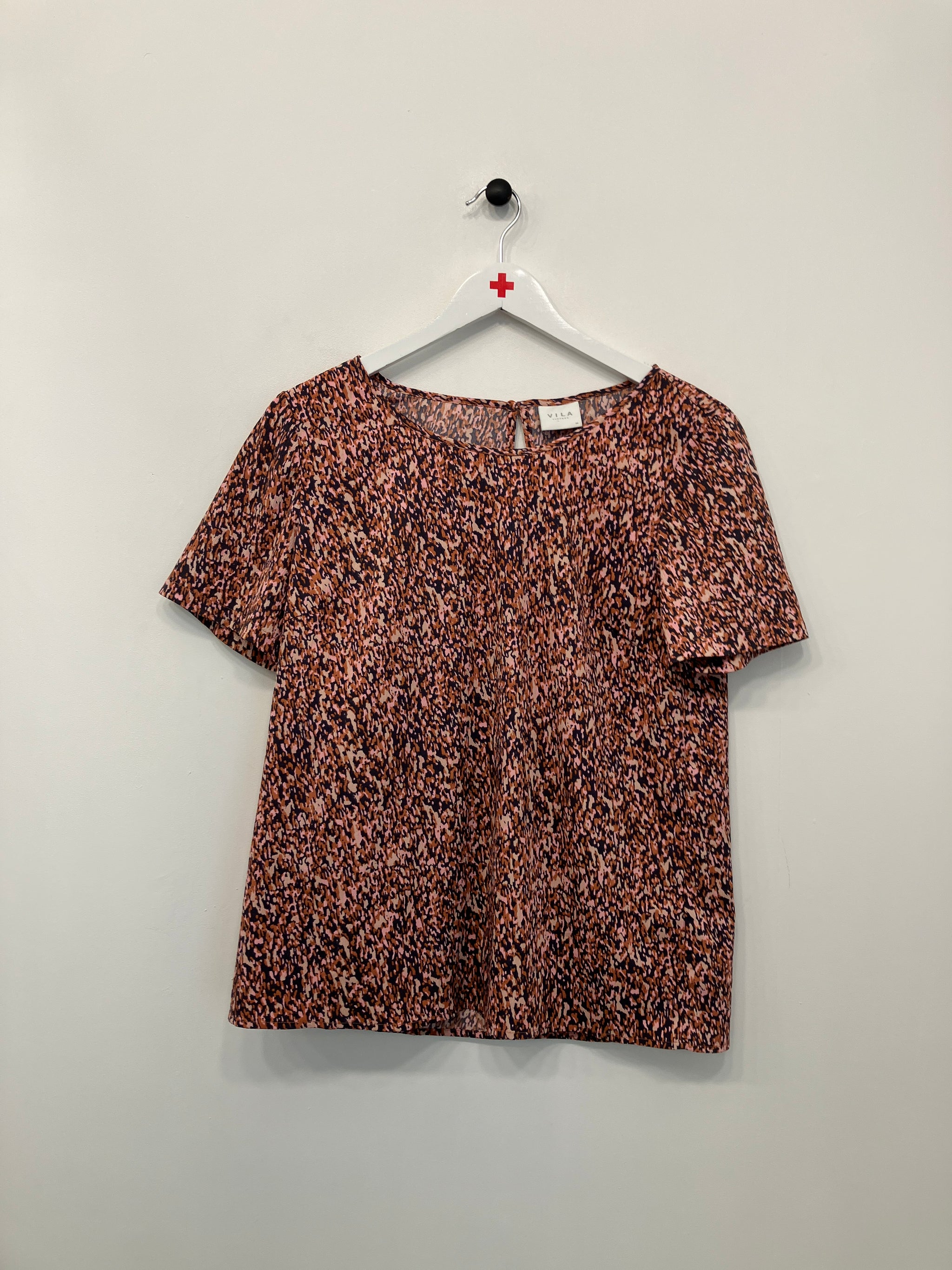 Flot brun mønstret bluse med korte ærmer. Blusen mangler vaskemærke