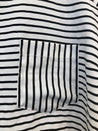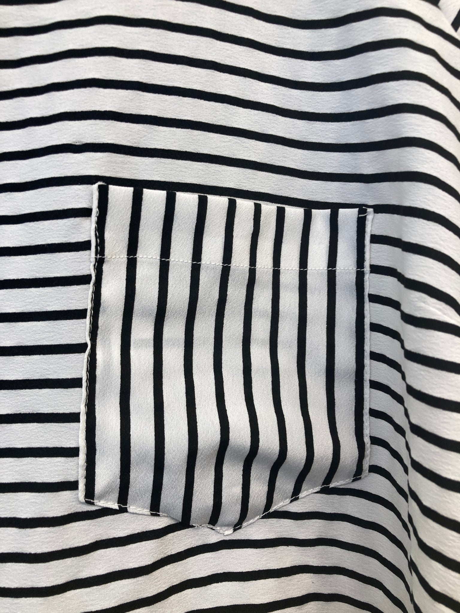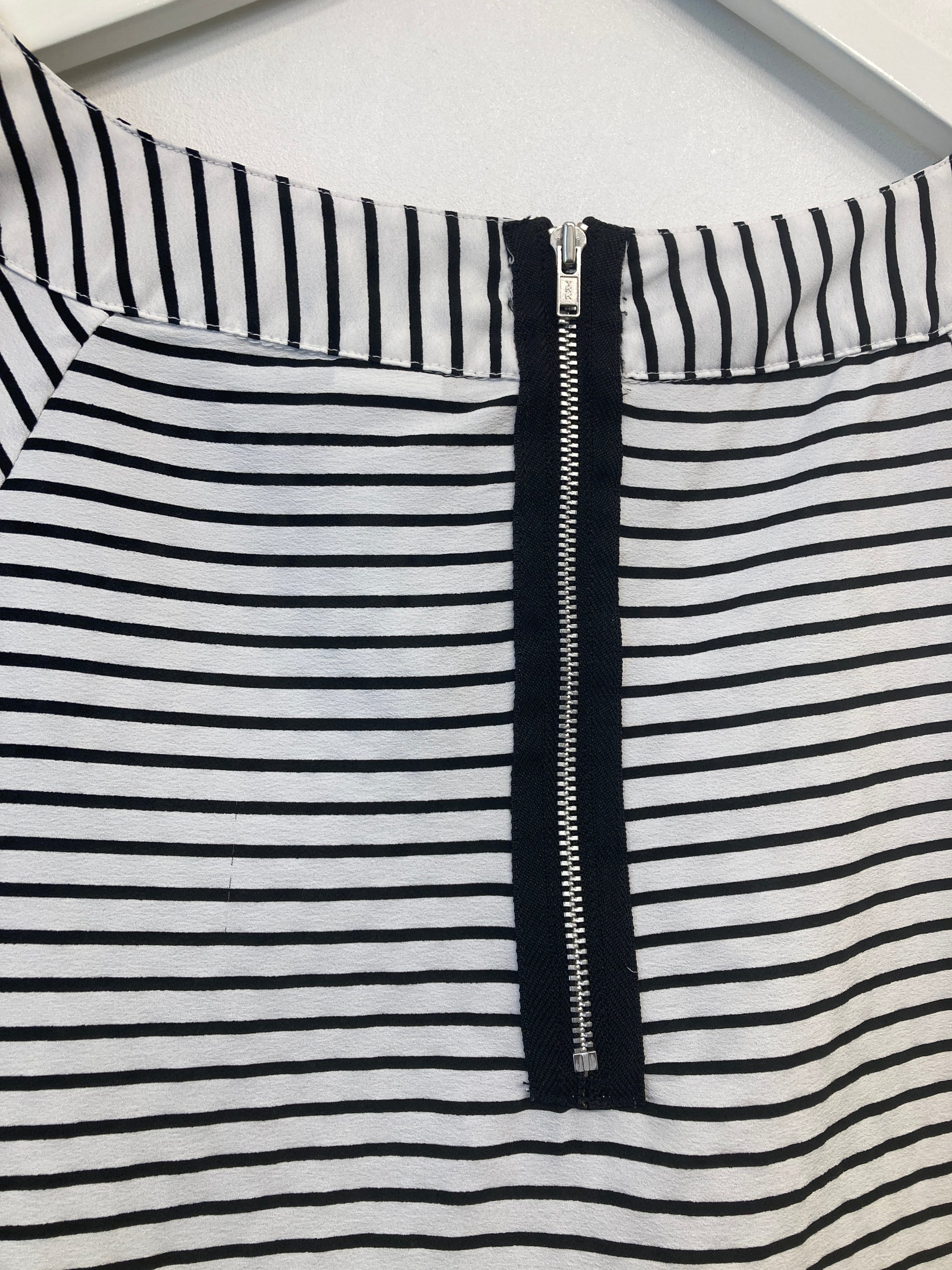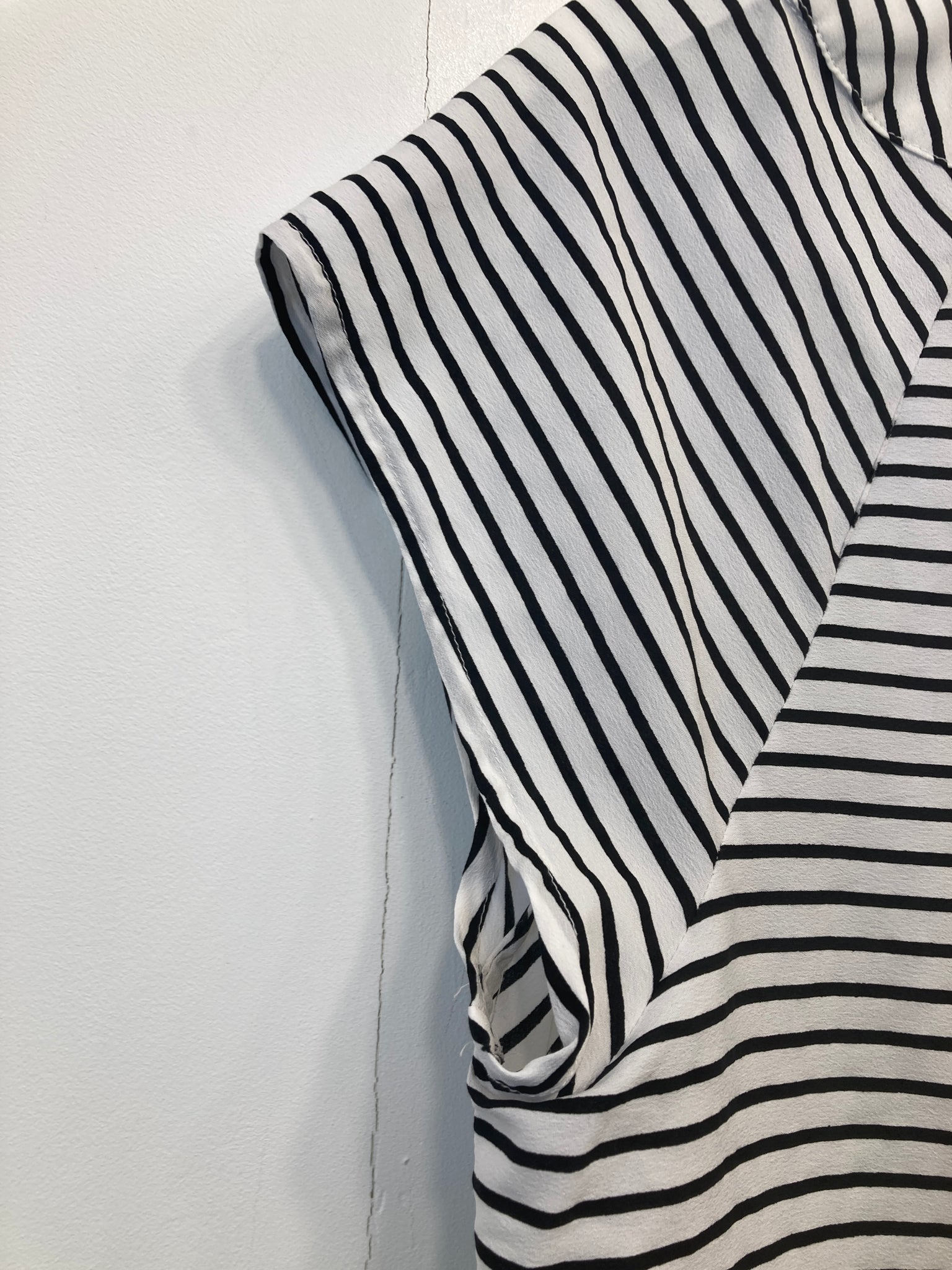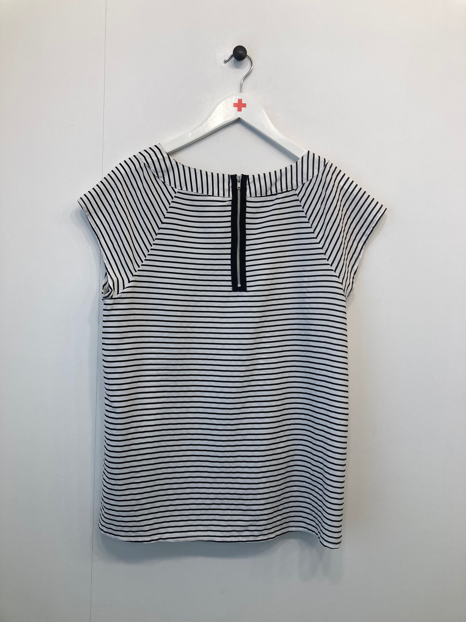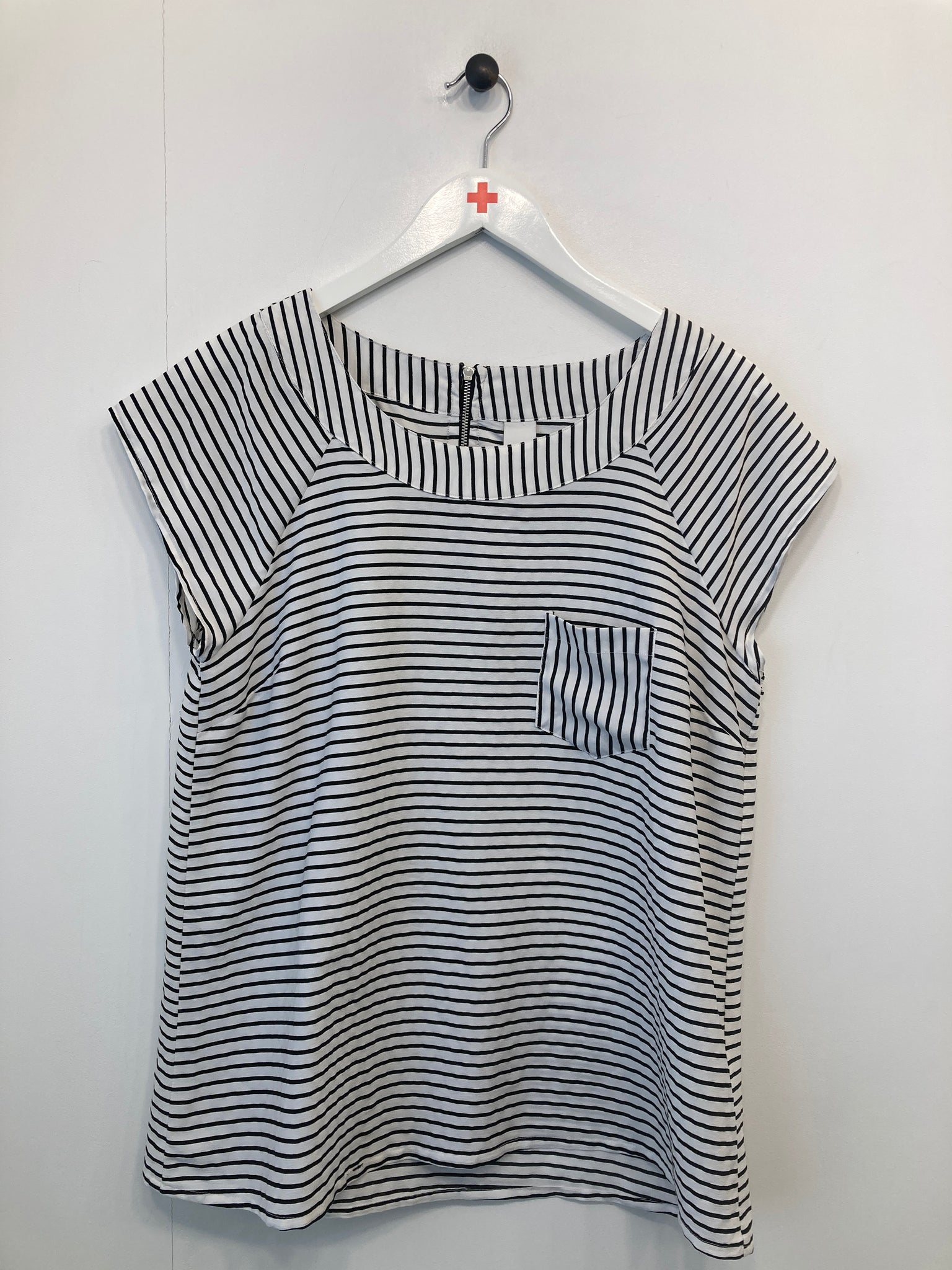 Bluse med rund hals og lynlås i nakken, et lille ærme og en enkelt brystlomme