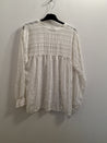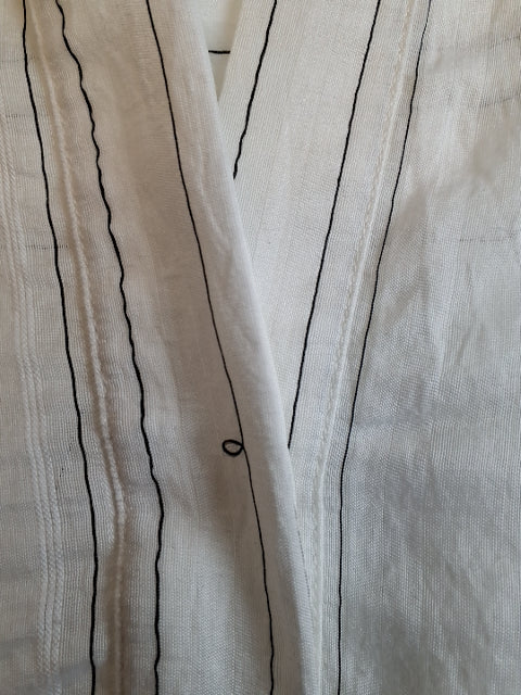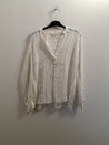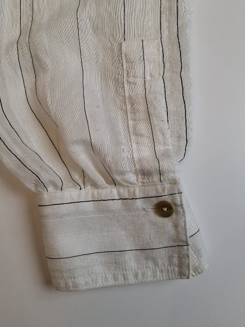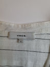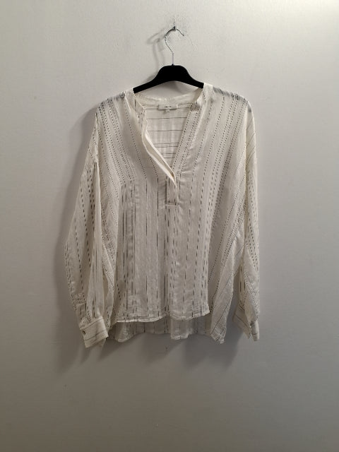 O344 Blusen har en løs pasform med striber og en dyb V-hals. Materialet er let.
