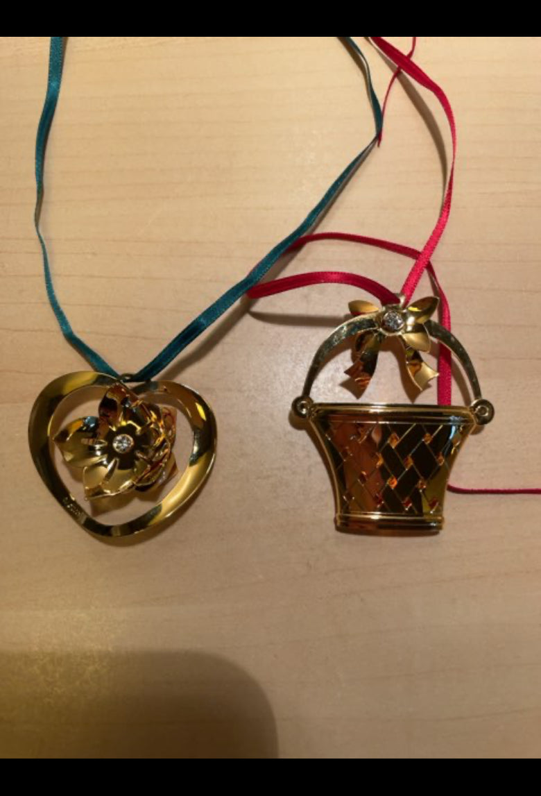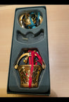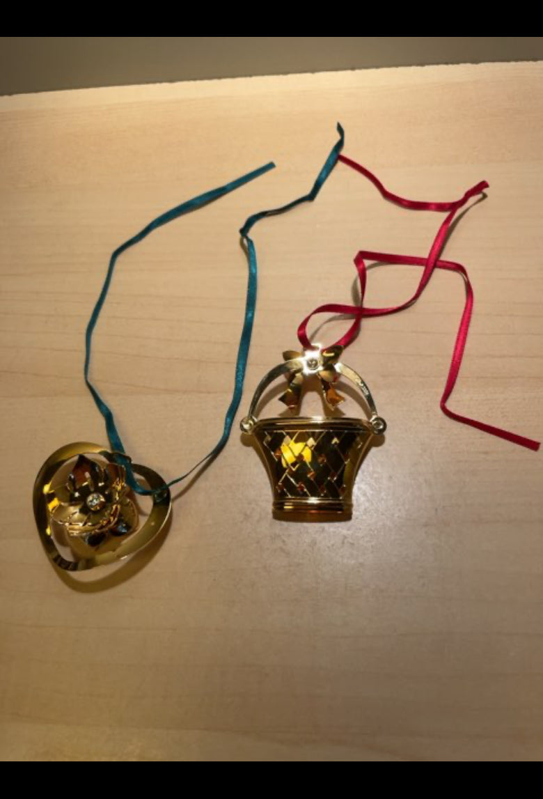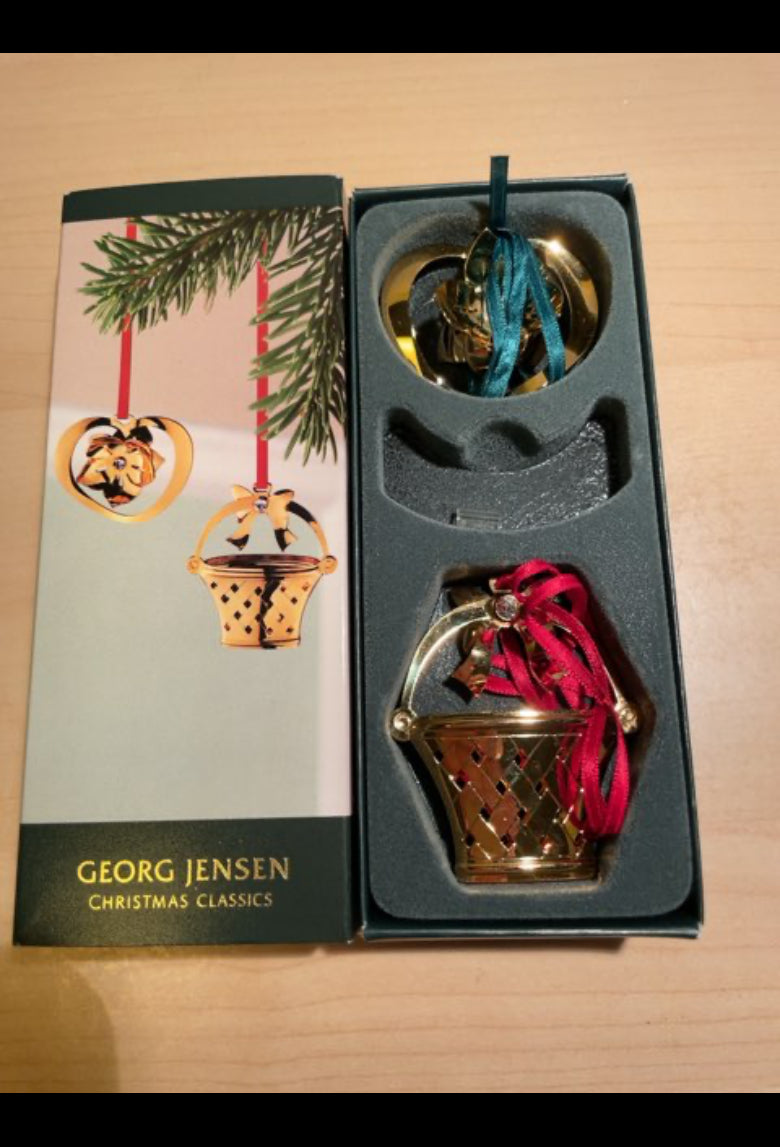 Produktet indeholder to julepynt i messing forgyldt med 24 karat guld. Det har detaljer i form af en kurv og er prydet med bånd i forskellige farver. Designet af Regitze Overgaard