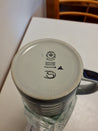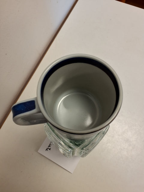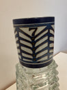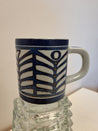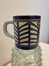 Koppen har et stilrent design med geometriske mønstre. Den er lavet af keramik.
