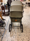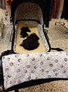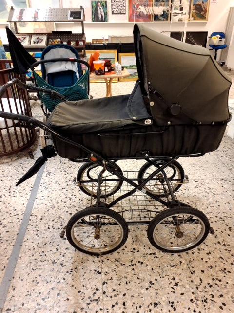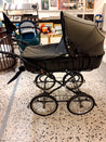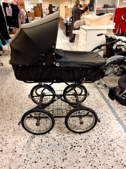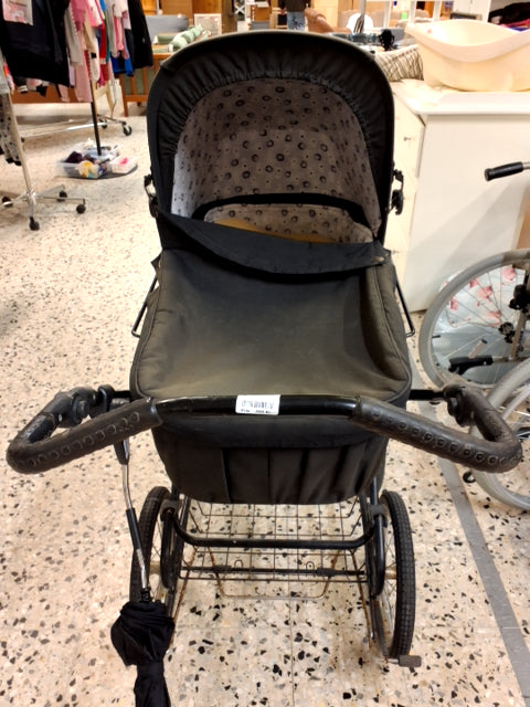 Barnevognen har en klassisk form med en polstret, sort kaleche og et mønstret indre. Den har et solidt metalstel og gummihåndtag.