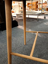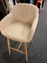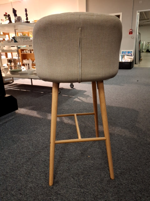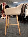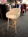 Barstolen har polstret sæde med ribbede detaljer og træben.