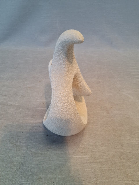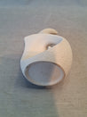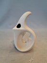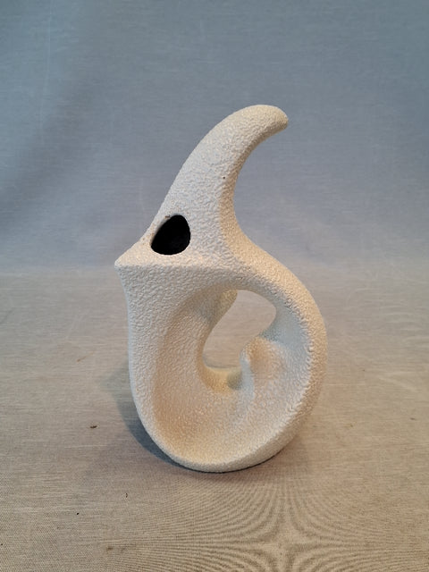 Produktet er en skulpturel vase med en glat, struktureret overflade og et unikt, væsket design. Den er fremstillet af keramik og har en hul åbning, der giver mulighed for blomsterarrangementer. Hovedsagelig farve er hvid.