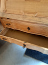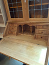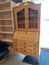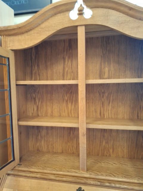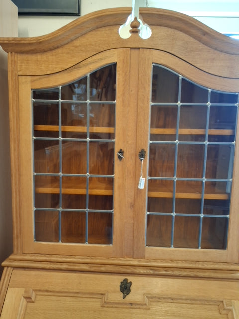 Møblet er en klassisk skrivekommode i lys træ med blyindfattede låger og detaljerede håndtag. Gulvstående. Kommode og overskab kan skilles ad. Der medfølger nøgle, skriveplade og de 3 skuffer i kommoden kan låses.