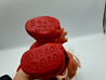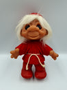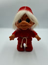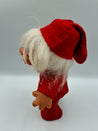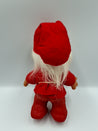 Dukken har bløde detaljer og et grinsende ansigt. Den er iført rød beklædning og har hvidt hår. Røde bukser År 1980 No.24-4