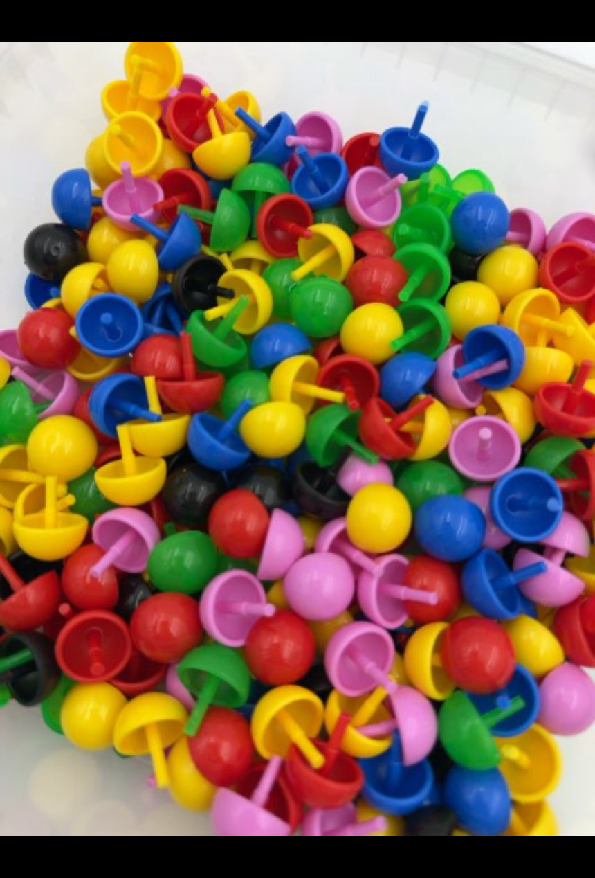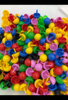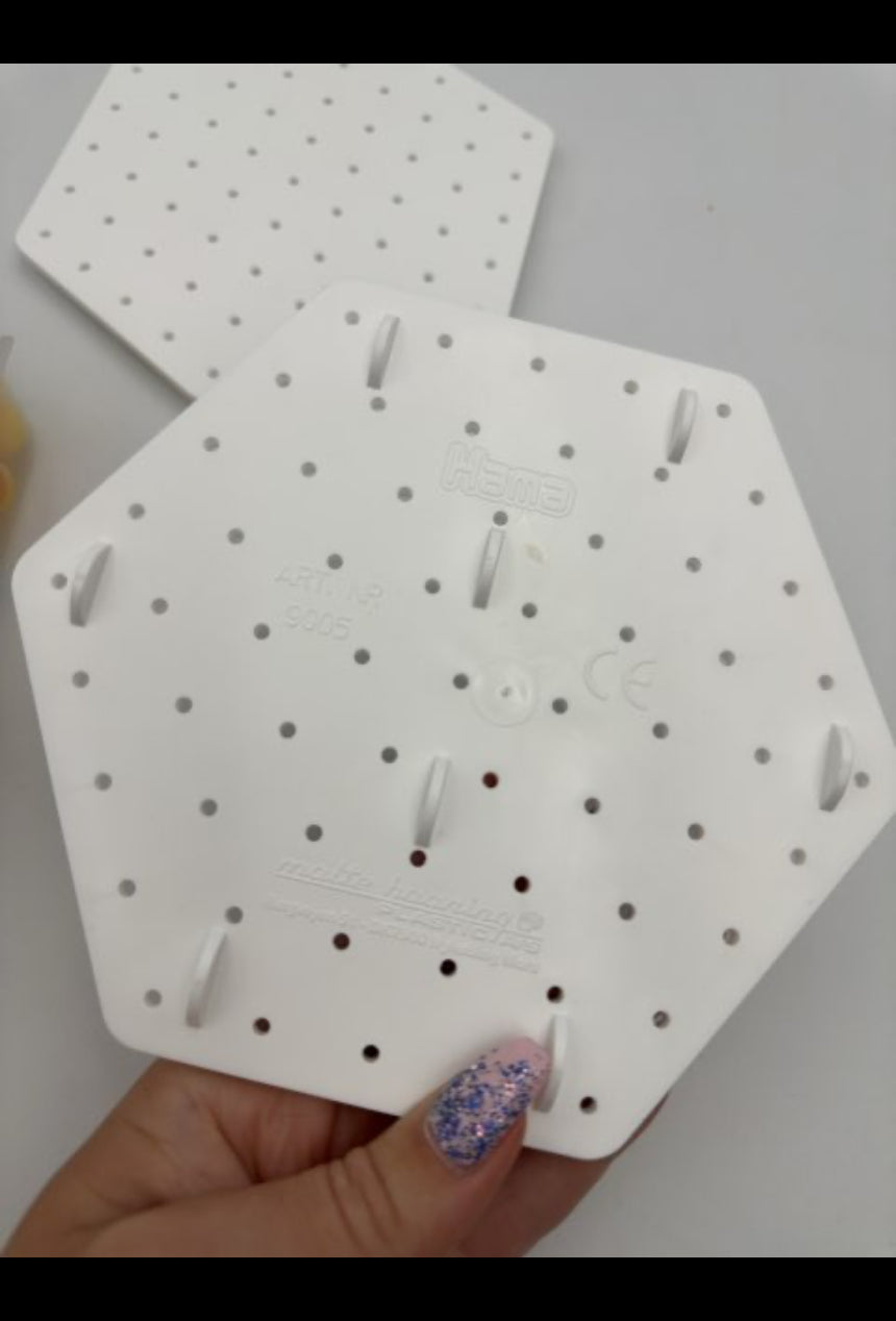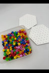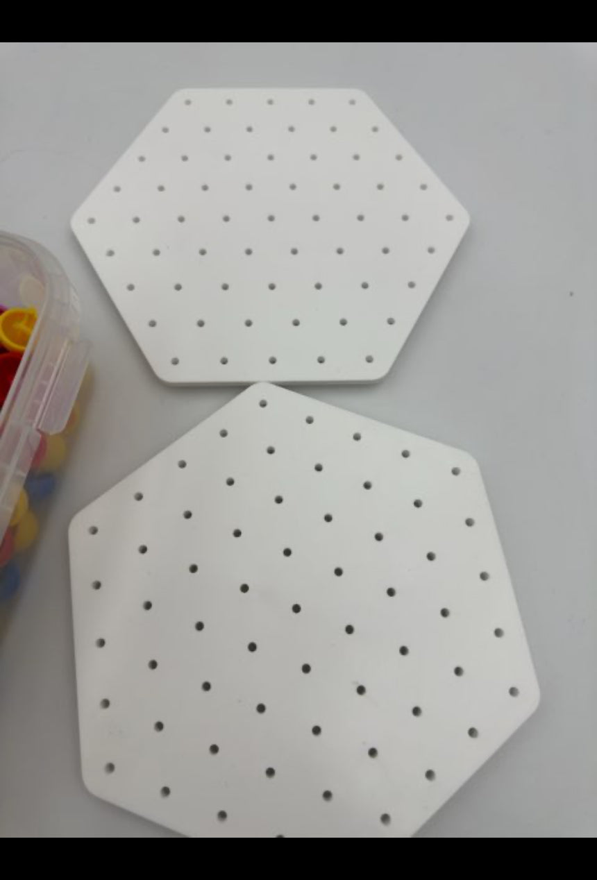 Produktet består af farverige plastikker, der kan stikkes ind i hulmønstre på hexagonale plader.