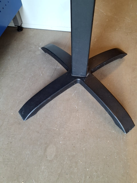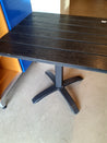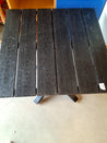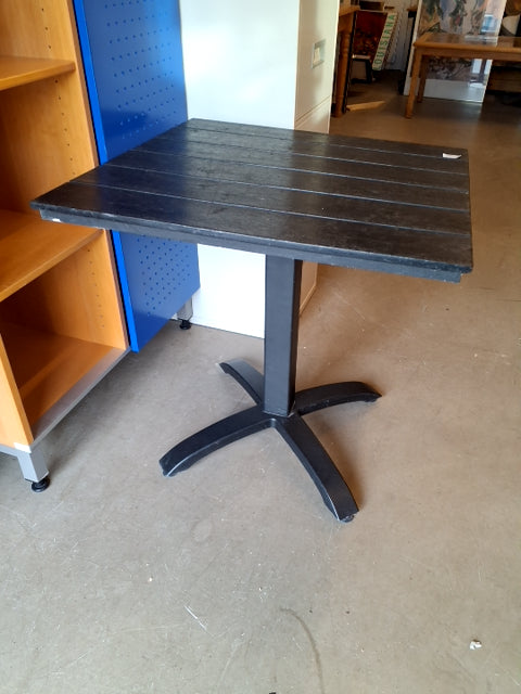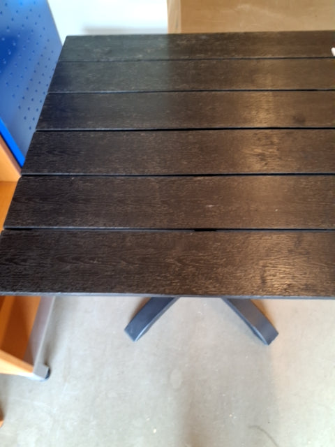 Bordet har en firkantet plade med lameller, sort farve og en robust, moderne basis med fire ben. Velegnet til terrasse eller altan.