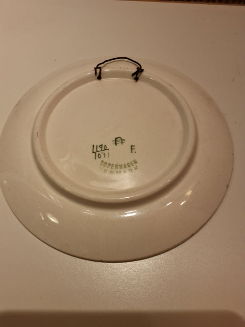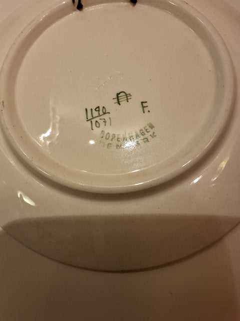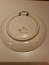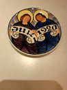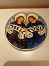Platten er rund med farverige blomsterdesign og indgraveret