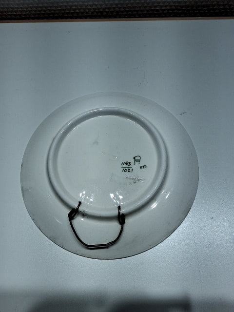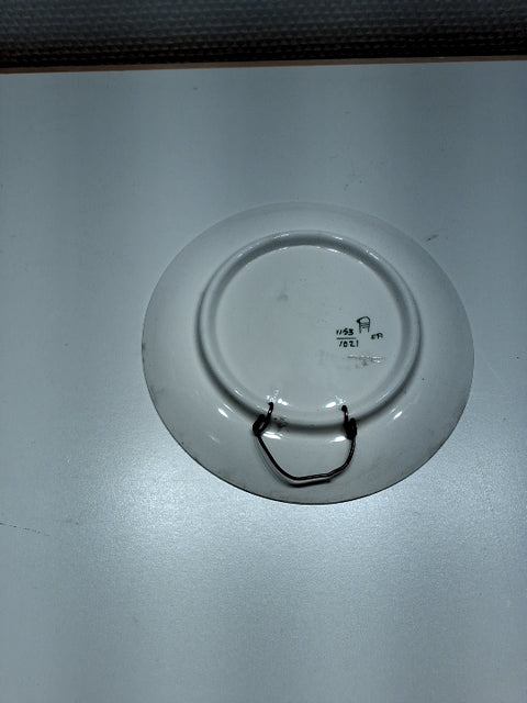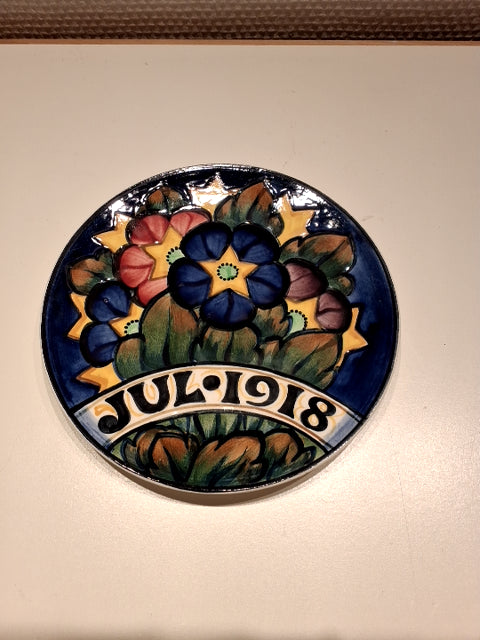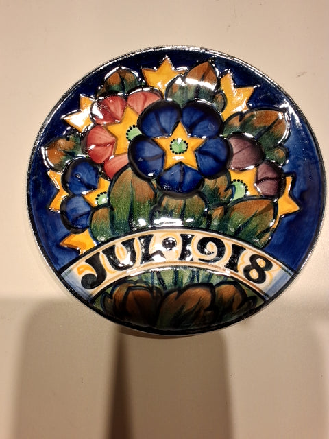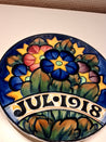 Fajance/Aluminia Platten er rund med farverige blomsterdesign og indgraveret årstal. 1918