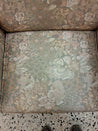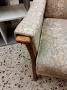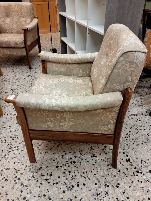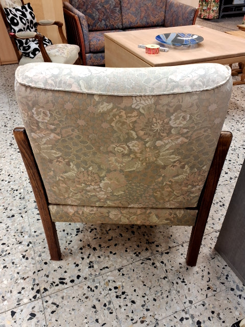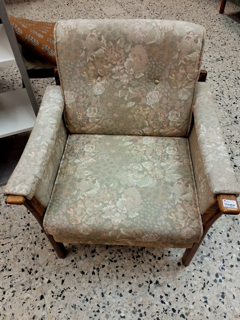 Stolen har en polstret sæde- og rygdel med blomsterdesign, træramme og armstøtter.