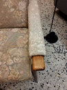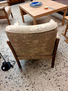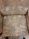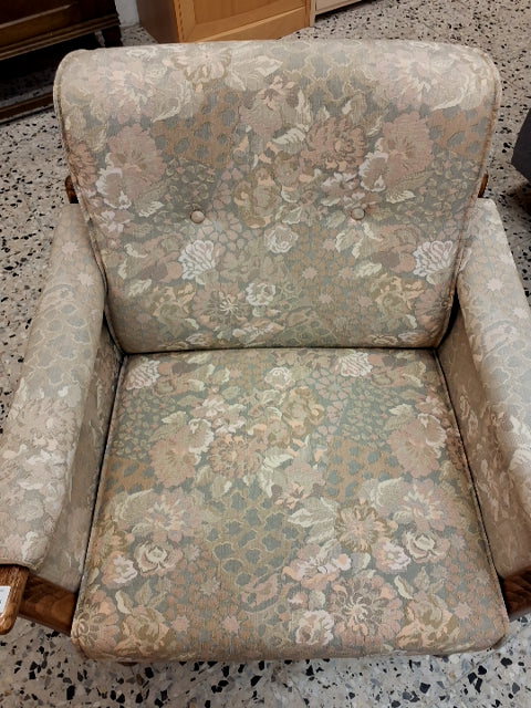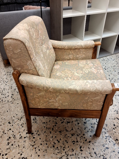 Stolen har et blødt, mønstret betræk med blomsterdesign. Trædetaljer på armene.